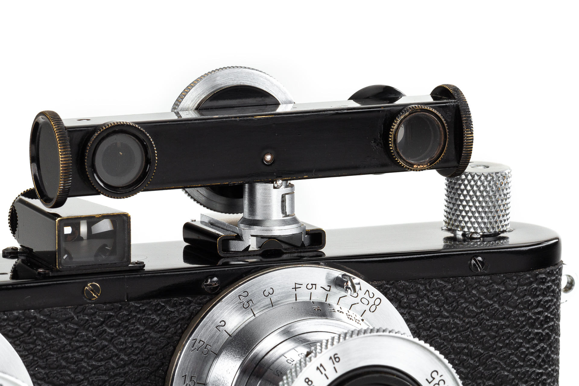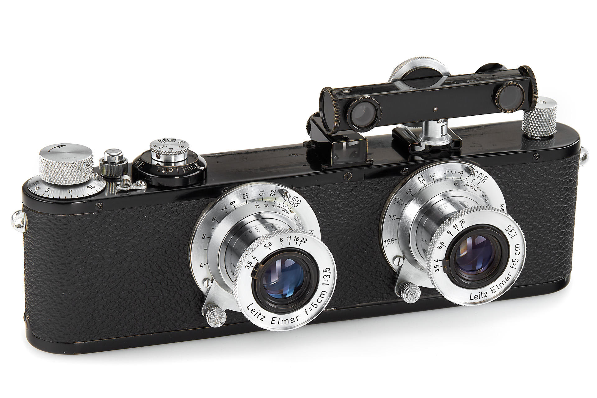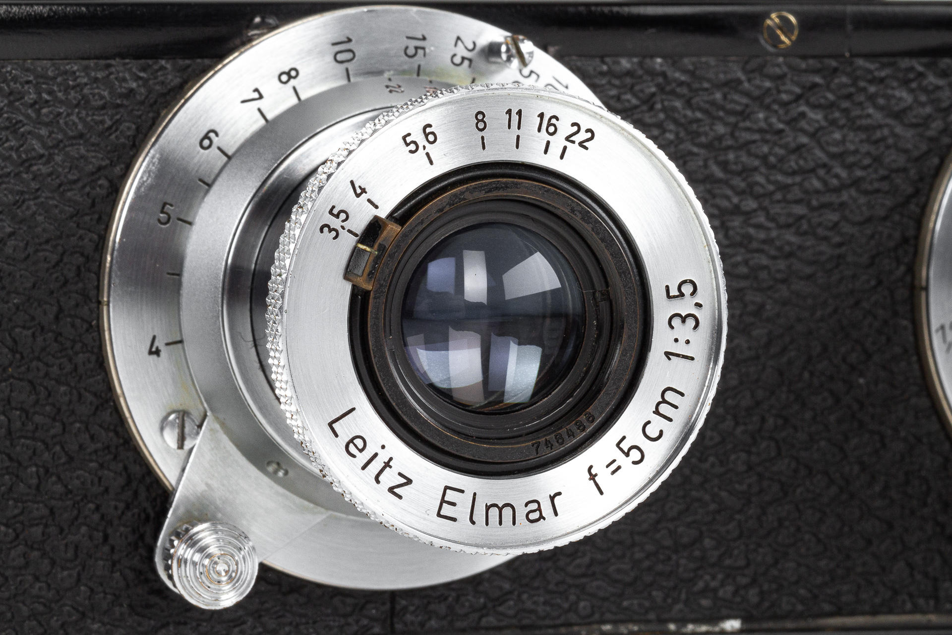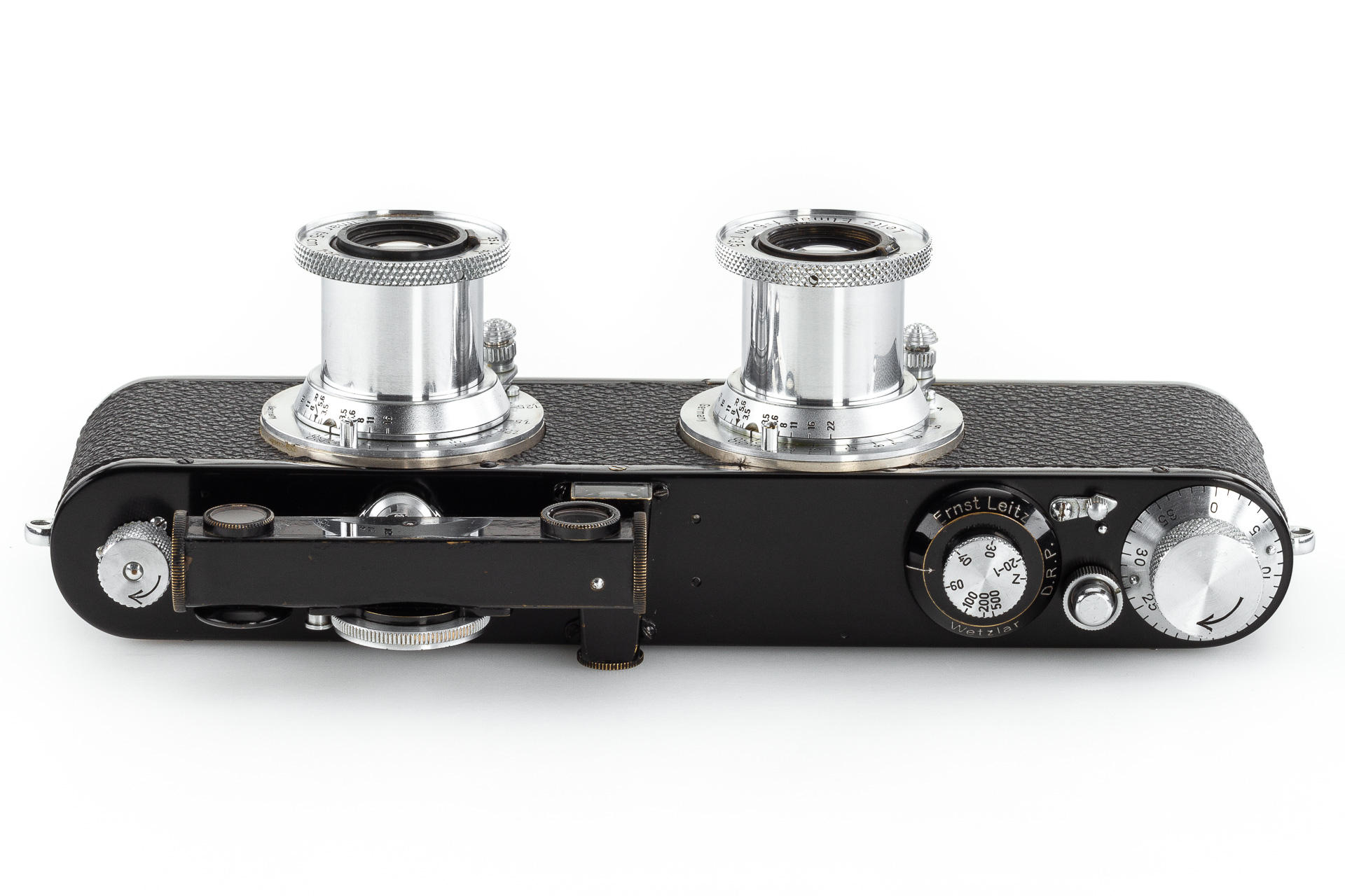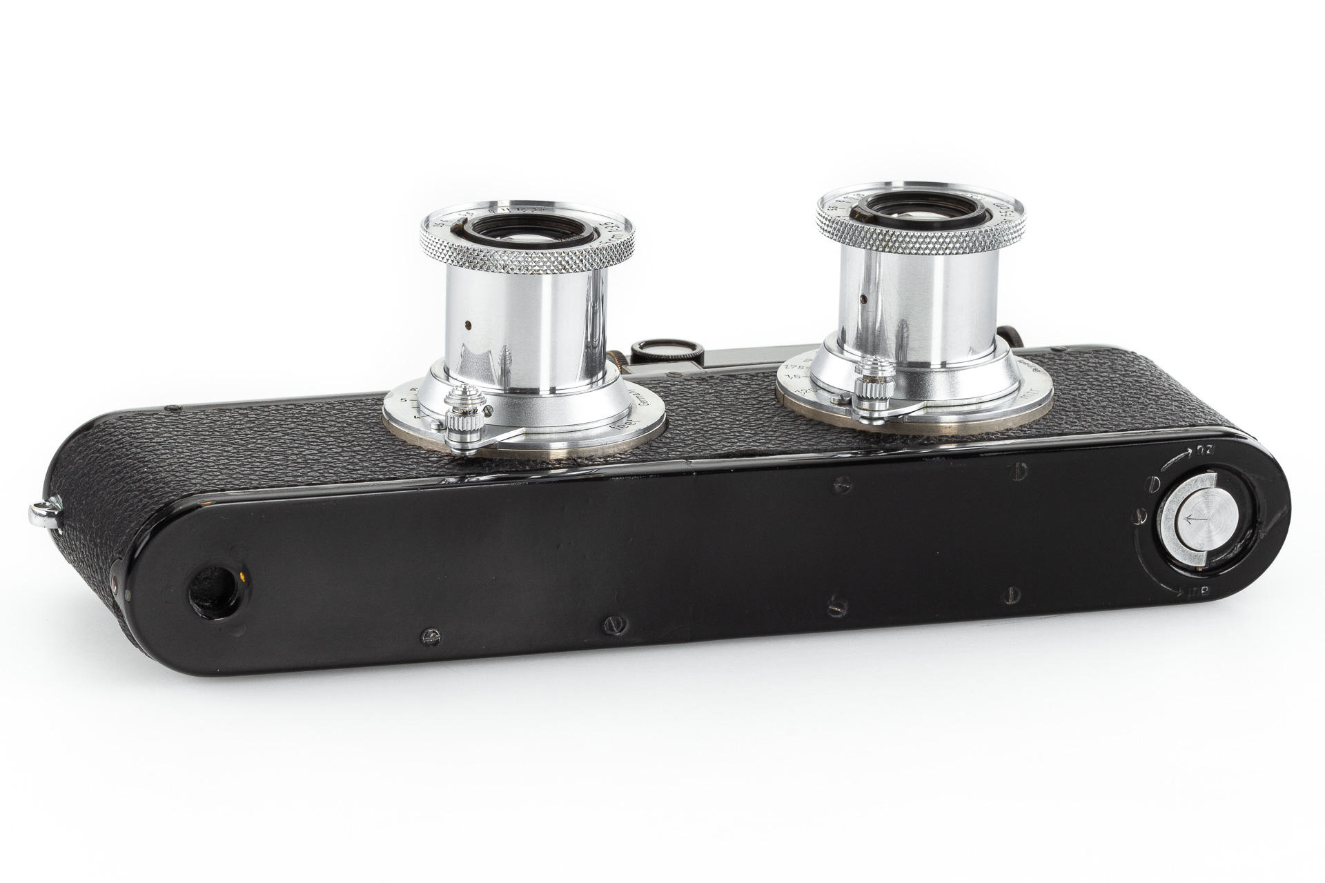 non working copy of the famous Stereo-Leica by Oskar Barnack with two chrome Elmar 3.5/5cm lenses no.748488/631469 (both with front cap) and HFOOK rangefinder (black/chrome, feet scale)