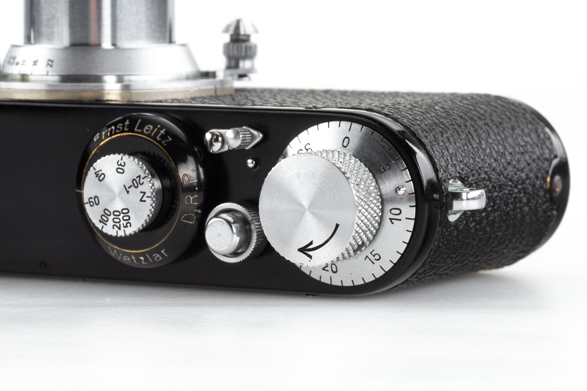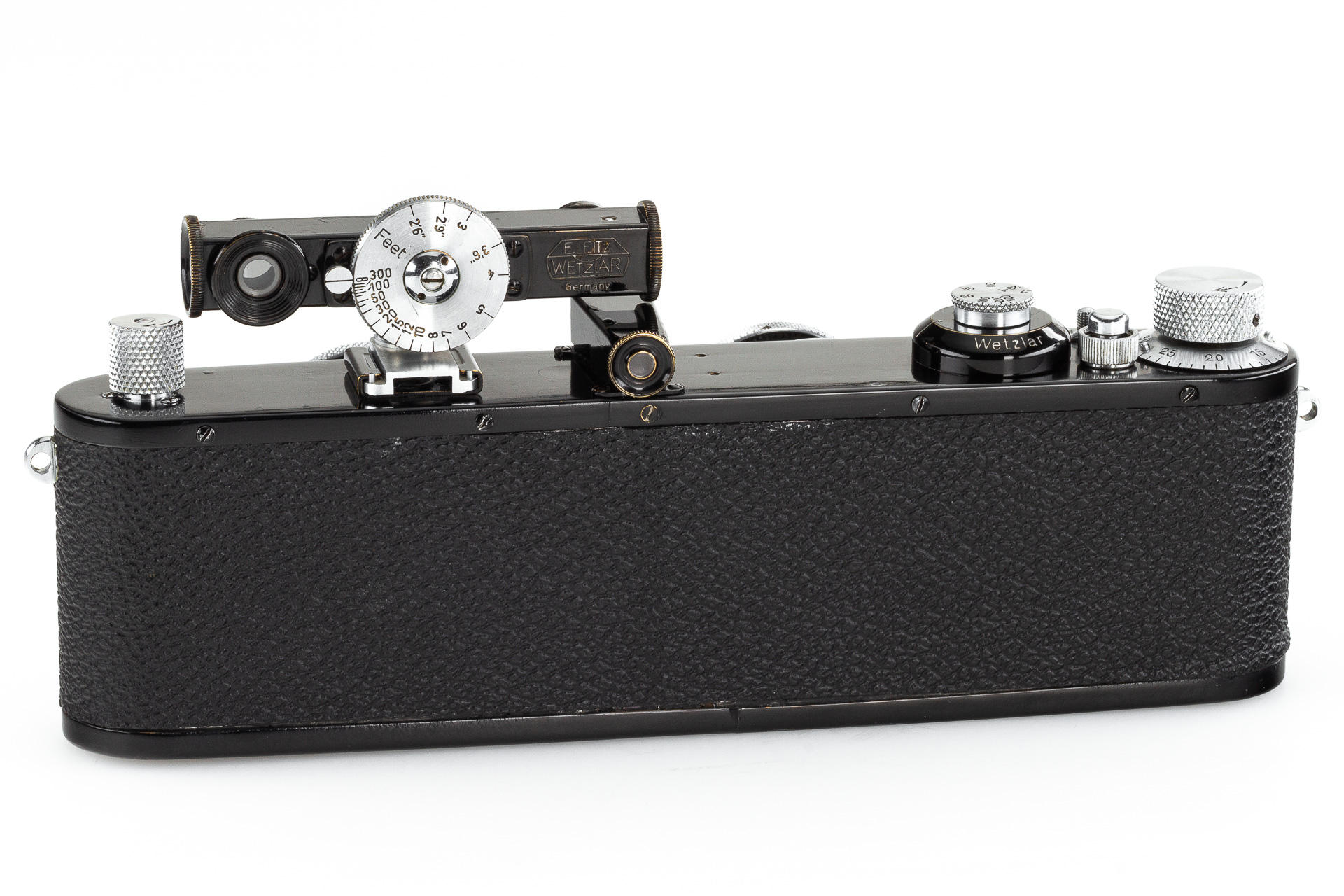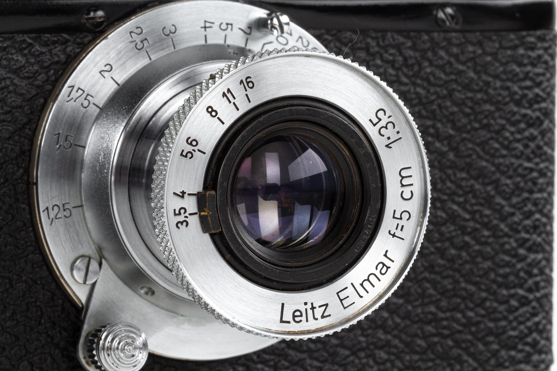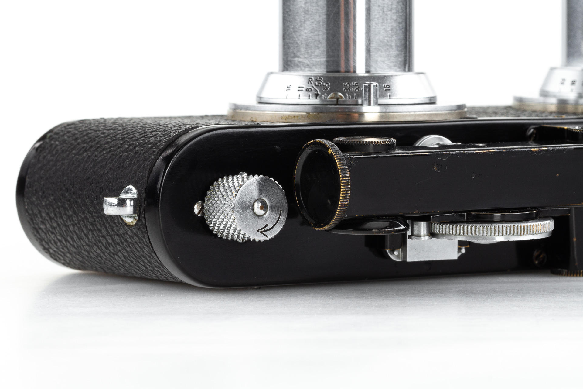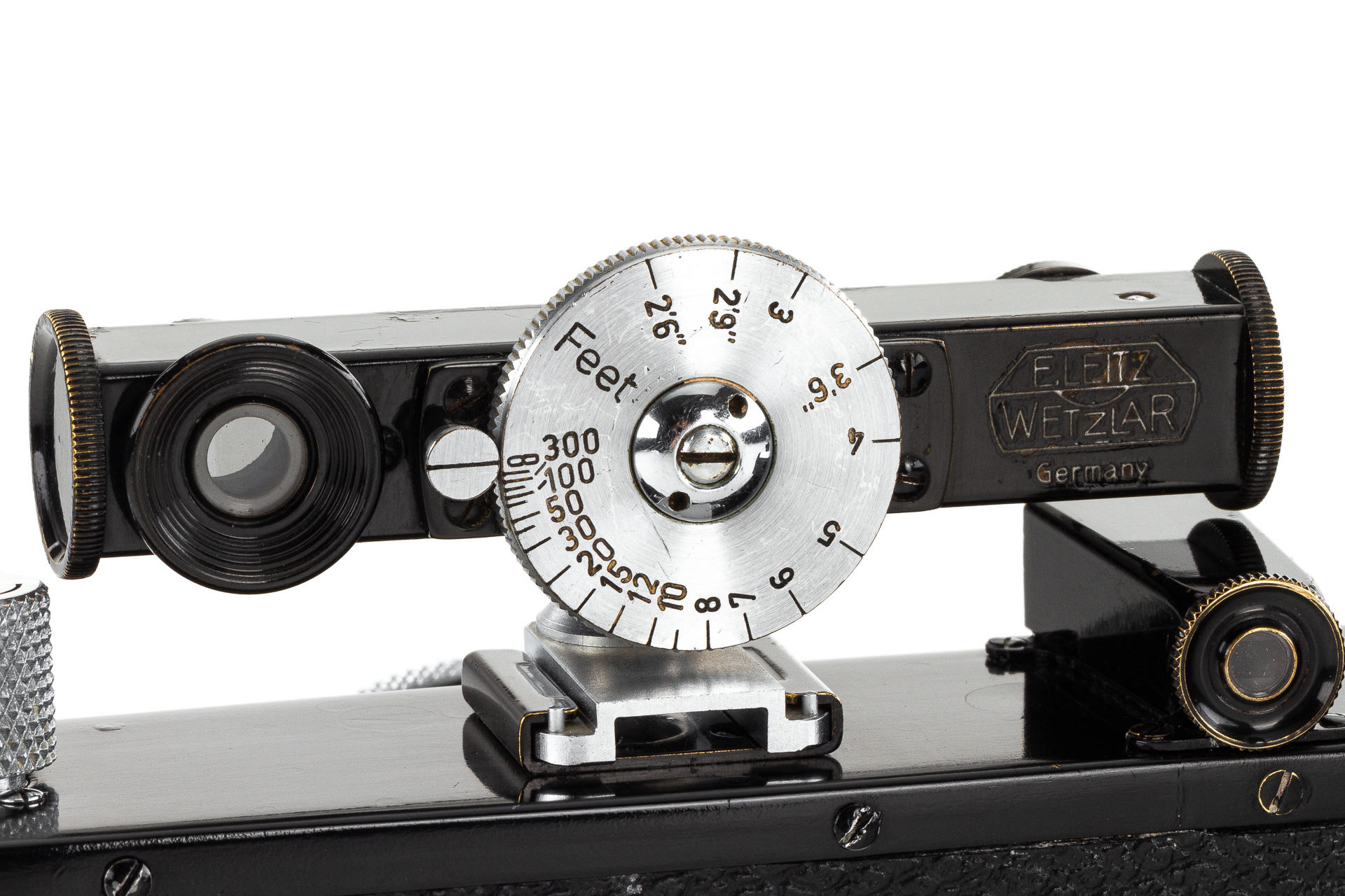 non working copy of the famous Stereo-Leica by Oskar Barnack with two chrome Elmar 3.5/5cm lenses no.748488/631469 (both with front cap) and HFOOK rangefinder (black/chrome, feet scale)