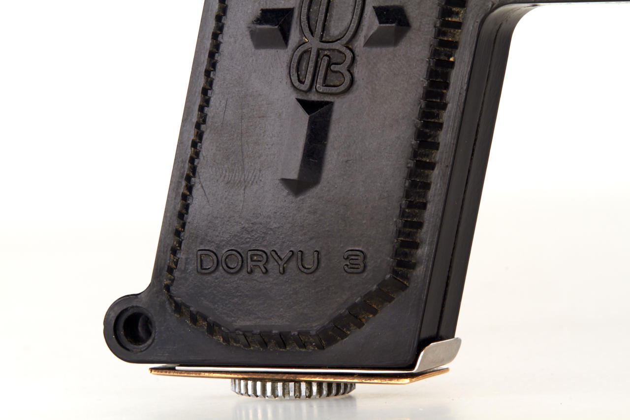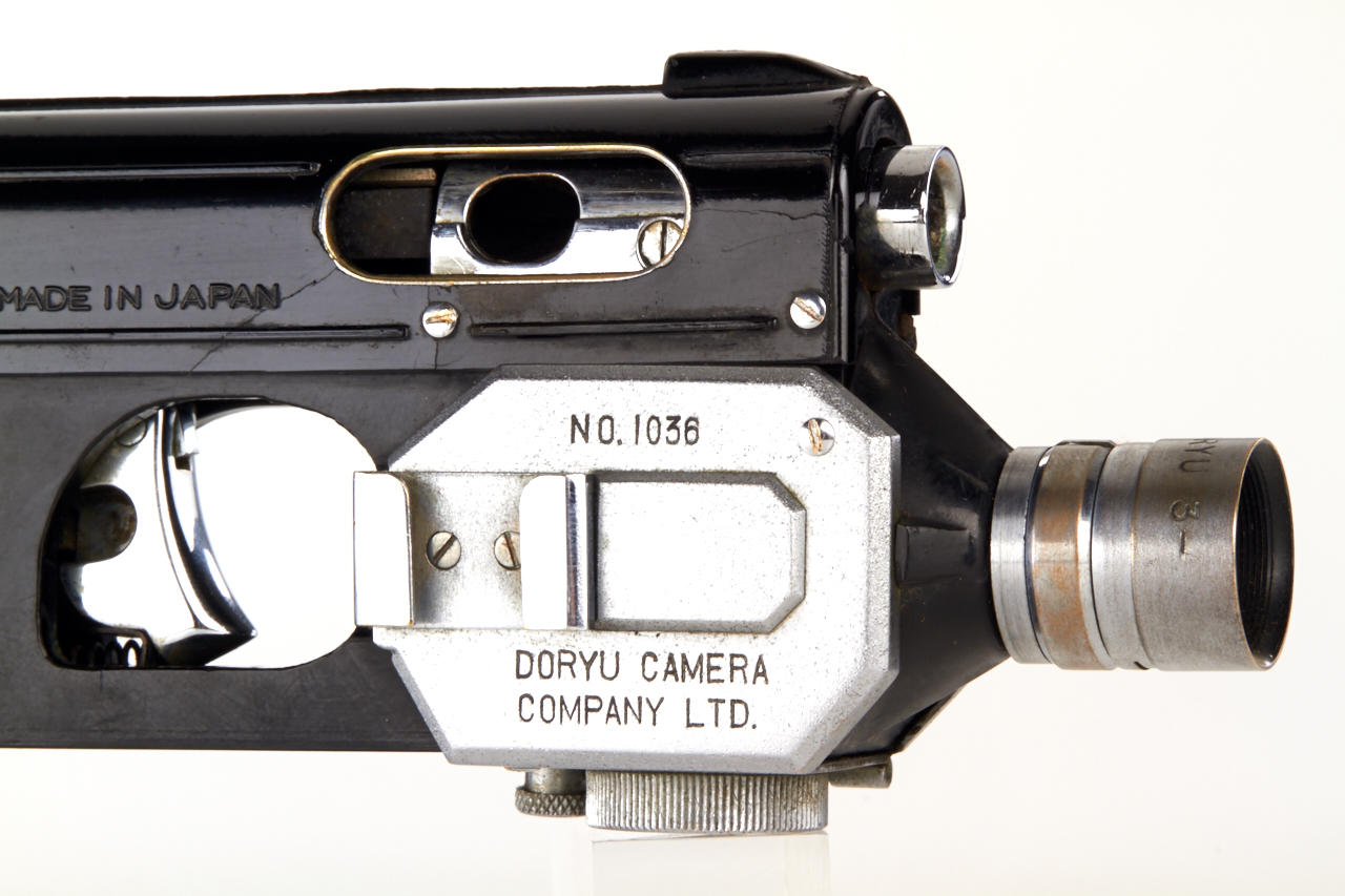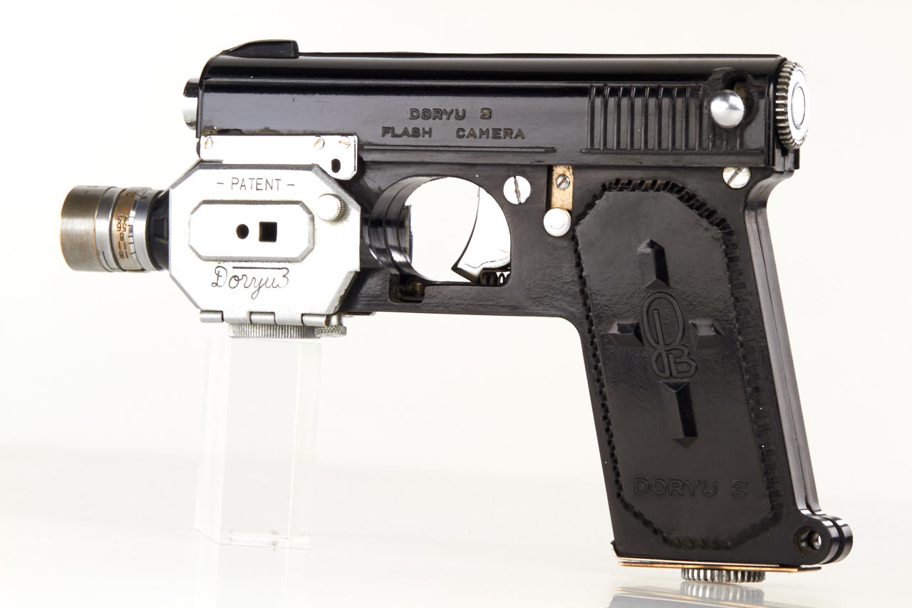 The only known example of the Doryu 1 pistol camera (known as well as Doryu 1-9.5), completed at prototype-level by the Doryu Company in 1952, interesting is that the camera itself bears markings identifying it as 'Doryu 3'. Because of durability problems of the Bakelite body and small availability of the 9,5mm film in Japan, the camera never went in production and was replaced in the same year (1952) for the Doryu 2-16. The camera is in very good, original condition, with working shutter, removable magazine, Doryu 3 3,3/23mm lens with hood, original leather case