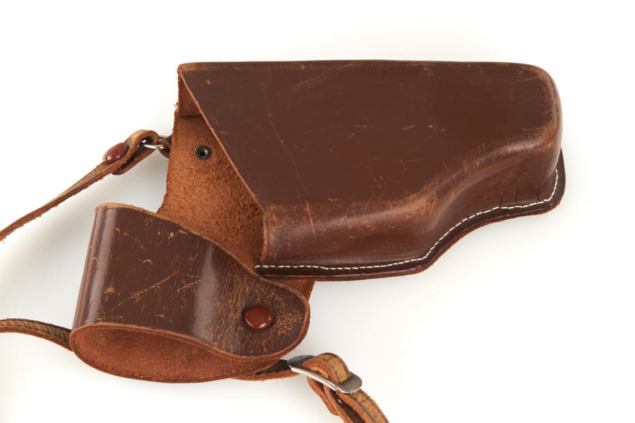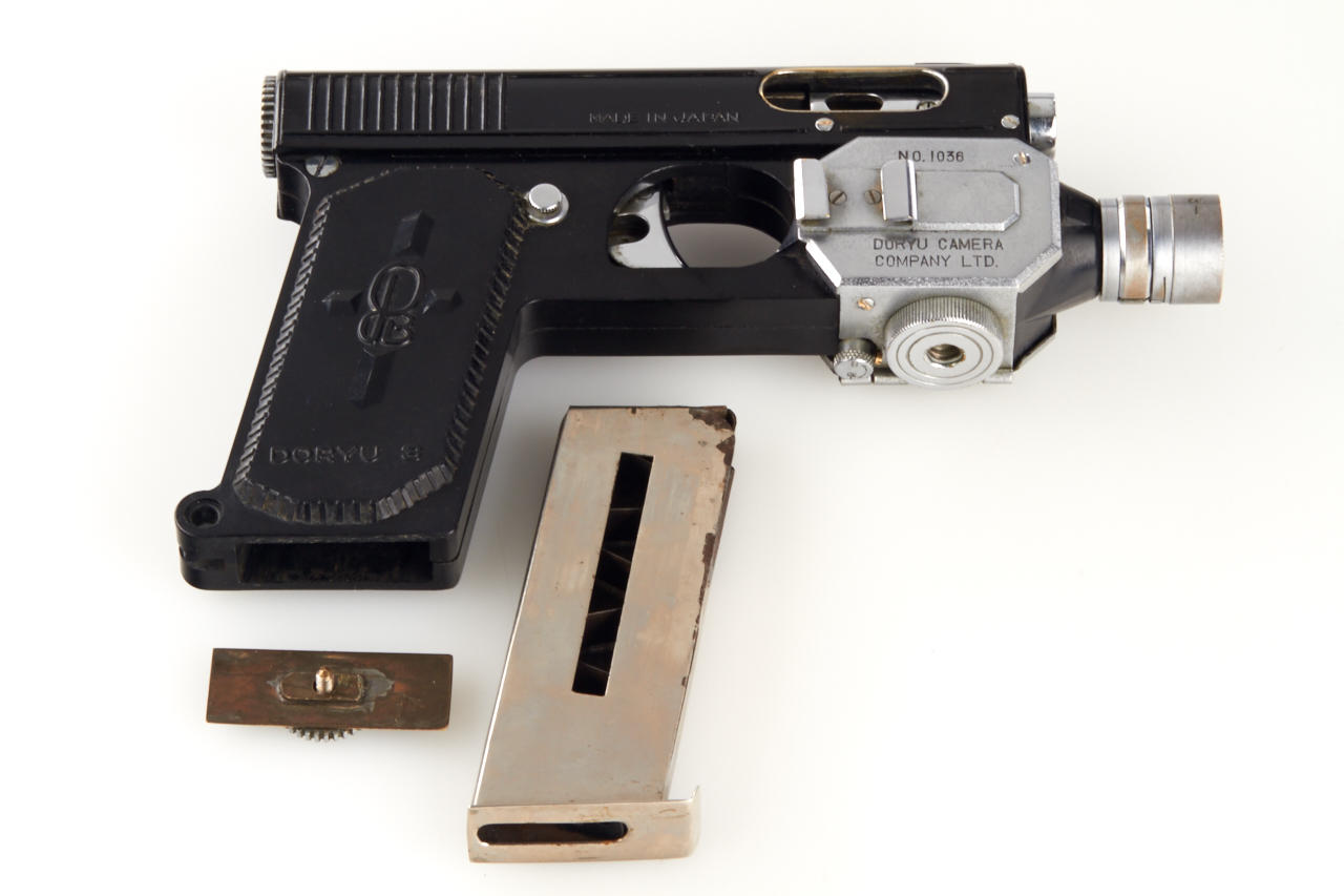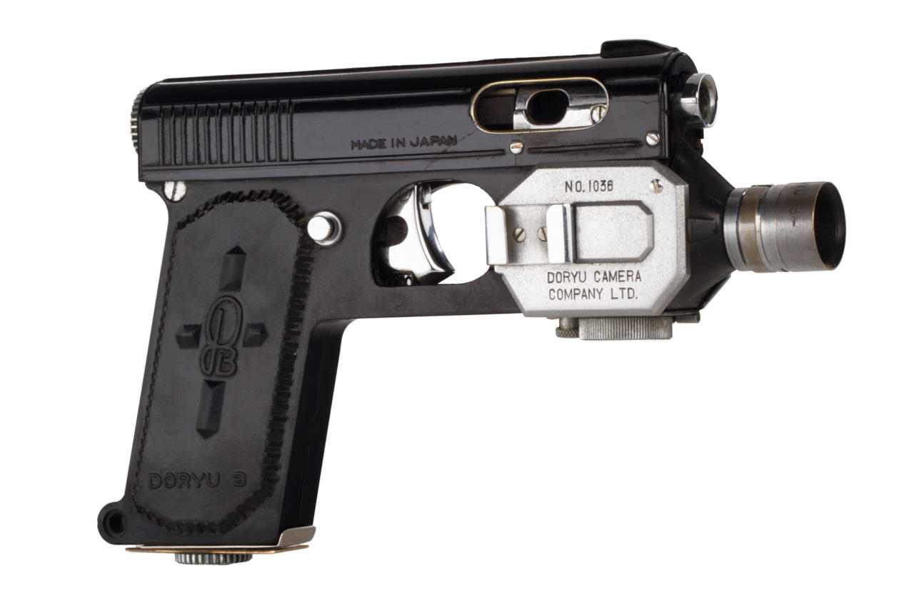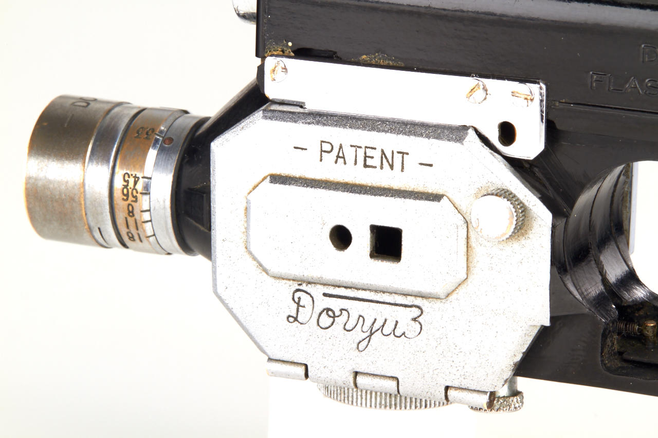The only known example of the Doryu 1 pistol camera (known as well as Doryu 1-9.5), completed at prototype-level by the Doryu Company in 1952, interesting is that the camera itself bears markings identifying it as 'Doryu 3'. Because of durability problems of the Bakelite body and small availability of the 9,5mm film in Japan, the camera never went in production and was replaced in the same year (1952) for the Doryu 2-16. The camera is in very good, original condition, with working shutter, removable magazine, Doryu 3 3,3/23mm lens with hood, original leather case