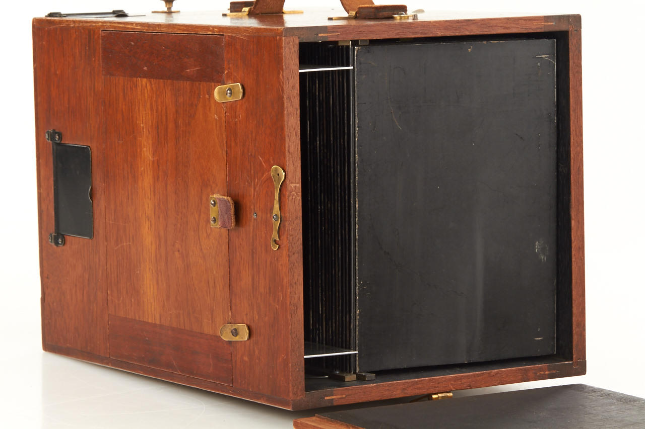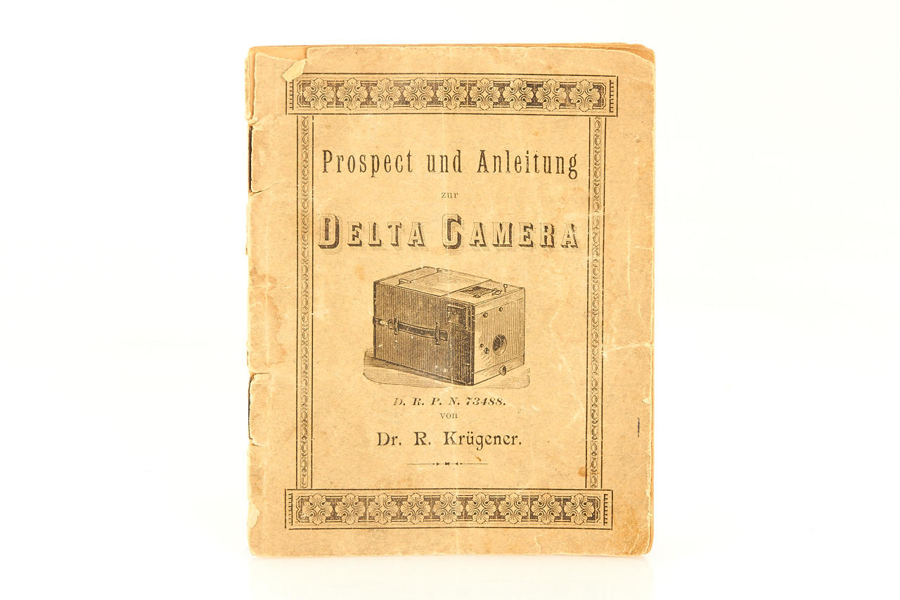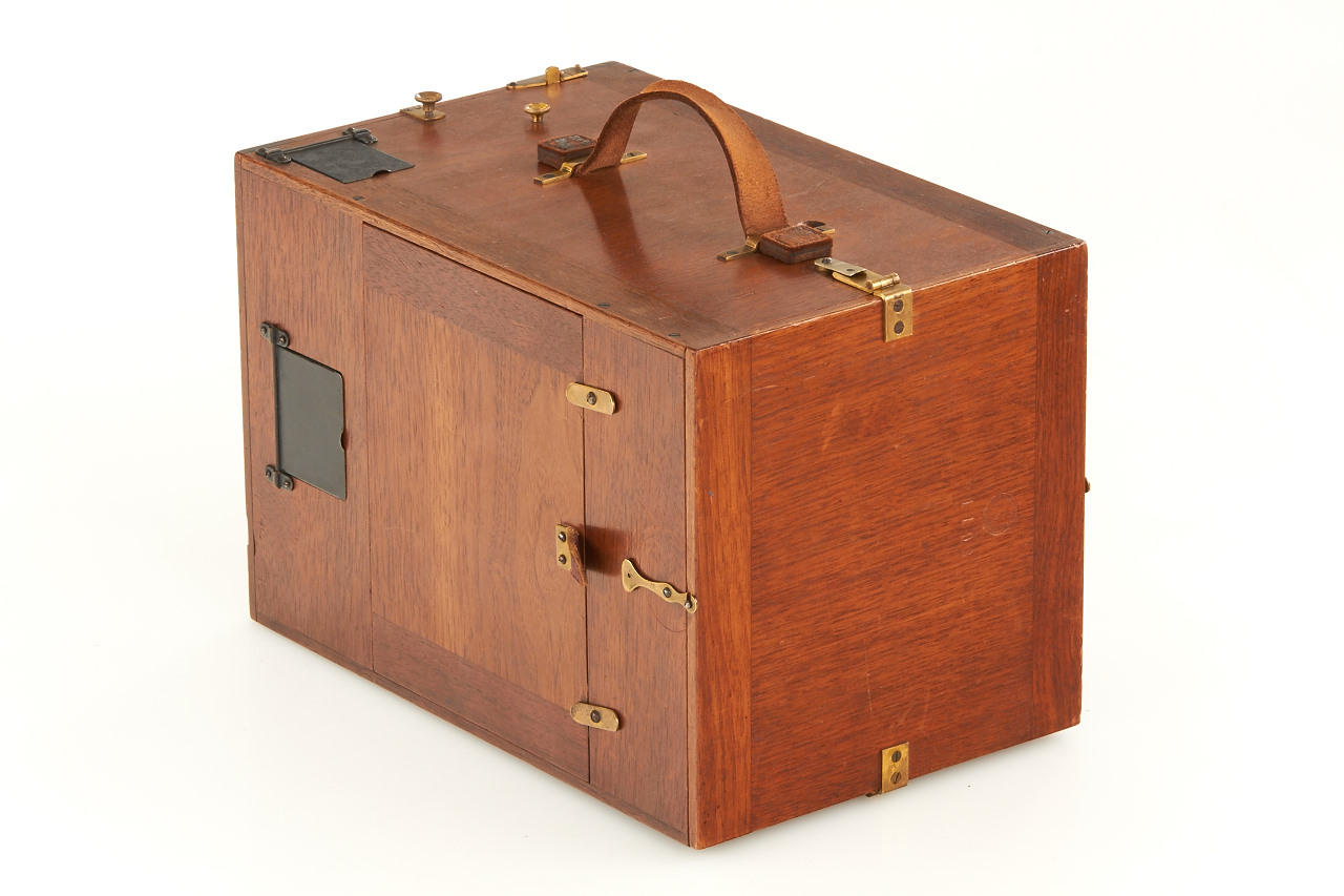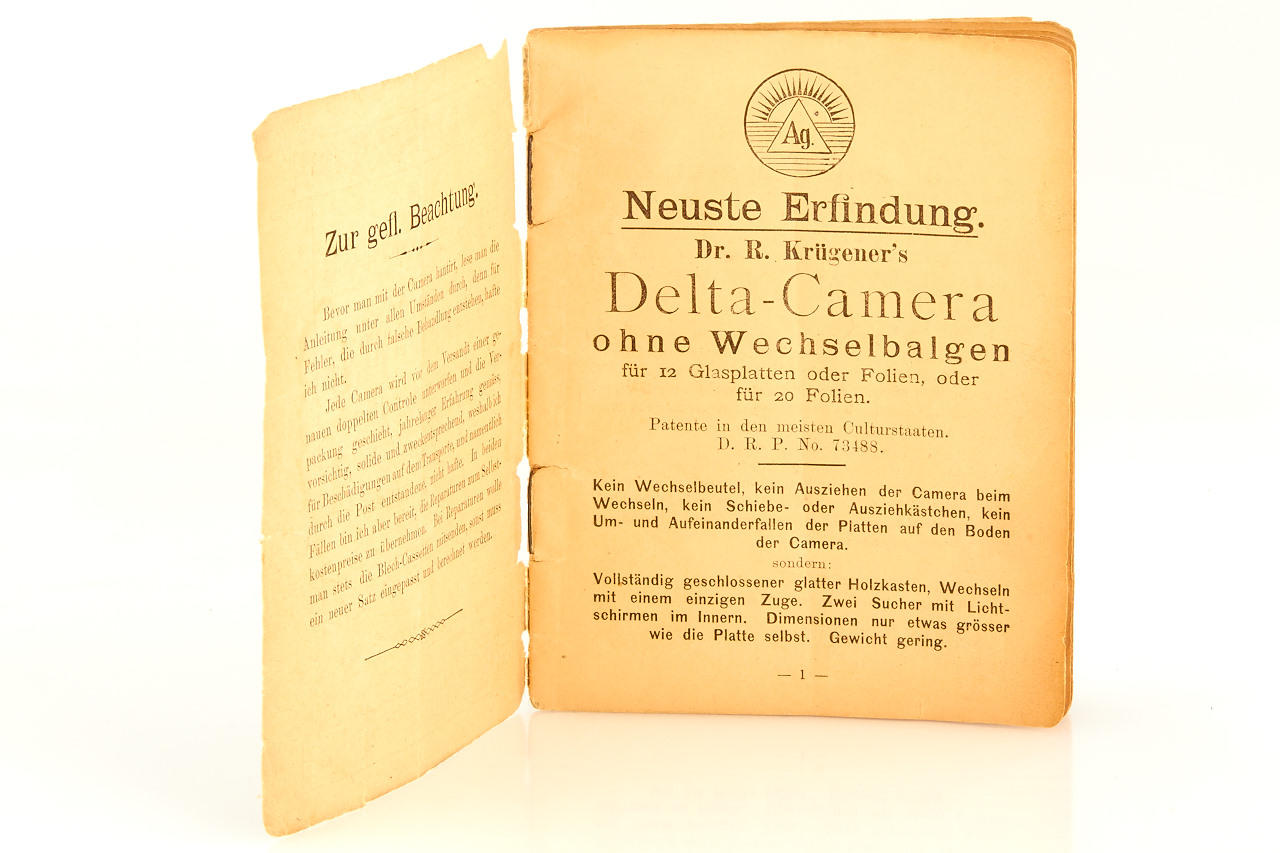 rare early version for large format 12x16cm plates, polished wooden body in excellent condition, working shutter, with very rare original instruction booklet in German