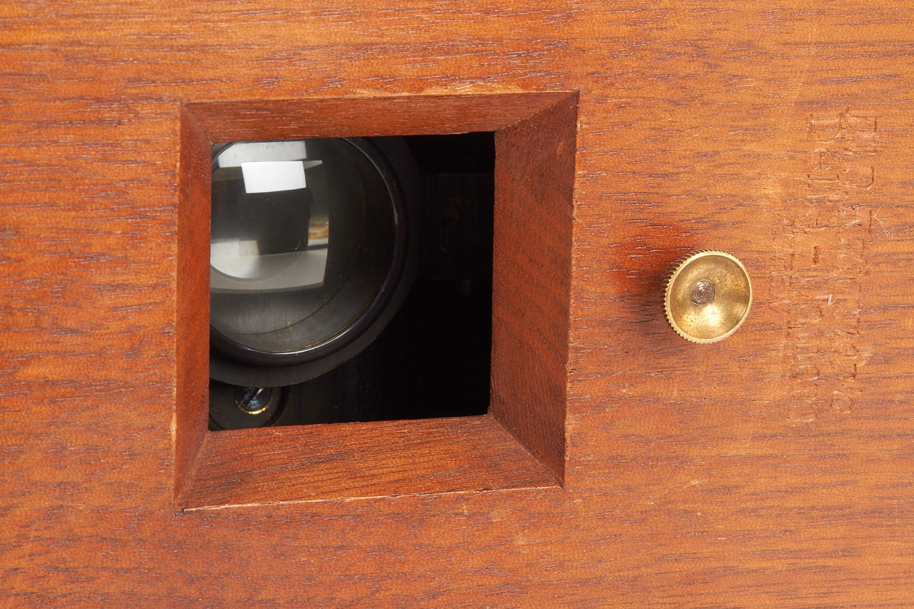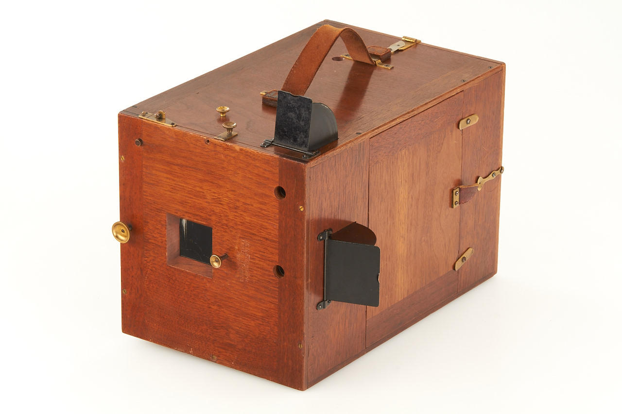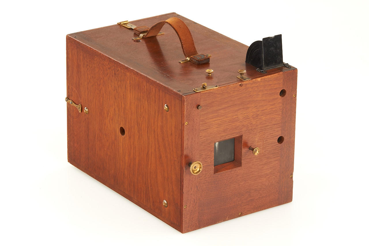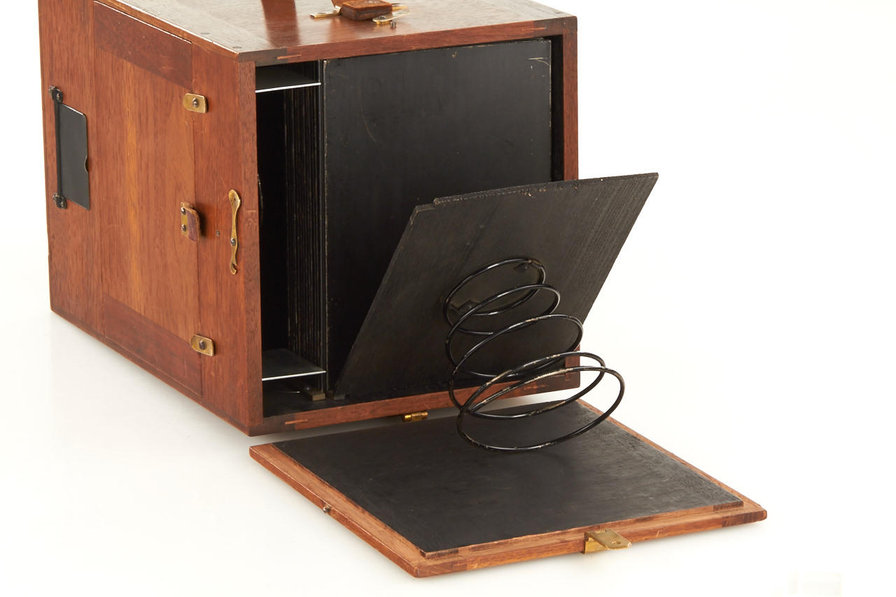 rare early version for large format 12x16cm plates, polished wooden body in excellent condition, working shutter, with very rare original instruction booklet in German