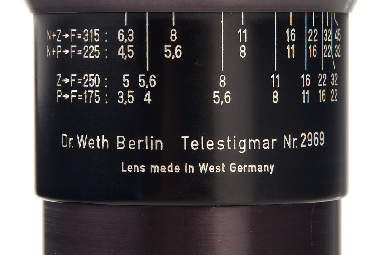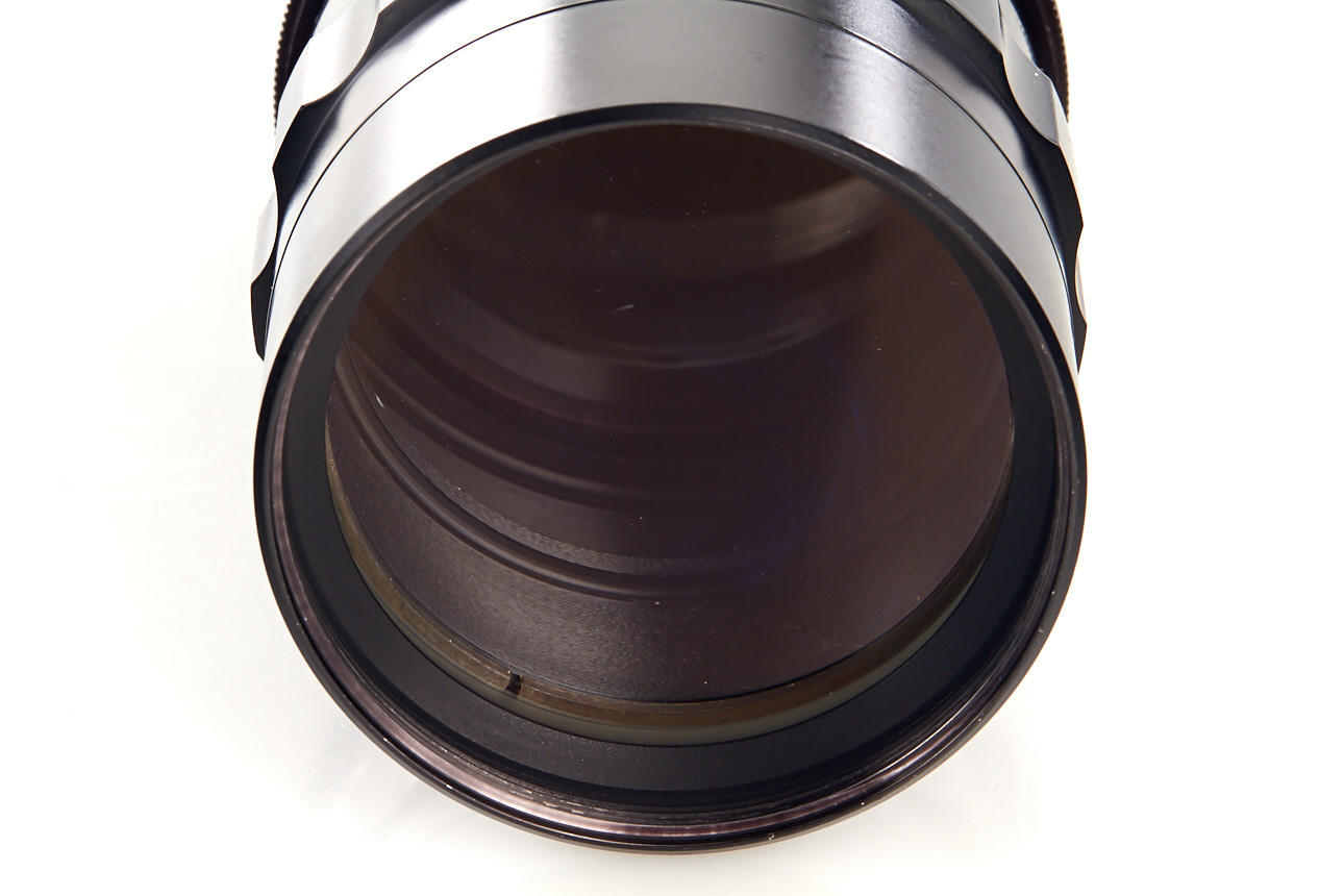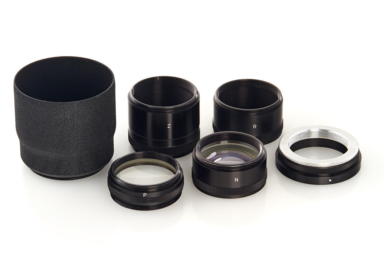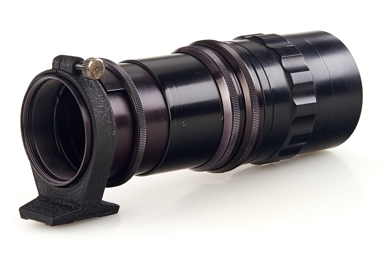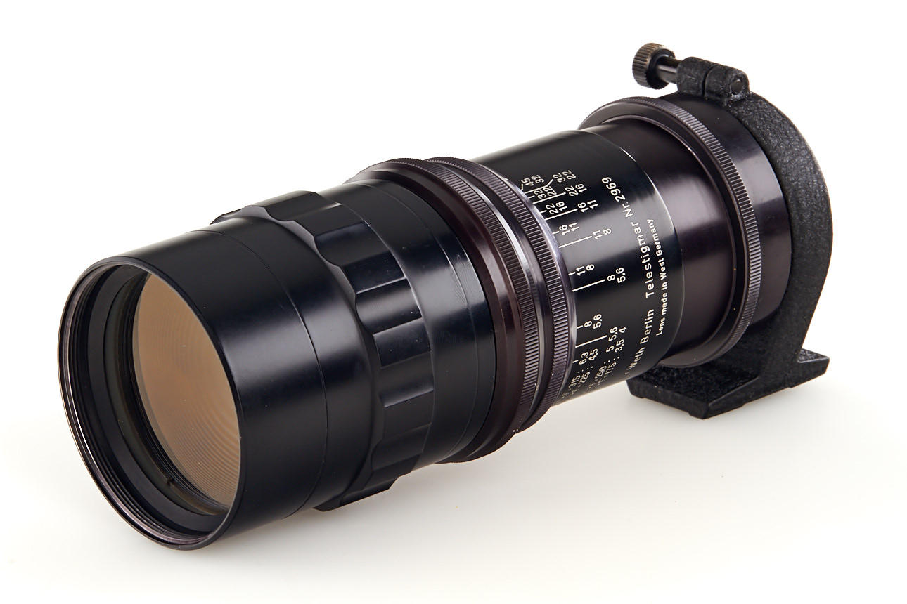 rare pre-set telephoto lens with two extra optical elements for various focal lengths, special mount, with hood, spacing rings and original maker's case, in near mint condition
