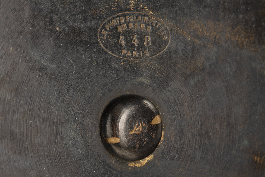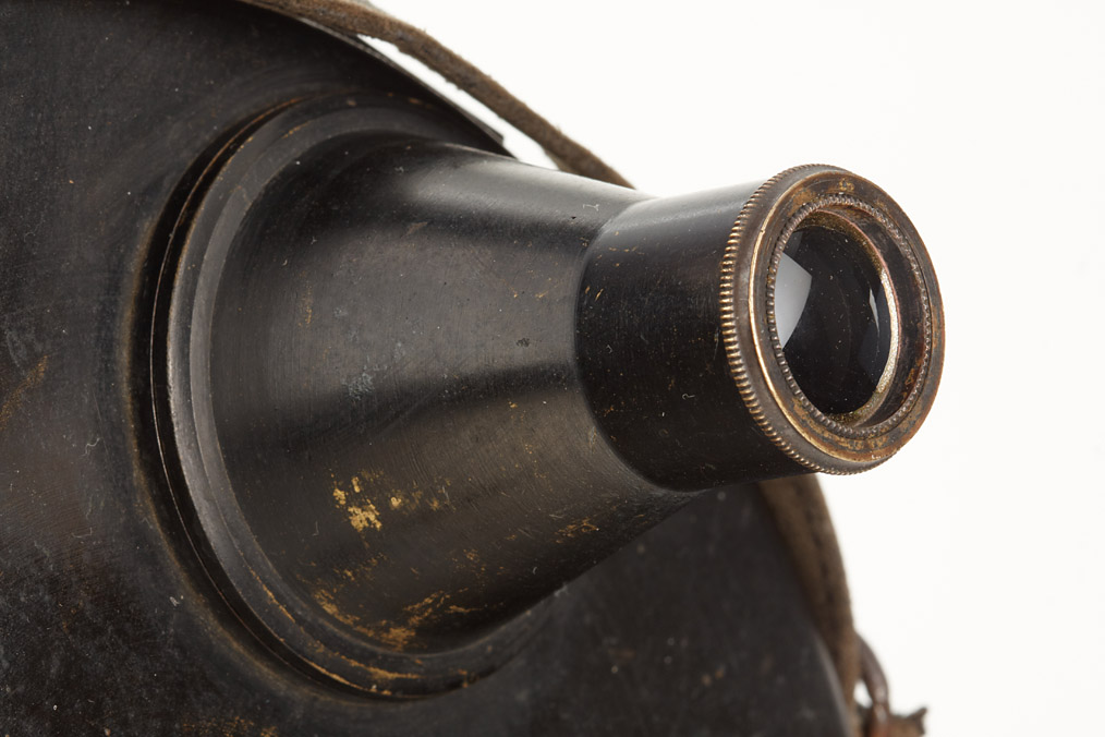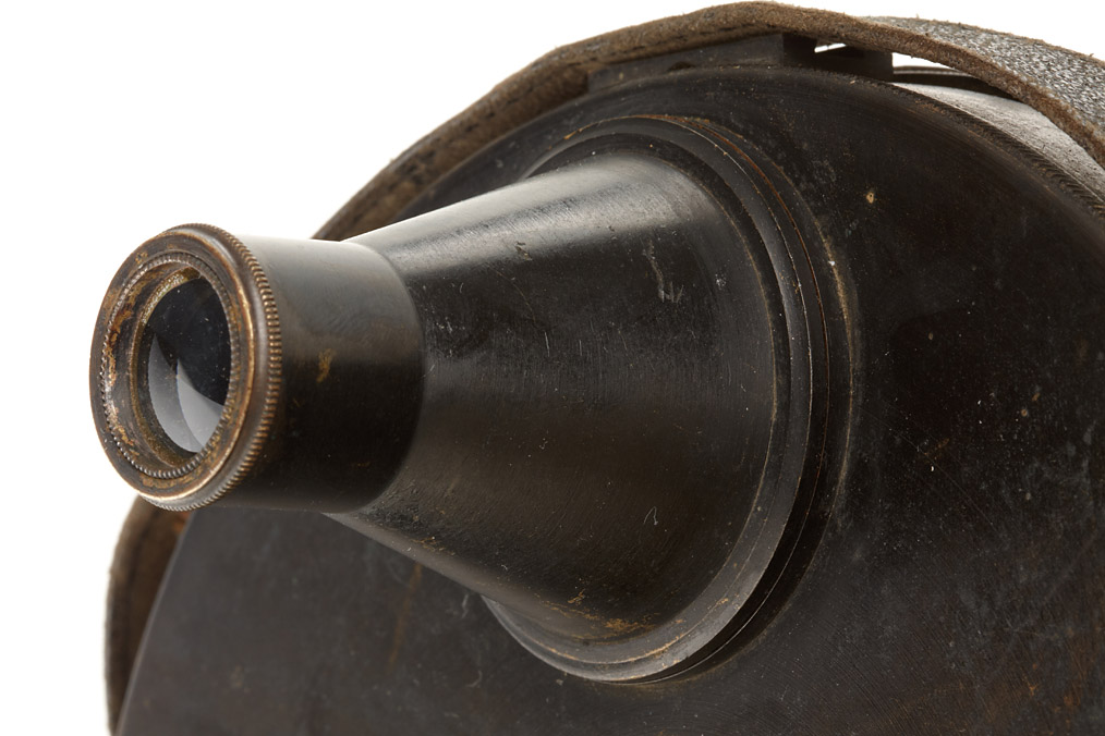 French concealed vest camera designed by Joseph Fetter and manufactured by Dubroni, in nice condition, for 5 exposures 38x38mm on a 14cm round glass plate, original strap