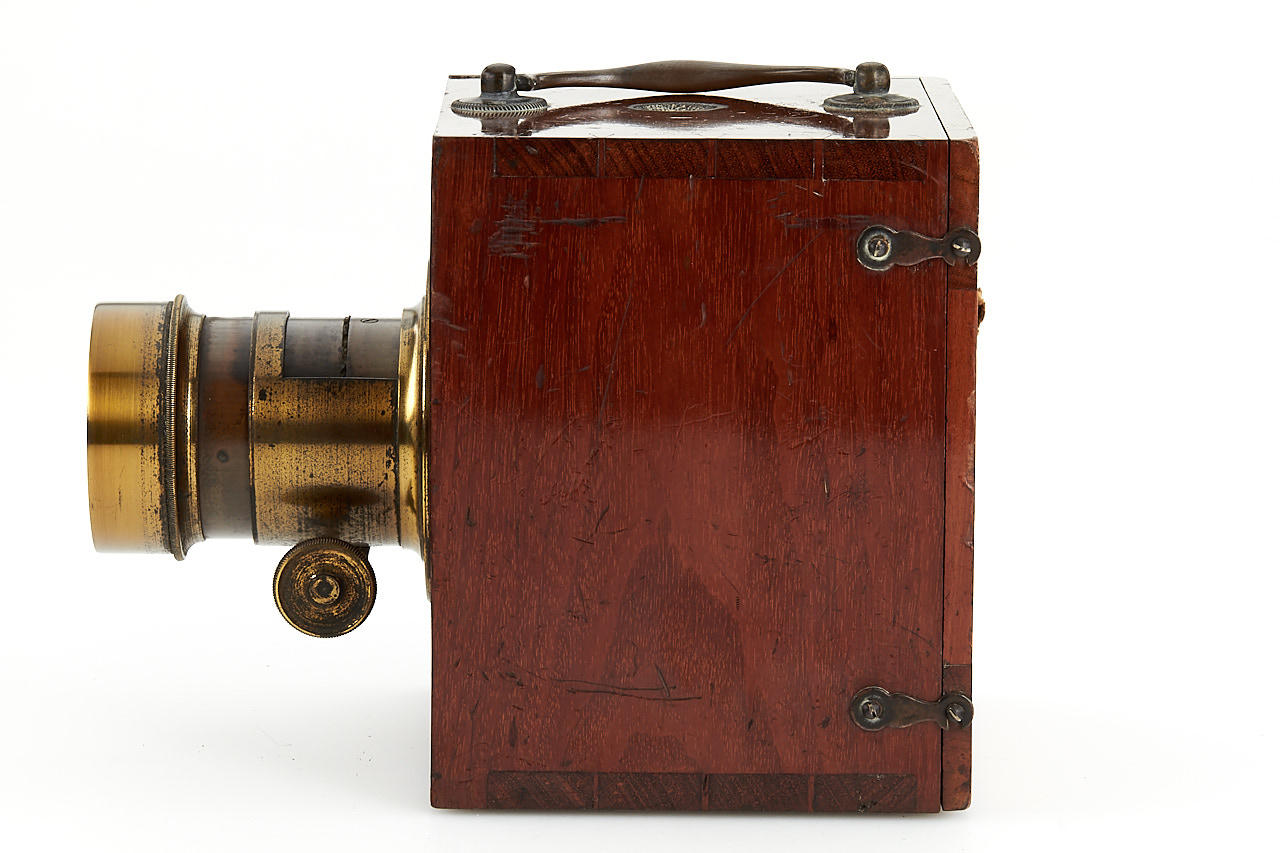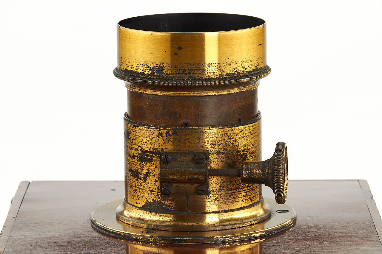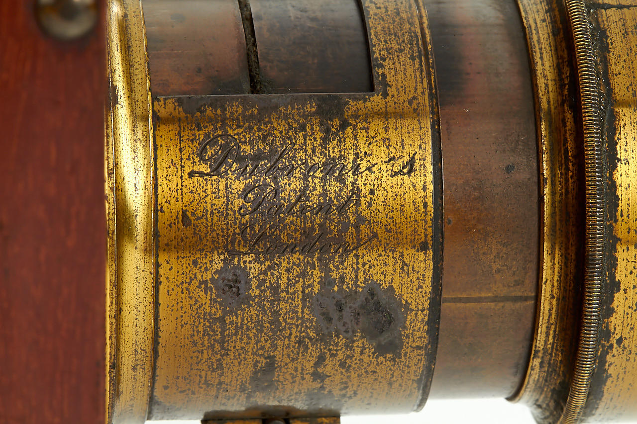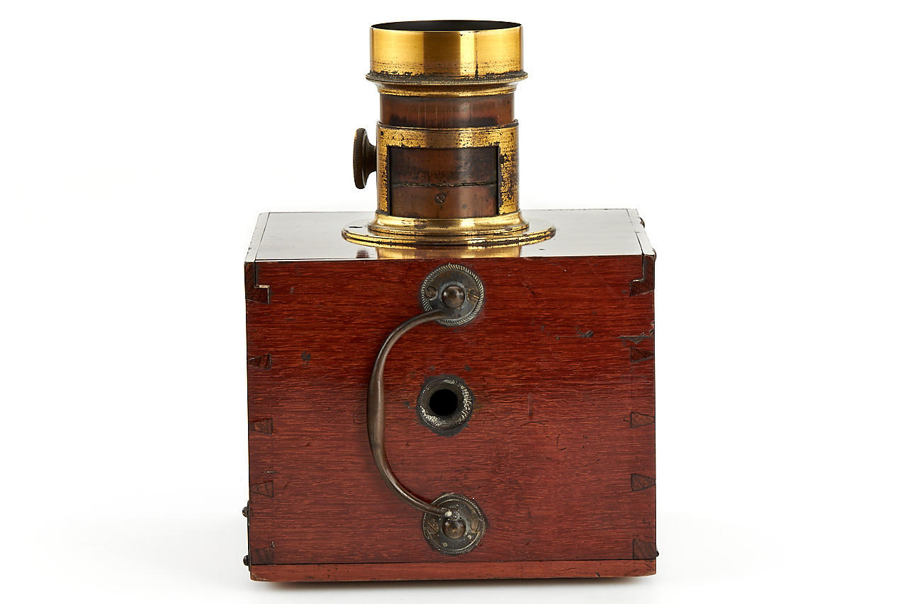 rare large version for 7x9cm oval exposures, walnut body, amber glass bottle interior with a Dubroni Petzval type lens, maker's plaque on the back of the camera: 'Dubroni's Apparatus Patented 60 Regent Street', the Dubroni was the first camera to include an internal system for processing. The plates were first sensitized then developed and fixed inside the camera which had a fixed glass bottle inside. In very good condition.
