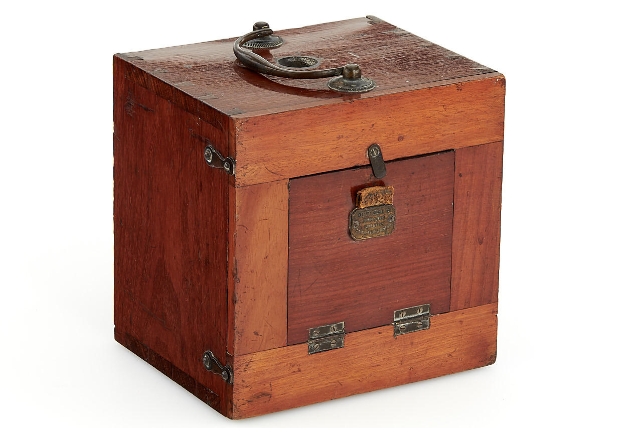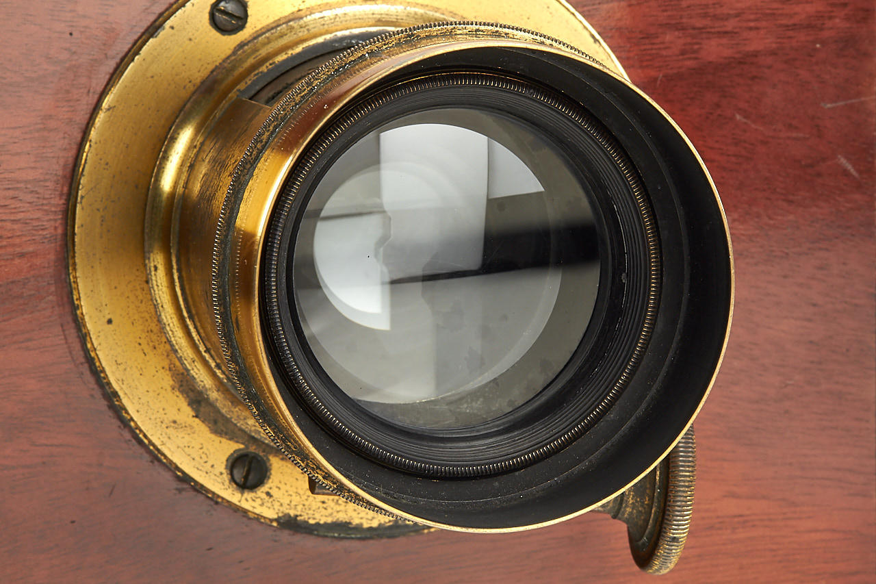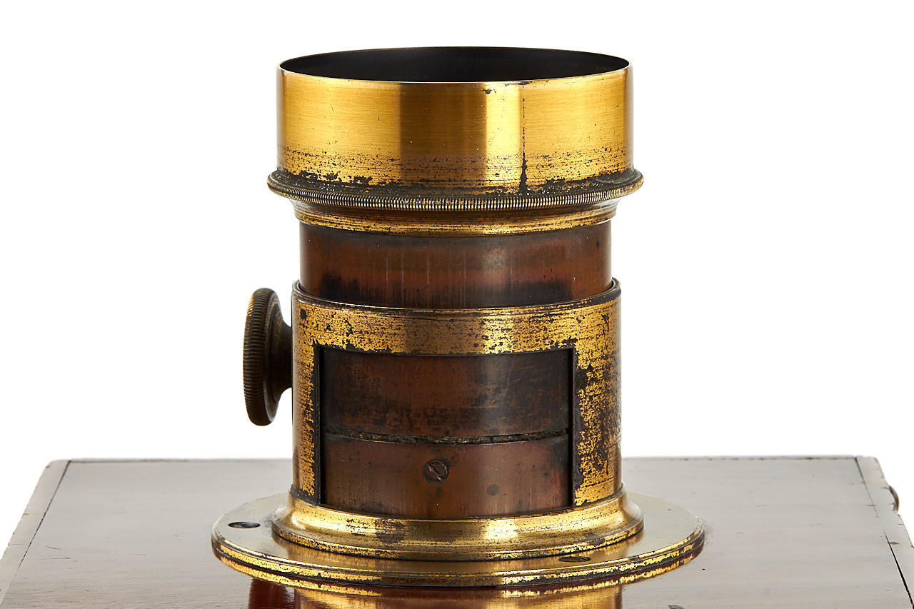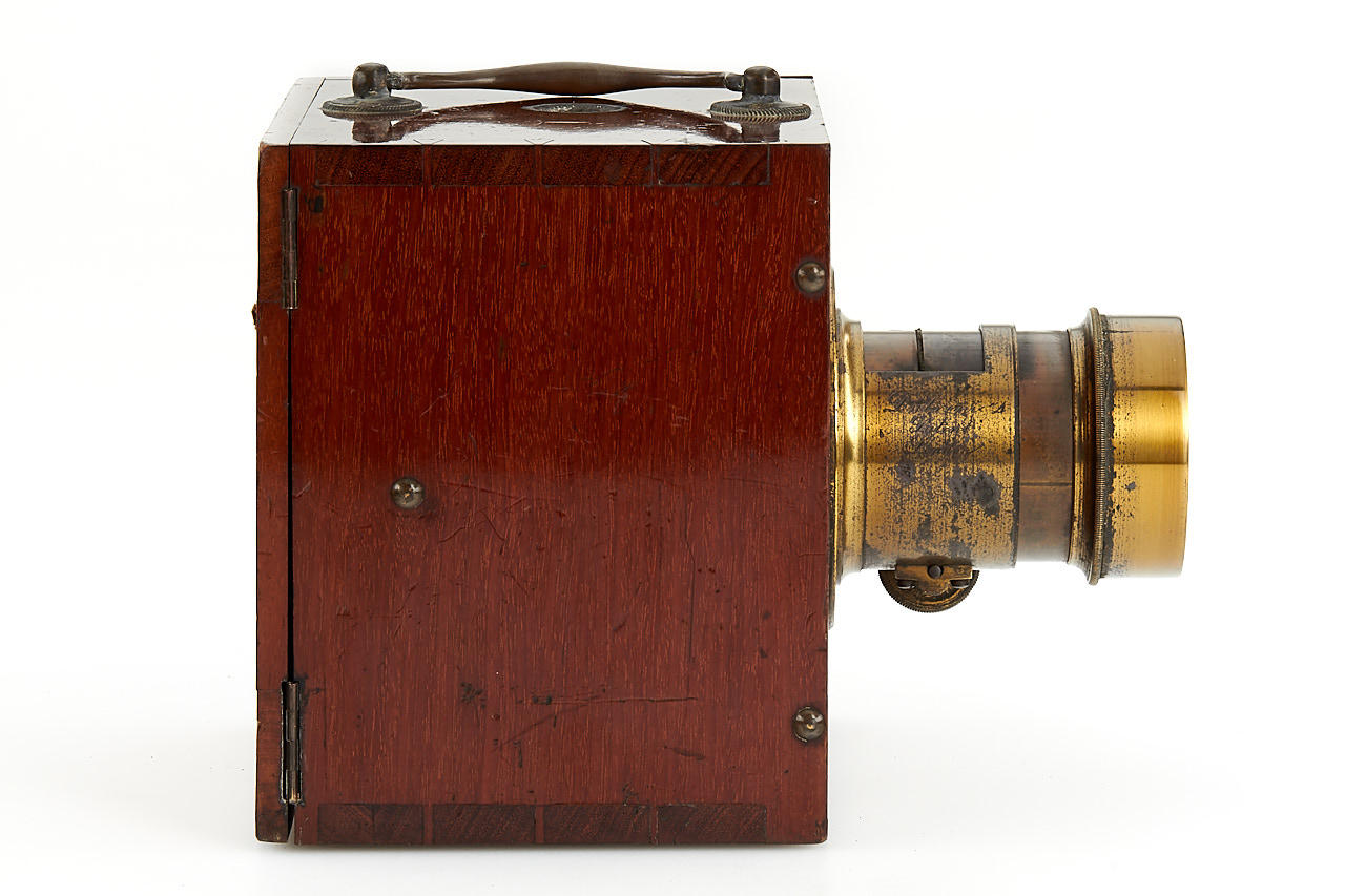 rare large version for 7x9cm oval exposures, walnut body, amber glass bottle interior with a Dubroni Petzval type lens, maker's plaque on the back of the camera: 'Dubroni's Apparatus Patented 60 Regent Street', the Dubroni was the first camera to include an internal system for processing. The plates were first sensitized then developed and fixed inside the camera which had a fixed glass bottle inside. In very good condition.