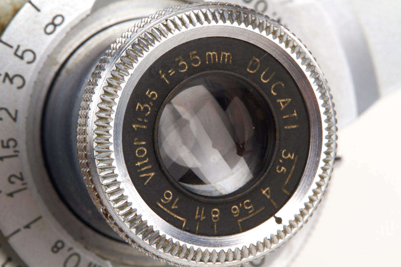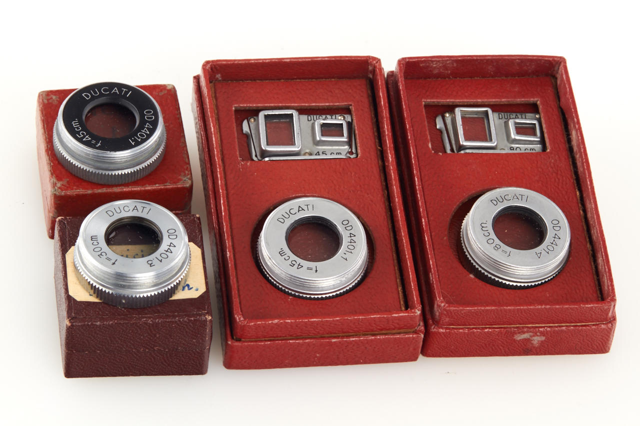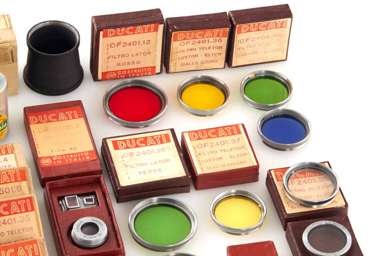 fantastic collection of accessories, most with maker's boxes, many brand new in un-opened boxes including: hoods for Vitor 6401.1, Eltor 3402.1, Lator 3401.4, Teletor 3401.3, various filters for Ducati lenses including 2401.2, 4, 5, 12, 14, 17, 28, 30, 35, 36, 37, 38, 39, various caps including 2501.1, 3, 4, 7, 8, 'Vicino' macro lenses for 45cm + 80cm with finder masks, Macro lenses 4401.1 + 4401.3, a Vitor 3.5/35mm lens no.00480, 12 Ducati film cassettes (5 in aluminium containers) (40)
