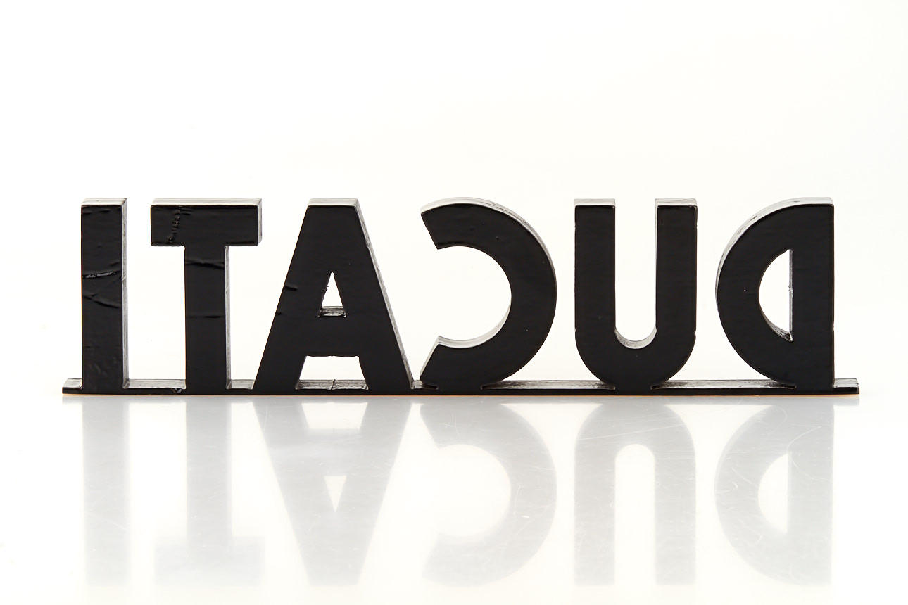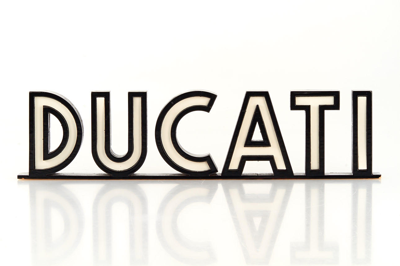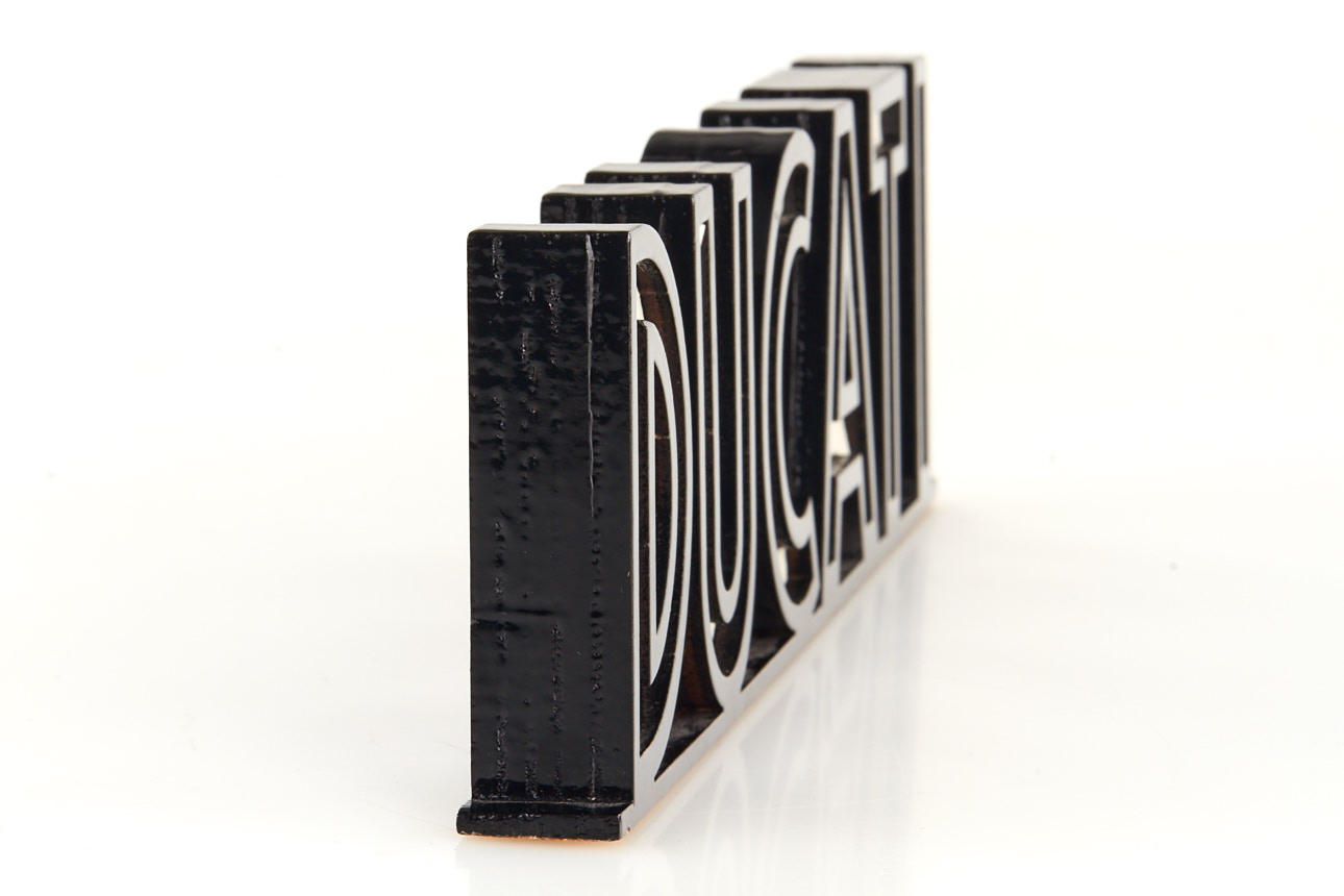 very rare original Ducati display logo, c.32cm long, black, painted wood, in excellent condition