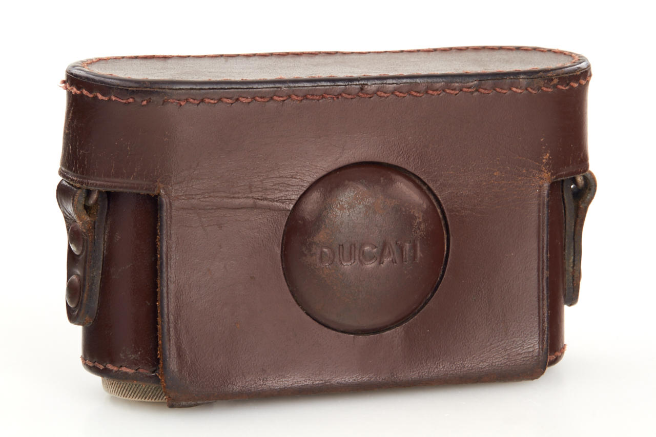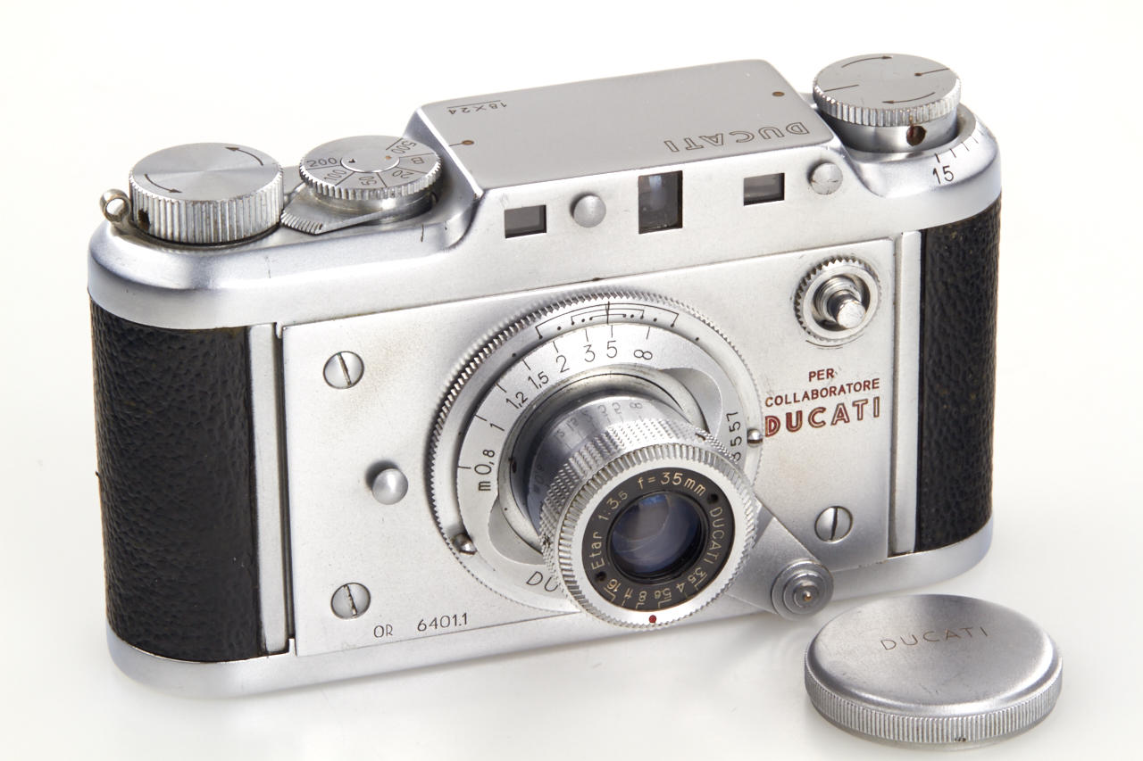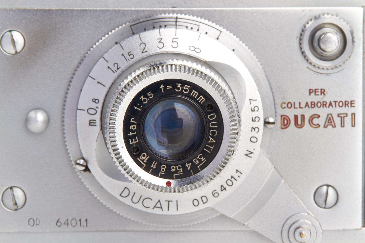 rare camera engraved in red colour 'PER COLLABORATORE DUCATI', in fine and working condition with Etar 3.5/35mm no.03557, cap, spool, everready case