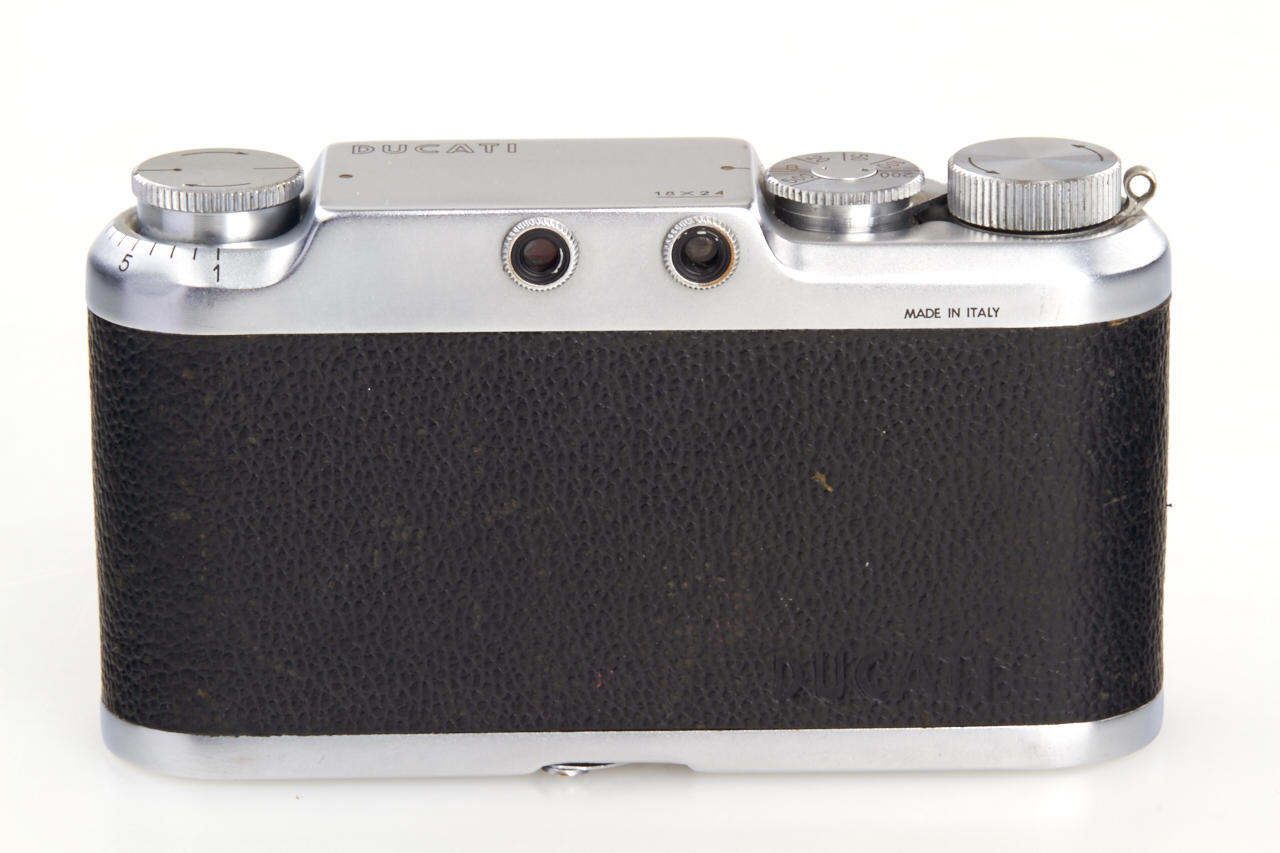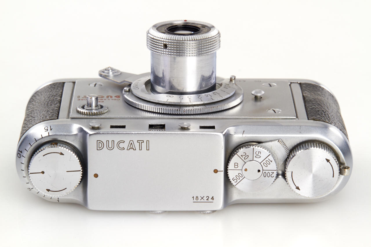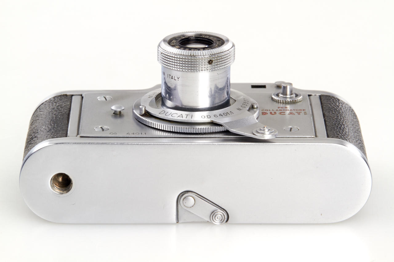 rare camera engraved in red colour 'PER COLLABORATORE DUCATI', in fine and working condition with Etar 3.5/35mm no.03557, cap, spool, everready case