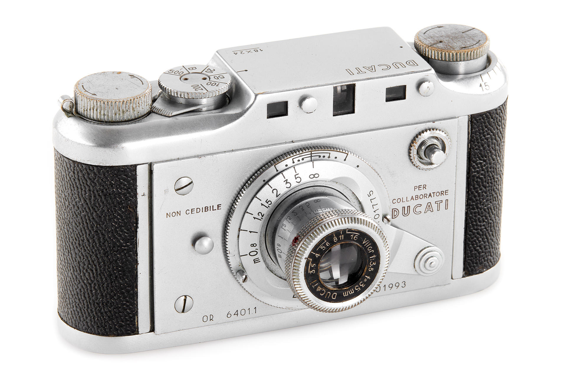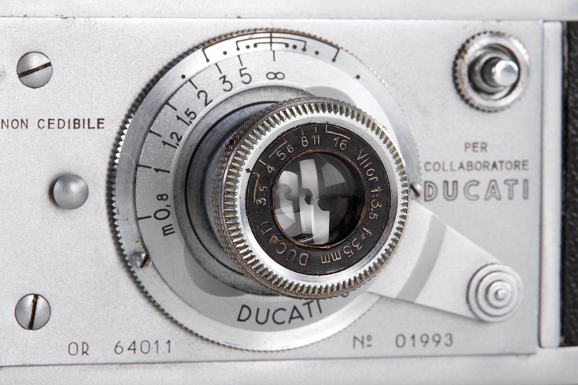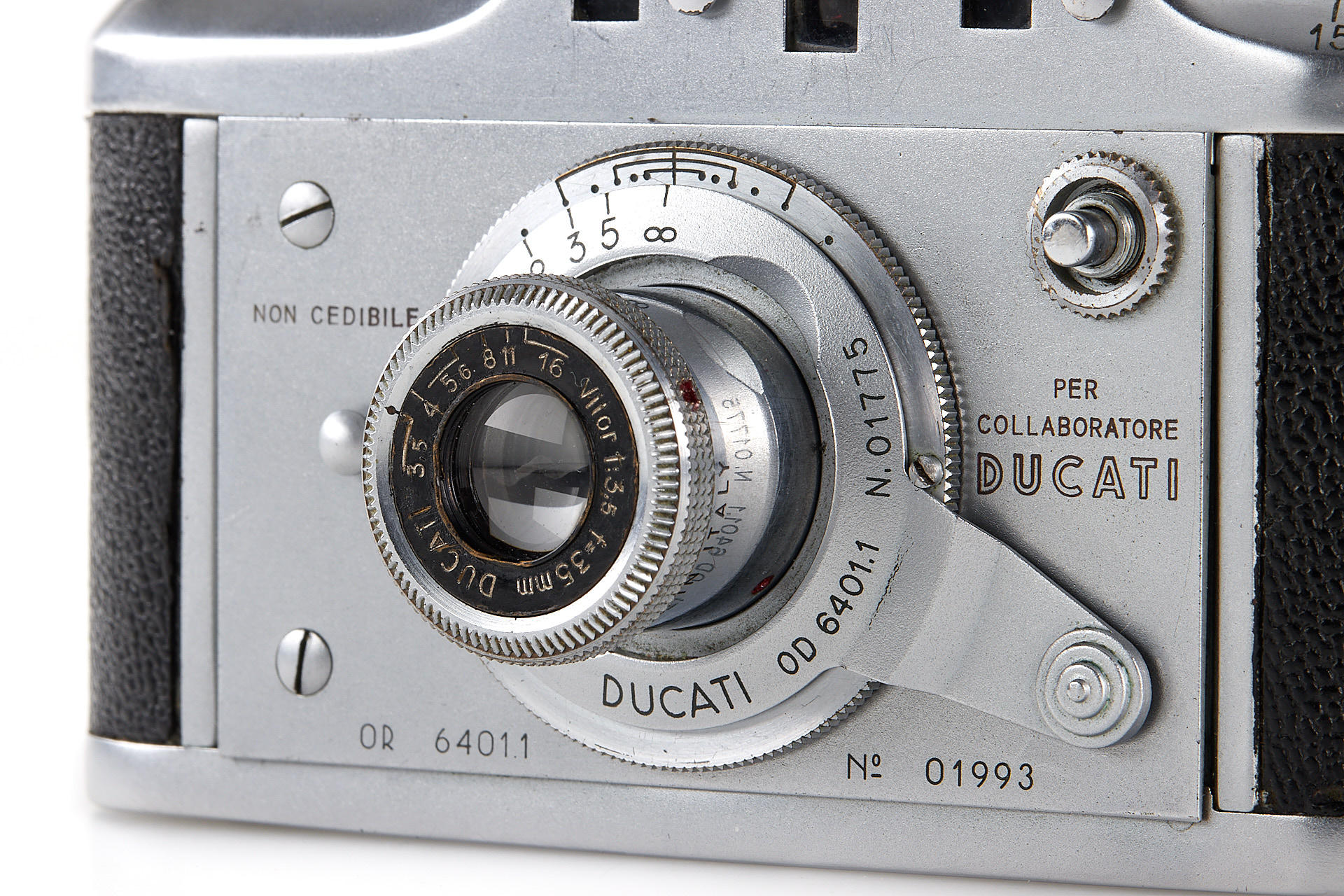 Very rare and early 18x24 Italian camera engraved 'PER COLLABORATORE' (for employees) and 'NON CEDIBILE' (not assignable), limited production of a few hundred pieces for Ducati employees, in very good cosmetic condition, with Vitor 3.5/35mm no.01775, with original cap