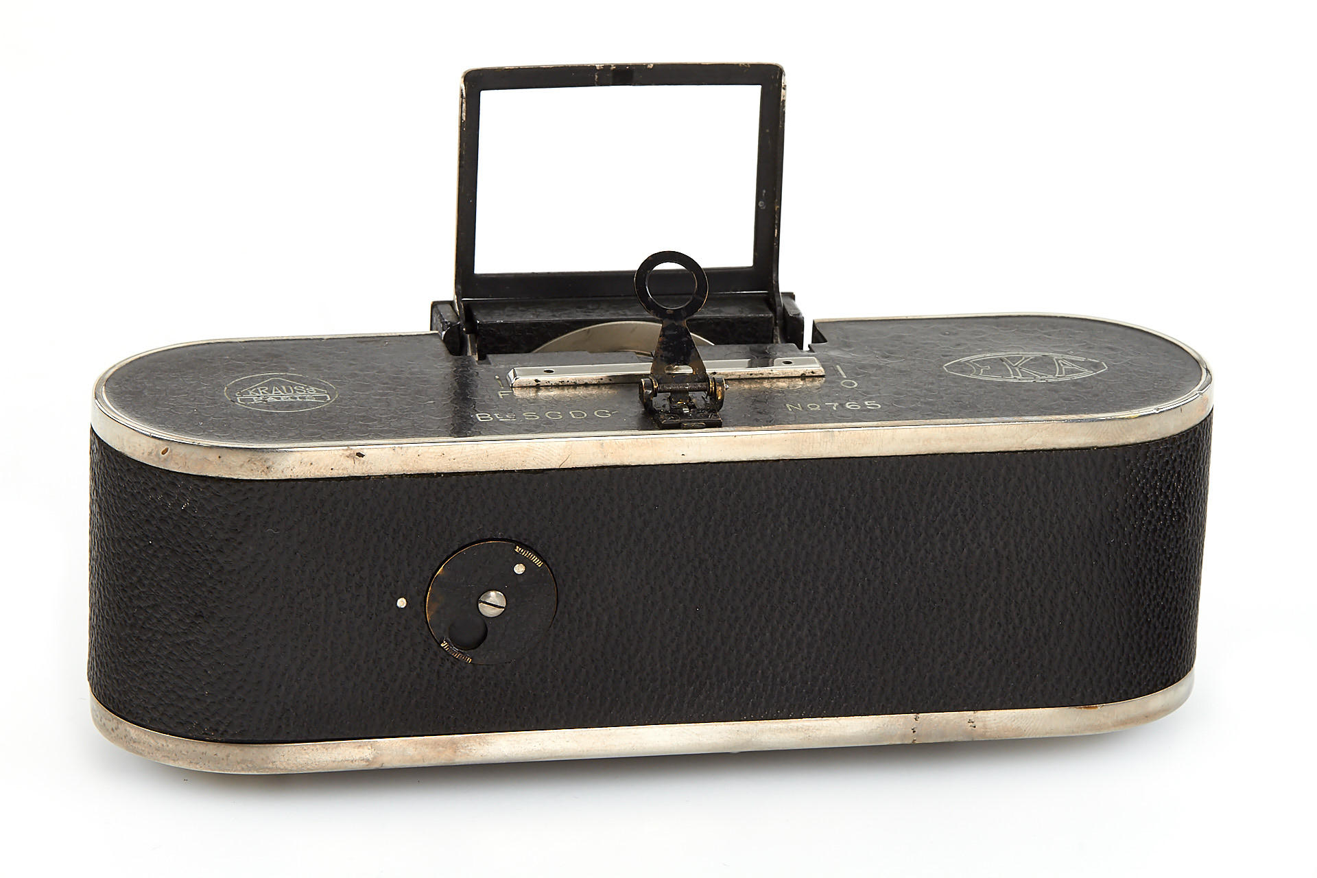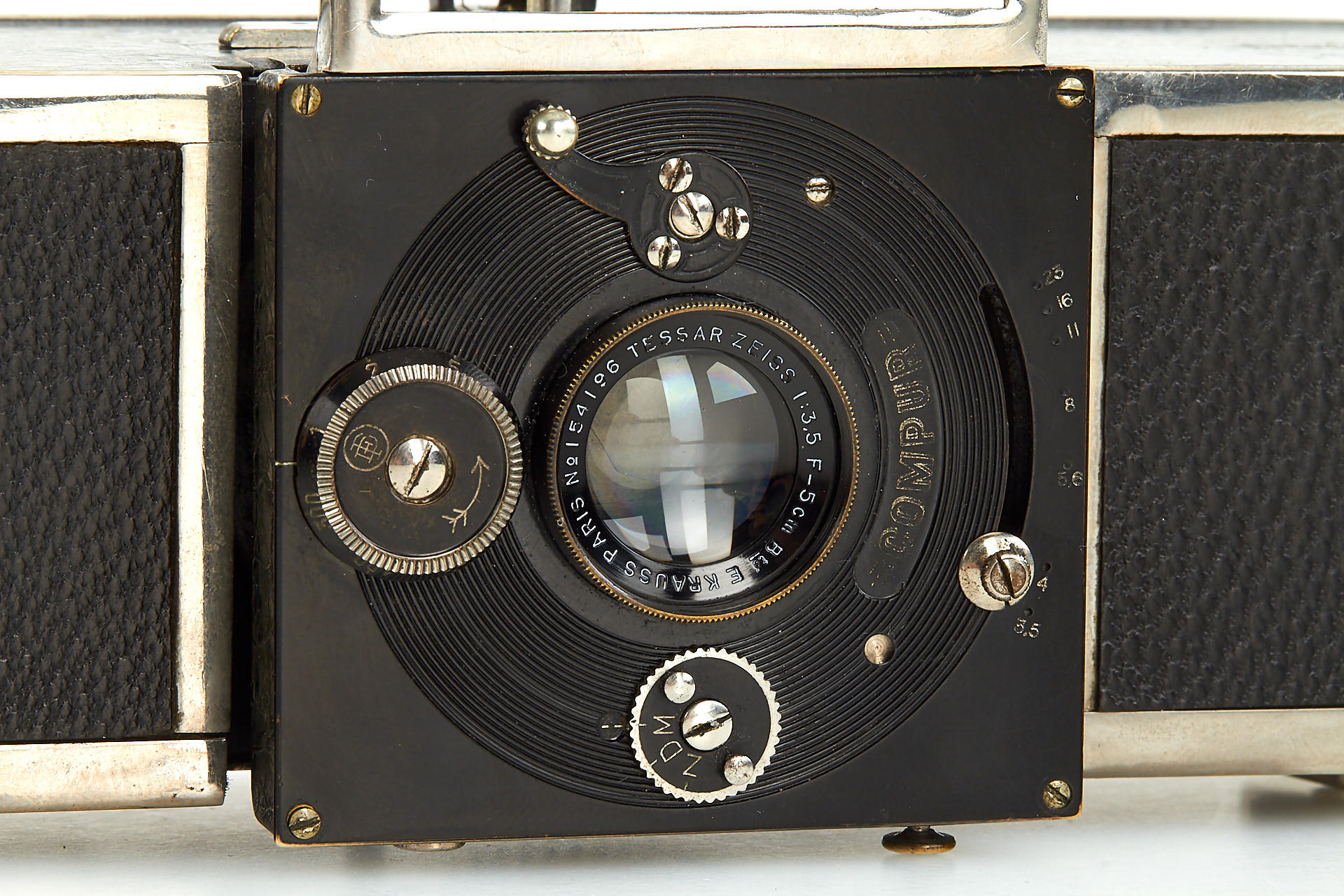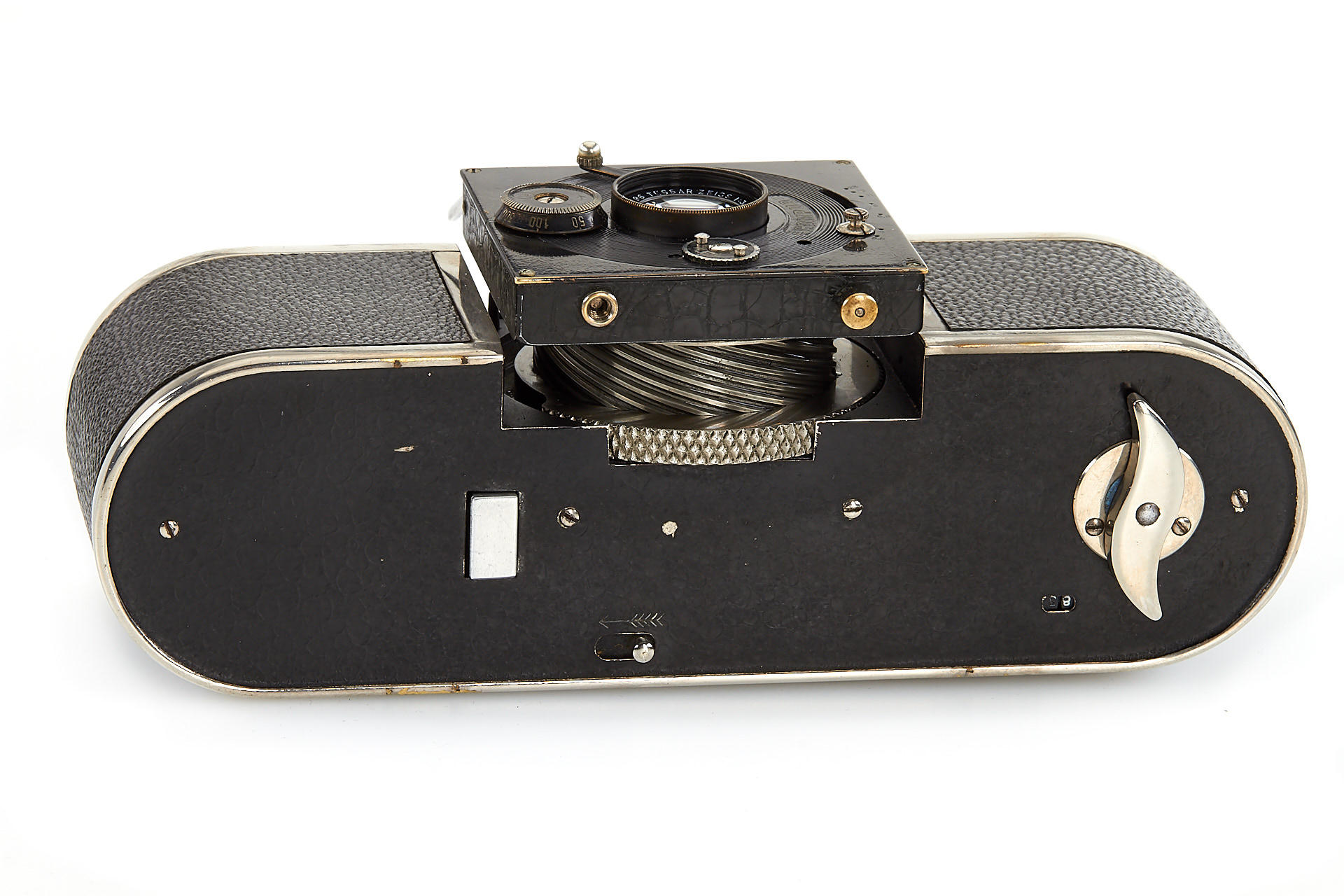Leica forerunner for 100 exposures 35x24mm on unperforated 35mm film, in excellent condition, with Krauss Zeiss Tessar 3.5/50mm no.154196 in Compur shutter, leather case