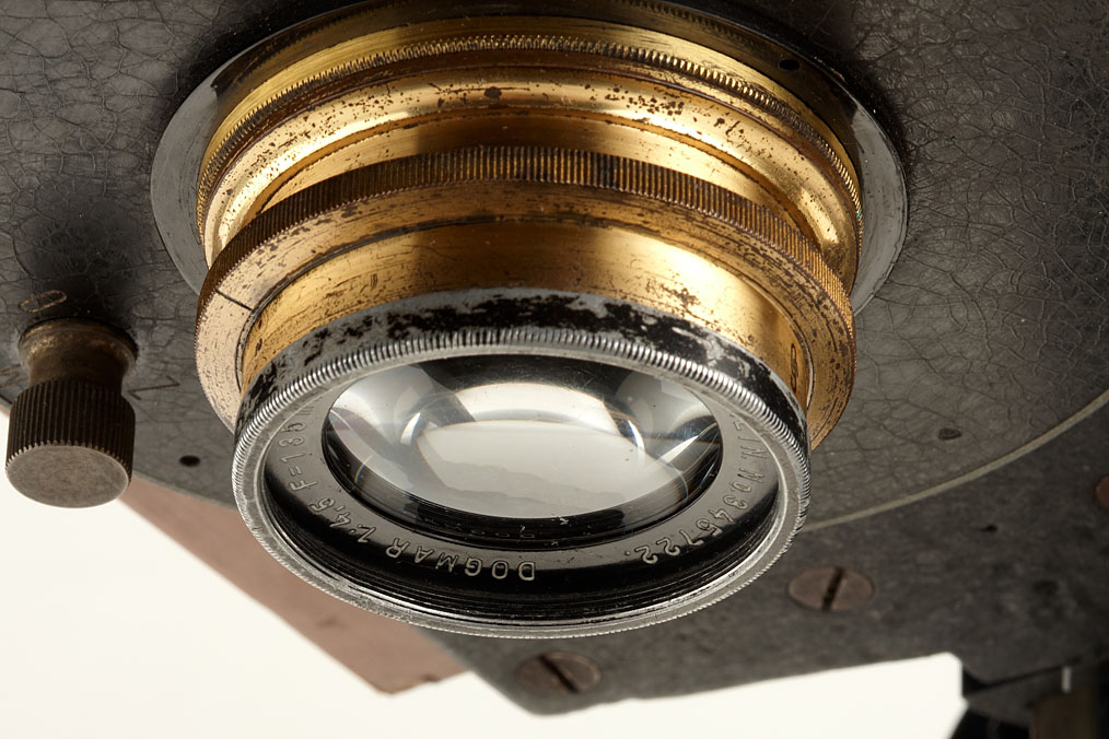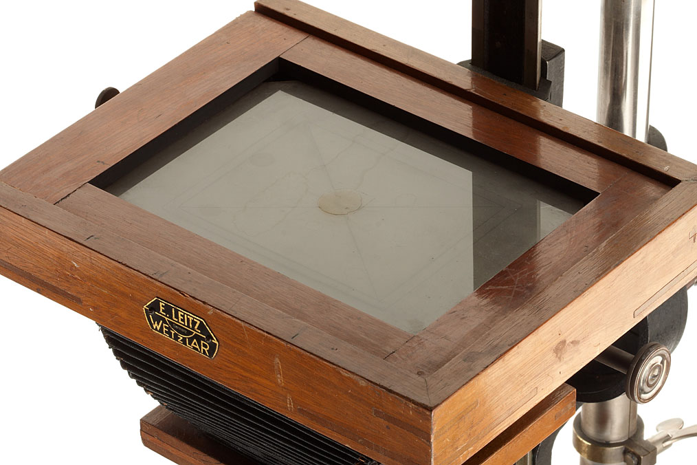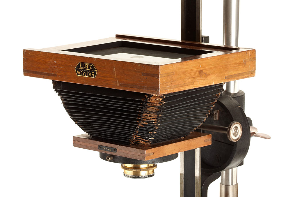 13x18cm, early wooden Leitz reproduction camera, 'Type MA4A' engraved on a metal plaque, with a very heavy stand, brass Dogmar 4.5/135mm no.345722 with iris diaphragm, with later GUHII macro ring illuminator, KOVIR slide printer and KOGLA glass slide attachment for 2x2" plates - a rare outfit
