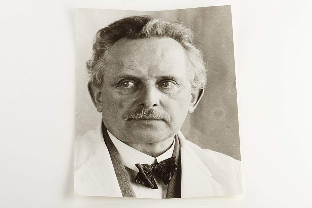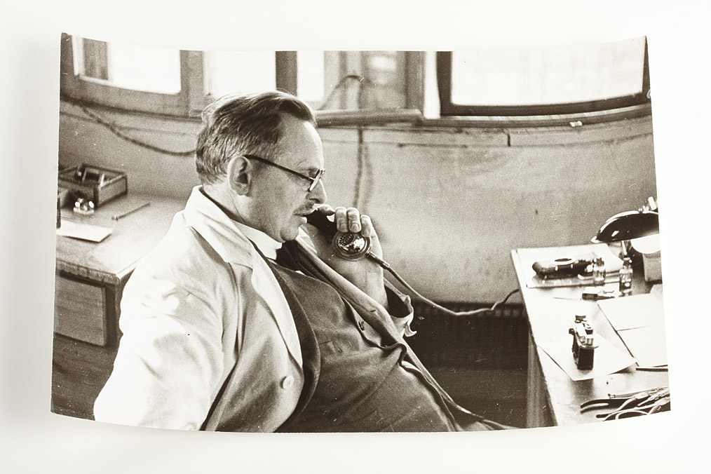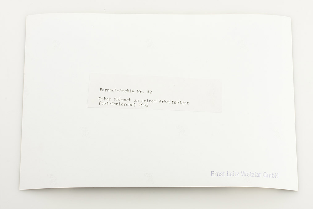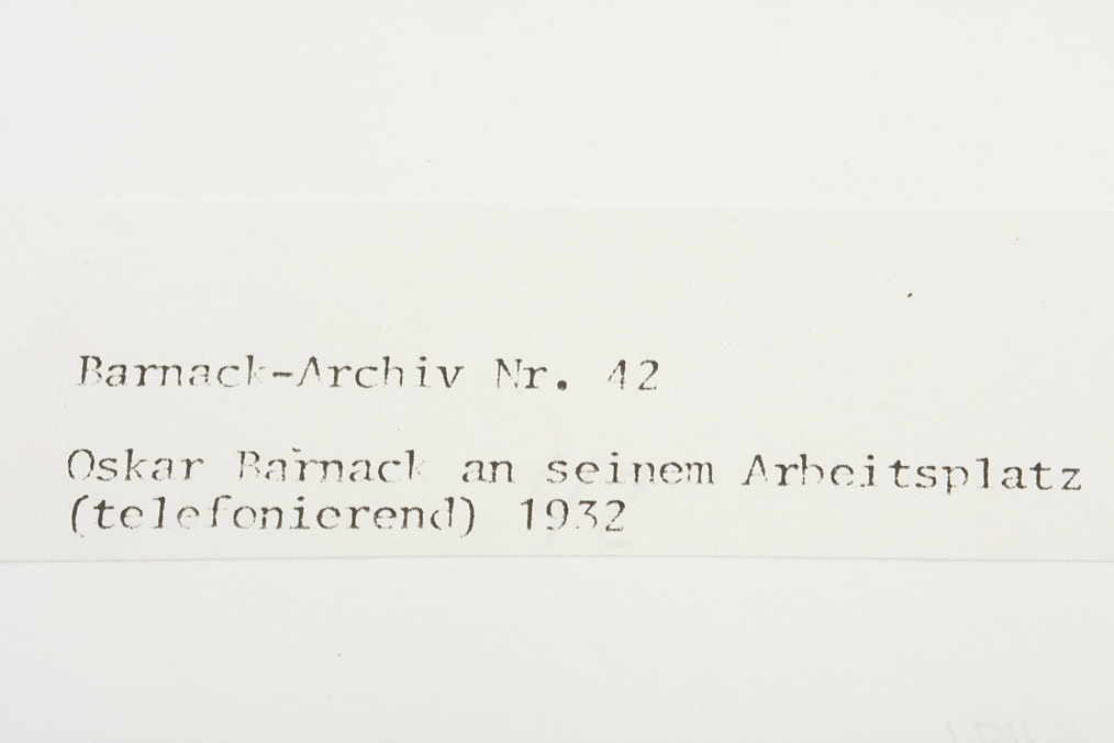 two silver/gelatine prints of Oskar Barnack, (1) on rear: Barnack-Archiv Nr.42 Oskar Barnack an seinem Arbeitsplatz (telefonierend) 1932 (OB on his desk, using the telephone), stamped Ernst Leitz Wetzlar GmbH, 16.5x23cm, (2) the famous portrait of Oskar Barnack, 15.8x21.8cm (2) both printed from the original negatives around 1980