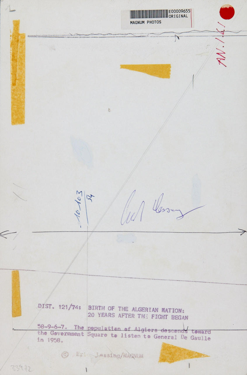 Vintage silver print 16 x 23,8 cm Signed by the photographer in ink on the reverse, his agency stamp and typographic annotation reading “DIST. 121/74: BIRTH OF THE ALGERIAN NATION: 20 YEARS AFTER THE FIGHT BEGAN” on the reverse PROVENANCE directly from the photographer De Gaulle’s first task as head of government was to defuse the situation in Algeria. In a four-day visit he tried to calm the Algerian population as well as the French "colonies". Algeria, 1958. LITERATURE Jean-Jacques Jordi, Algérie. De la guerre à l’indépendance 1957-1962, Editions Quest-France, Rennes 2012, p. 33.