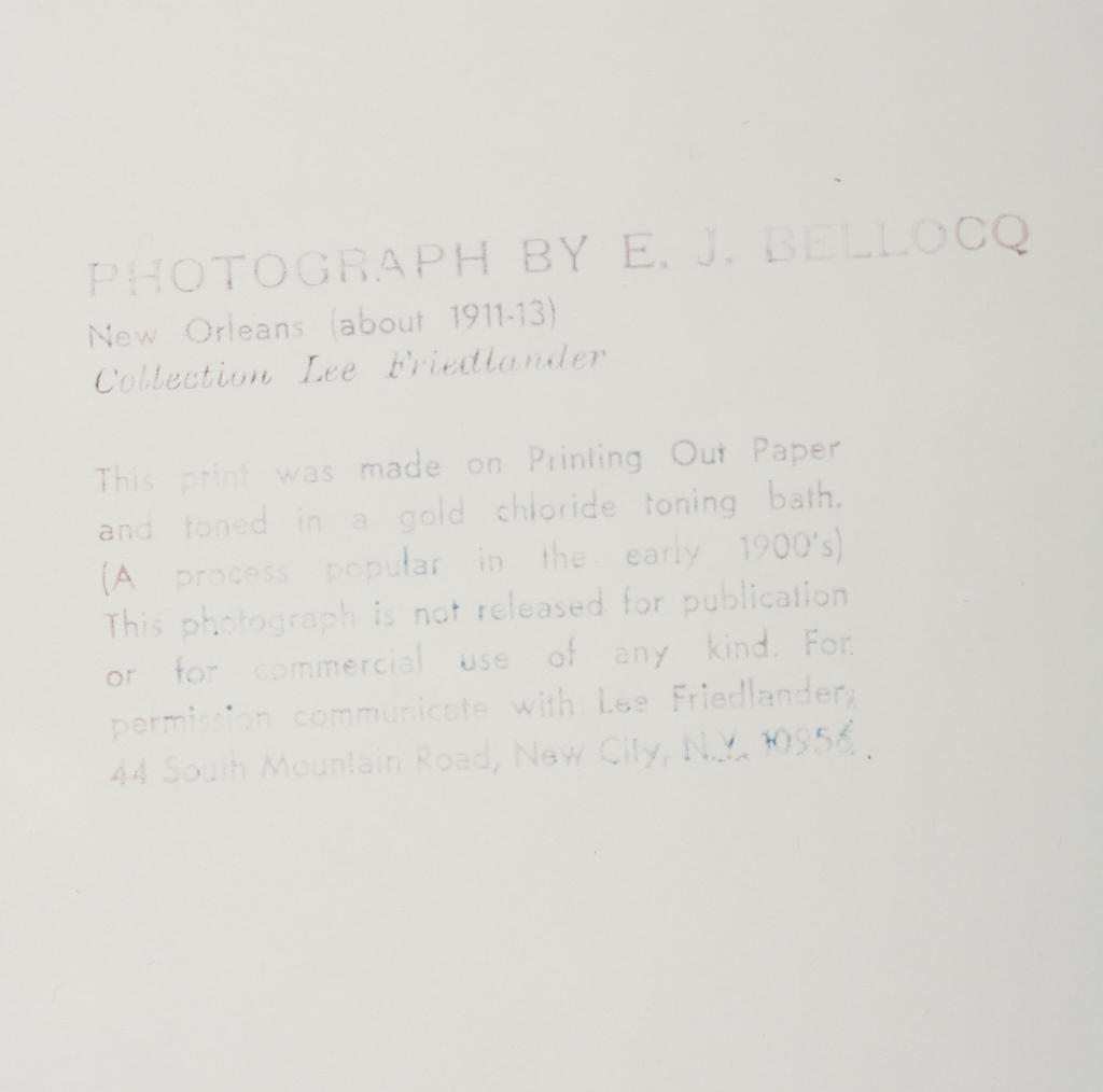 Toned gelatin silver print, printed in the late 1960s by Lee Friedlander 20 x 25,4 cm (7.9 x 10 in) Lee Friedlander's collection stamp and description stamp on the reverse LITERATURE E. John Szarkowski (ed.), J. Bellocq. Storyville Portraits, The Museum of Modern Art, New York 1970, pl. 25. Der Stadtteil Storyville in New Orleans, war nicht nur das Zuhause des Jazz, sondern zwischen 1896 und 1917 eines der wenigen legalisierten Rotlichtviertel der USA. Bellocqs einzig erhaltenes Werkfragment ‘Storyville Portraits’ wurde erst durch die Prints von Lee Friedlander bekannt. Friedlander erwarb die 8 x 10 inch Glasnegative 1966 von einem Kunsthändler und fertigte in den darauffolgenden Jahren meisterliche Kontaktabzüge auf warmgetöntem Papier an. 1970 widmete das New Yorker Museum of Modern Art der Storyville-Serie eine eigene Ausstellung. The Storyville district in New Orleans was not only the home of jazz, but also one of the few legalized red-light districts in the United States between 1896 and 1917. Bellocq's only surviving work, ‘Storyville Portraits’, is known only through the distinctive prints made by Lee Friedlander. Friedlander bought the 8 x 10 inch glass negatives in 1966 from an art dealer and produced masterful contact prints on warm toned paper in the following years. In 1970 the Museum of Modern Art in New York dedicated a solo exhibition to the Storyville series.