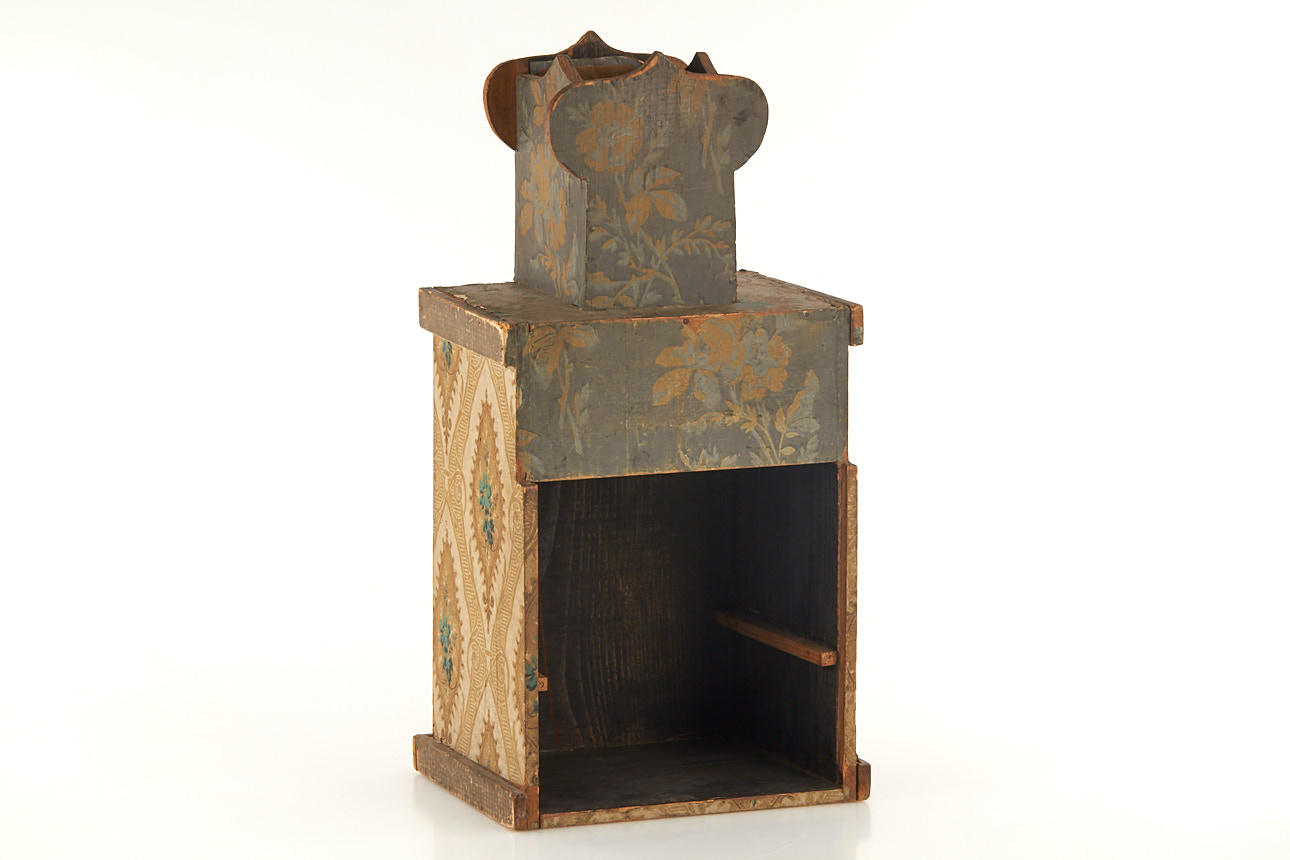 44cm high, probably mid-XIX century German peep box with lens and mirror, for 15x18cm pictures, decorated with early wallpaper