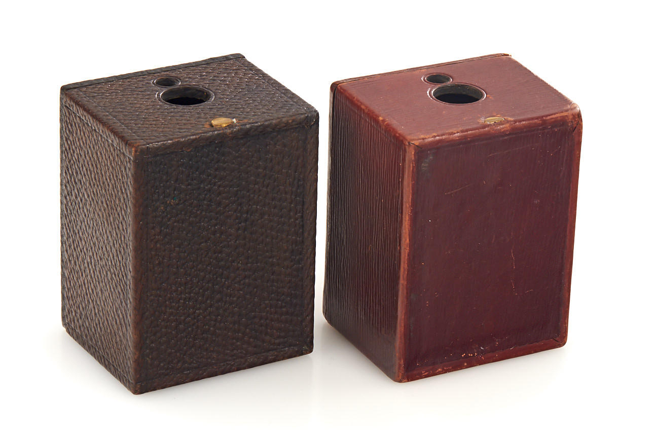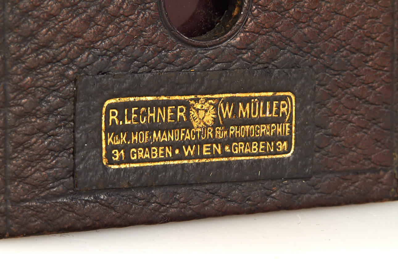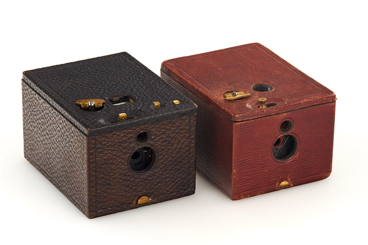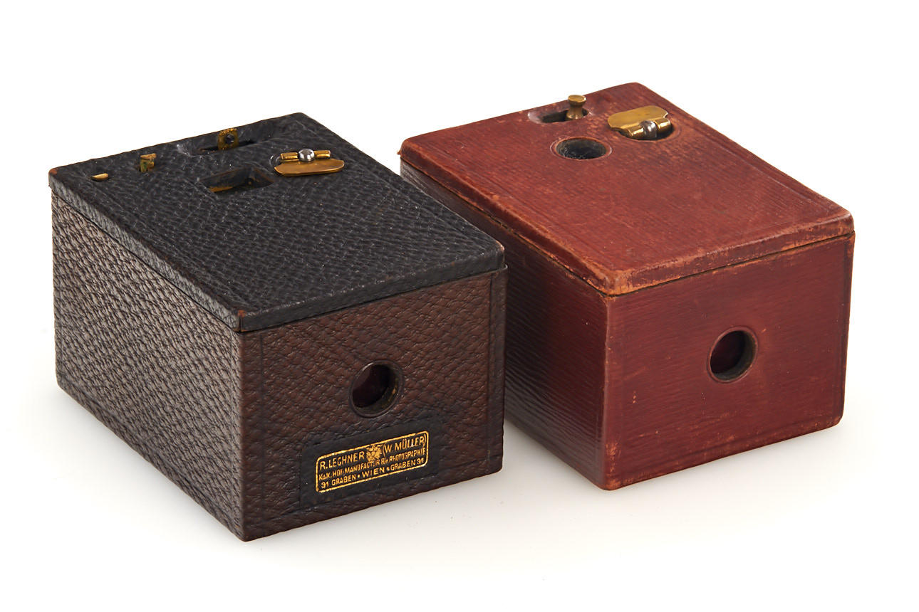 (1) 1895 type camera with round viewfinder window in beautiful condition, (2) near mint 1896 version (with sticker of Austrian dealer Lechner & Müller on camera back and inside), with rare maker's box for the 1896 camera