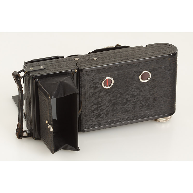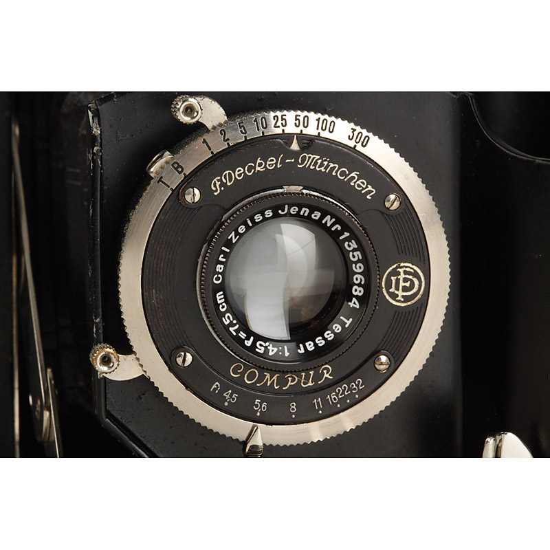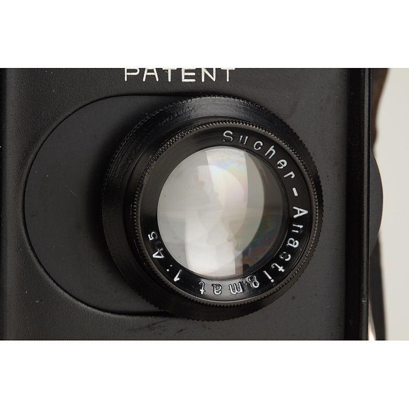 second type horizontal twin-lens camera for 4.5x6cm exposures on roll film, Tessar 4.5/7.5cm taking lens no.1359684 in good working Compur shutter, Sucher-Anastigmat 1:4.5, in extremely good original condition with original everready case and hood