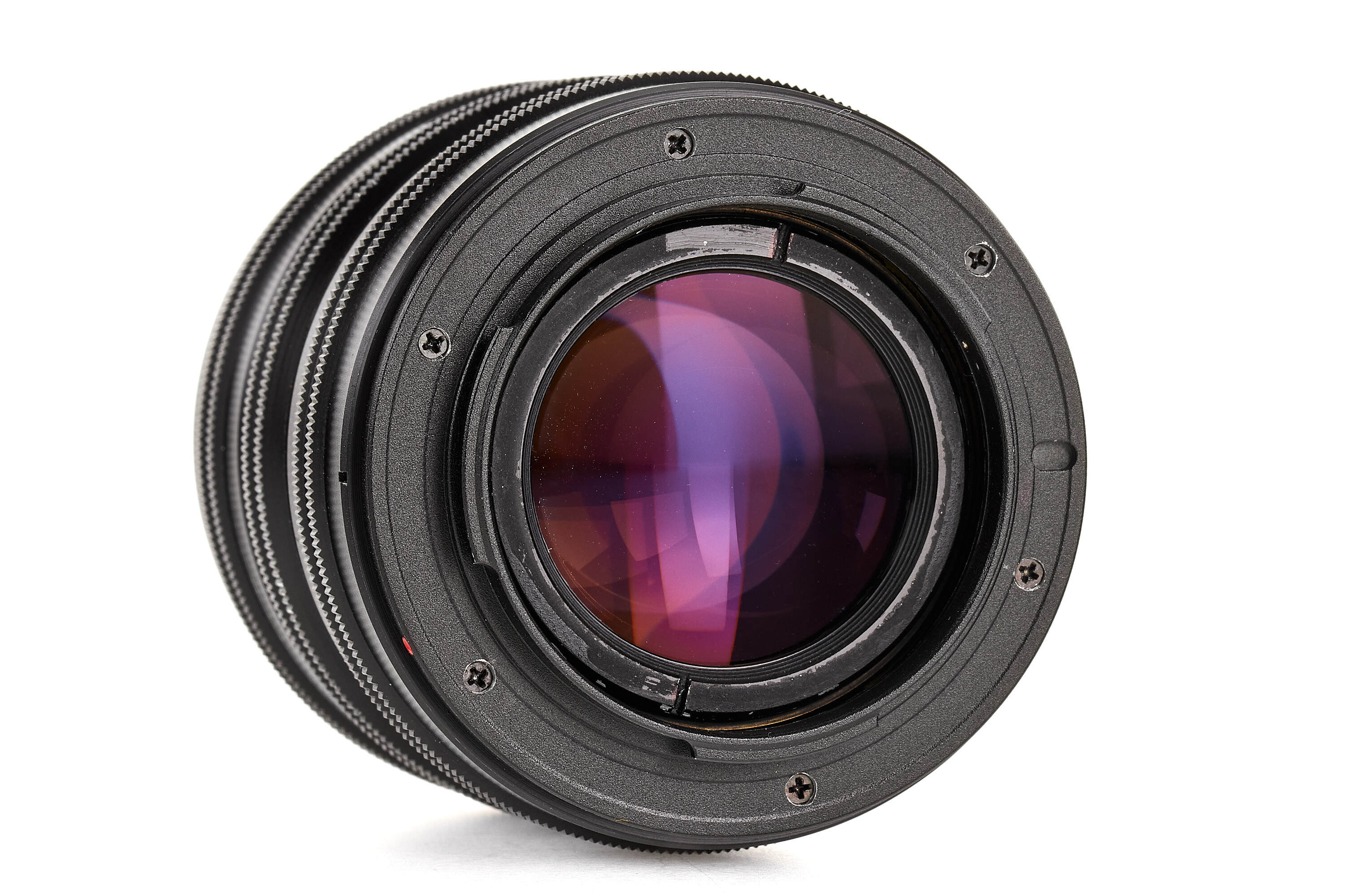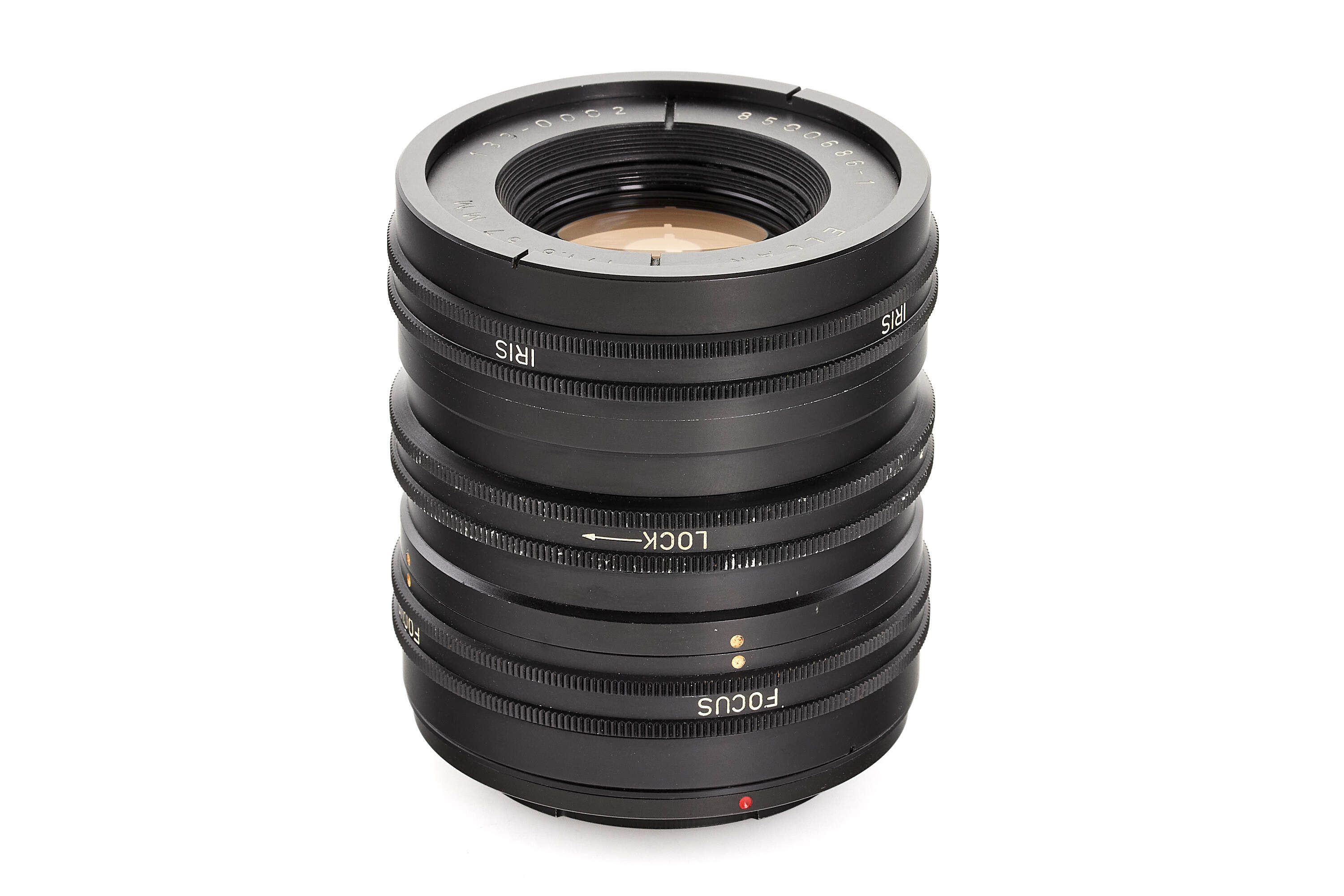 Extremely rare prototype Elcan lens for unknown industrial purpose, in very good condition, optics with traces of removed fungus, heavy construction, focusing and aperture setting without scale, focus lock ring, here adapted for E-mount, covering APS-C, note also the unusual 2 serial numbers, with both caps.