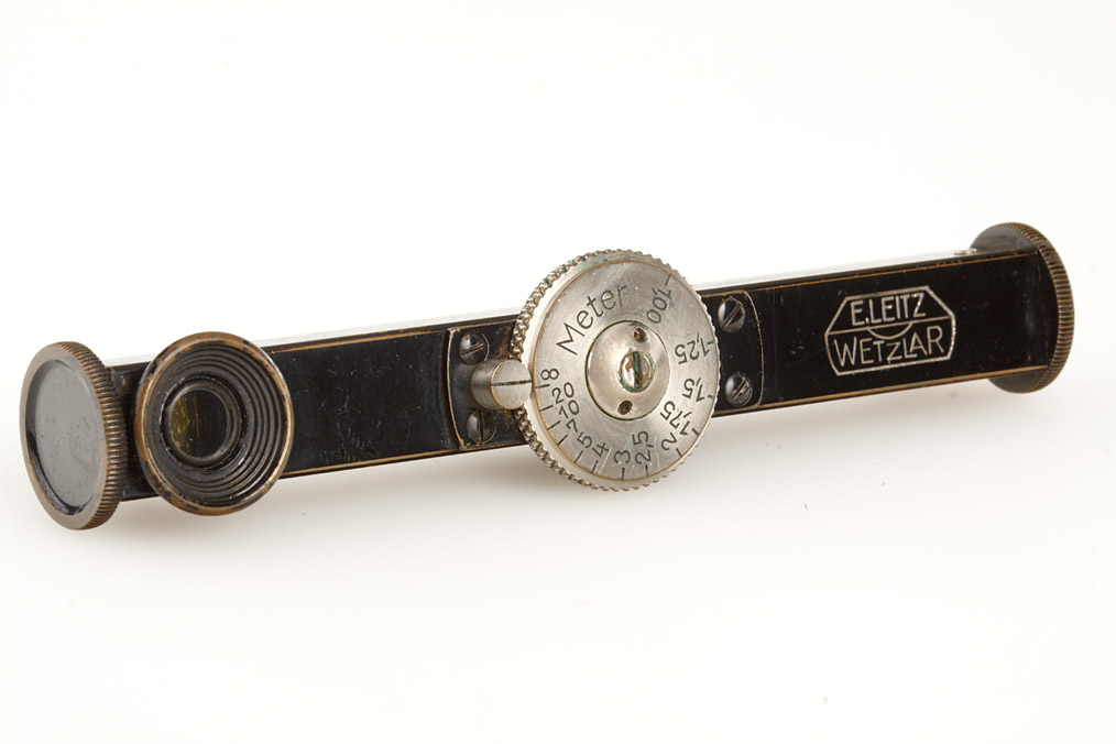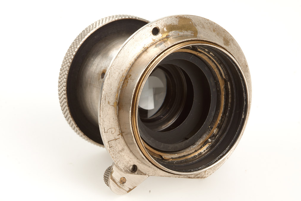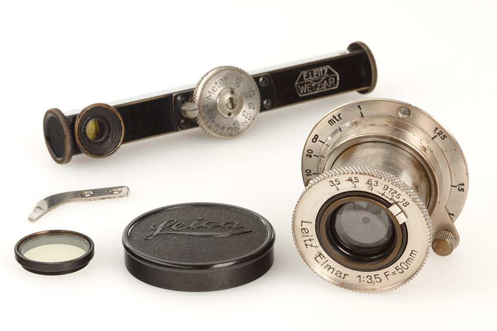Elmar for early I Mod.A, including the original infinity lock arm, matching original screw-in UV filter, bakelite cap, FODIS rangefinder with meter scale
