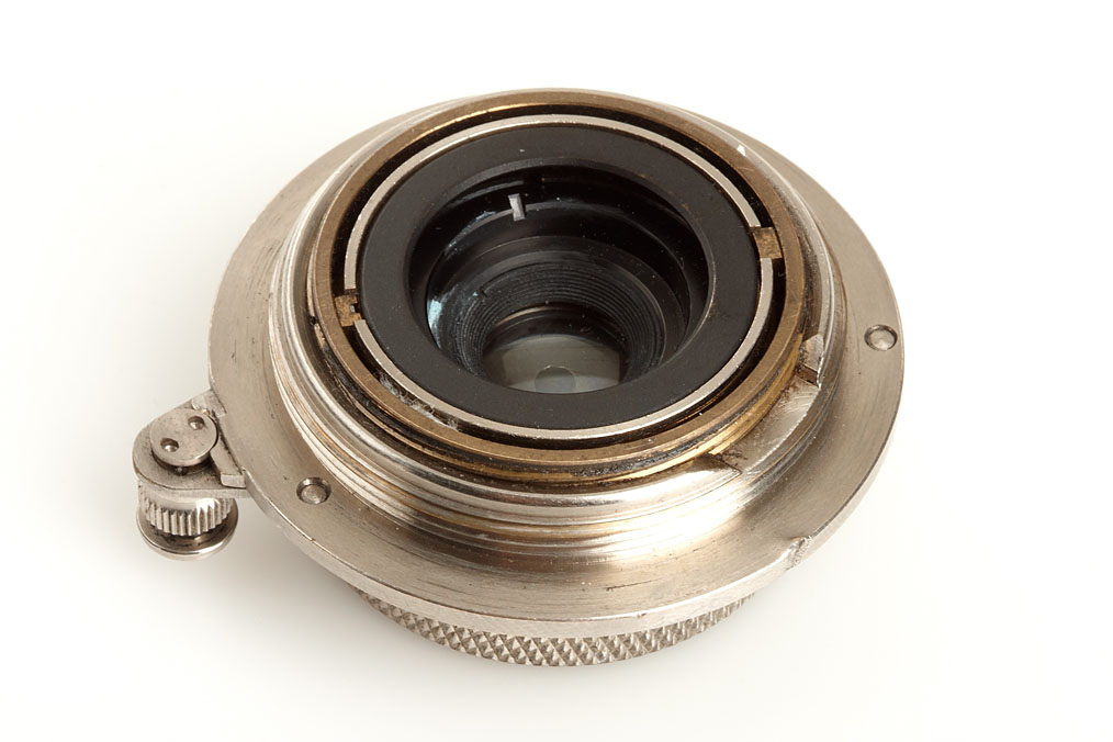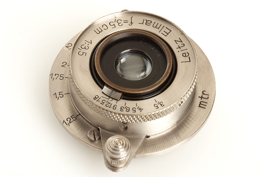 7 o'clock nickel Elmar with domed release, heavy cam, in good condition, meter scale