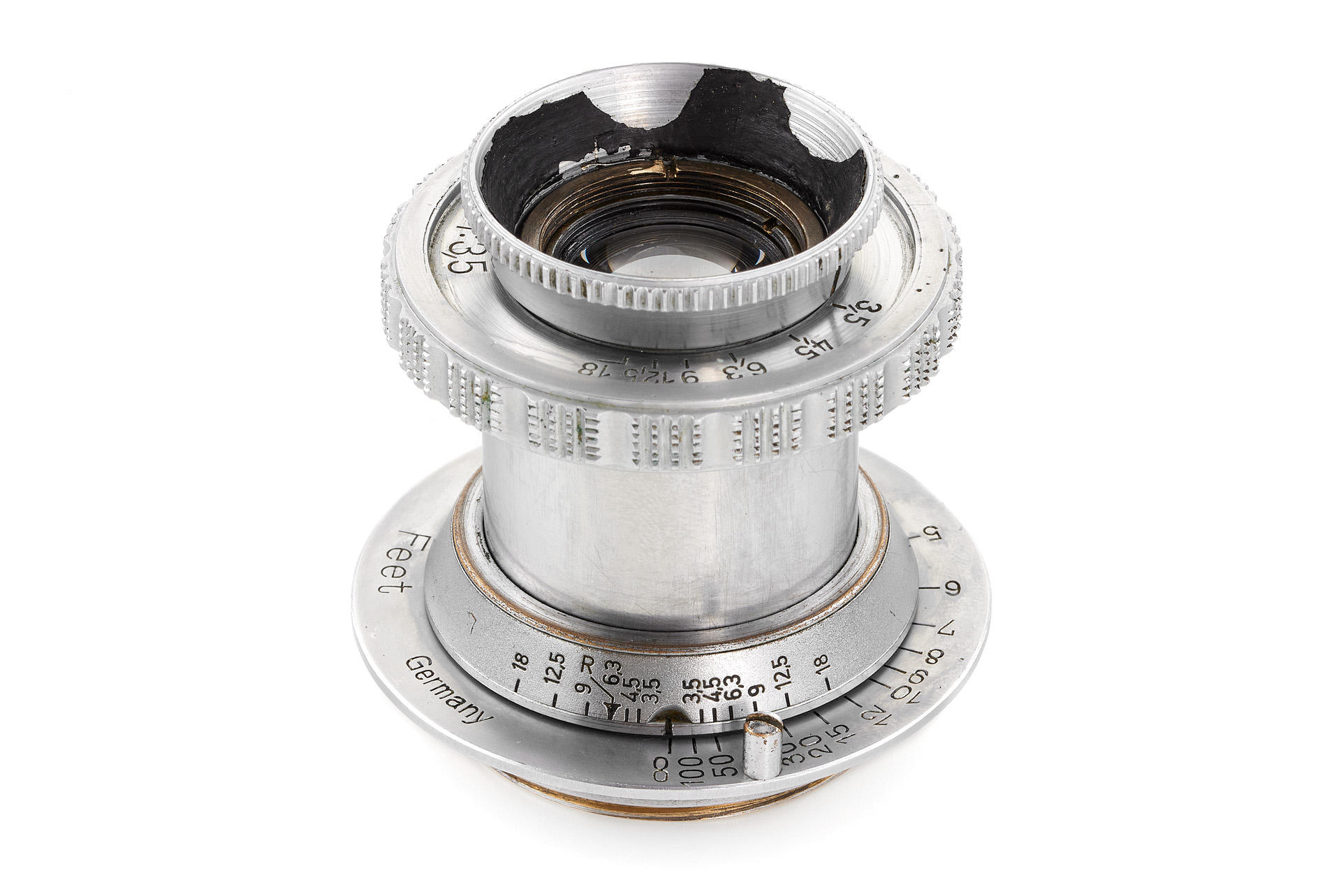 very interesting early Elmar 3.5/5cm in feet scale, modified to simplify the aperture setting operation (not performed by Leitz), in good condition, some tool marks can be seen