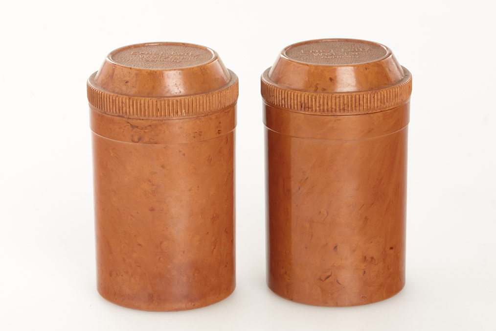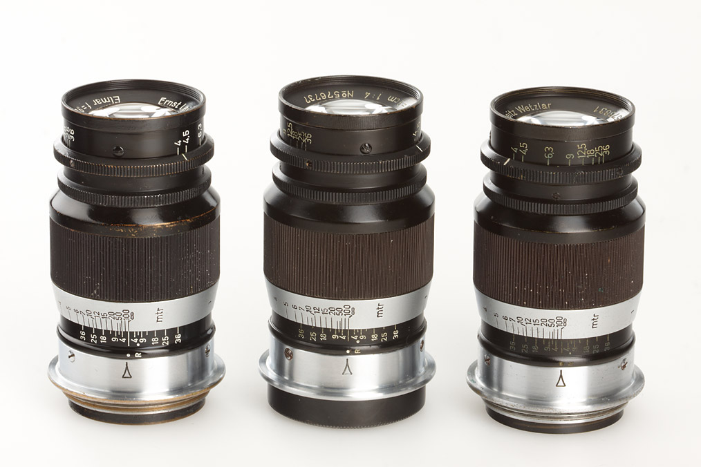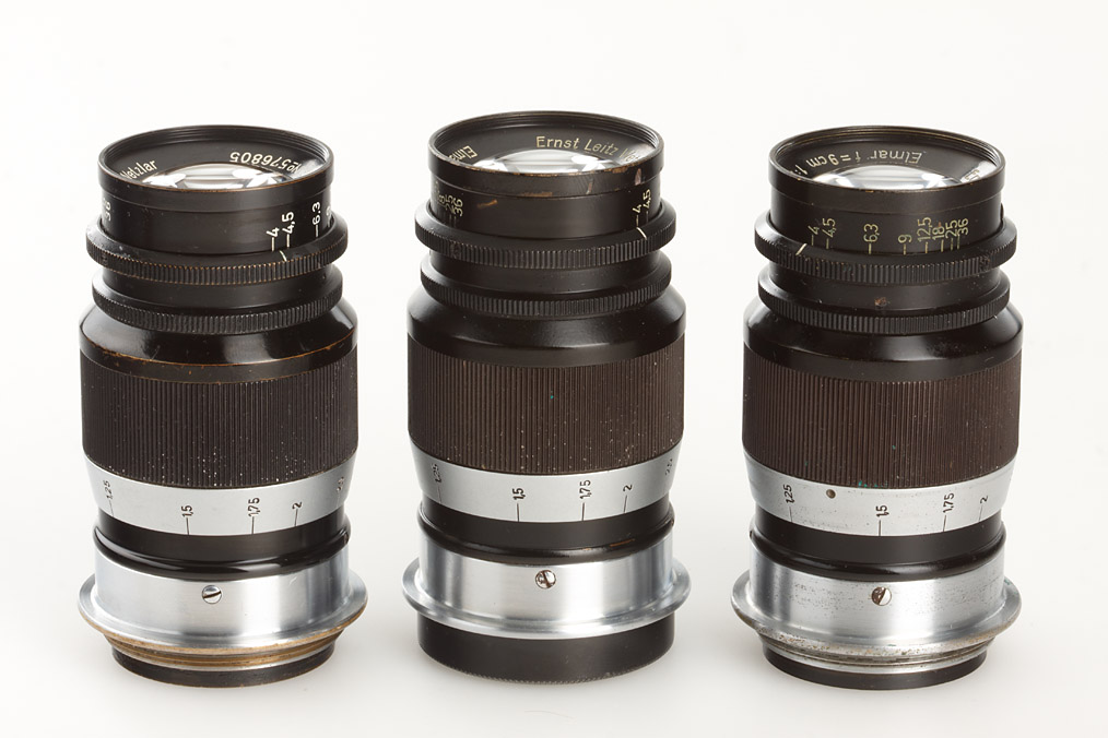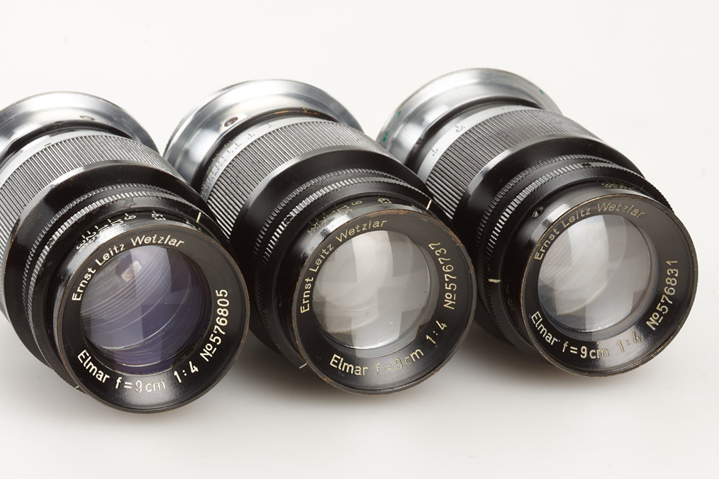 three wartime Elmar 9cm lenses: (1) no.576737 (meter scale, caps, brown bakelite keeper), (2) no.576805 (meter scale, cap, brown bakelite keeper), (3) no.576831 (meter scale), VIOOH lyre shape universal finder (4)