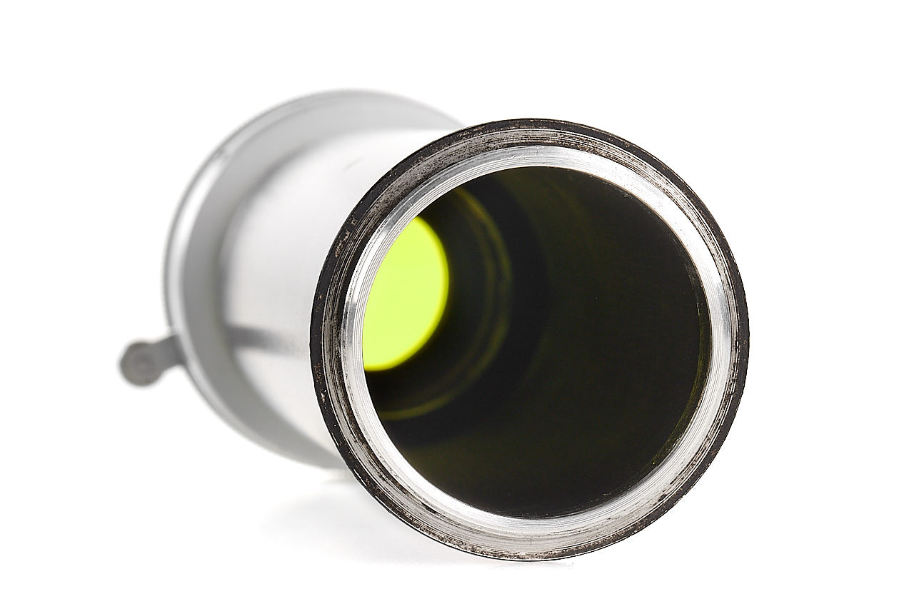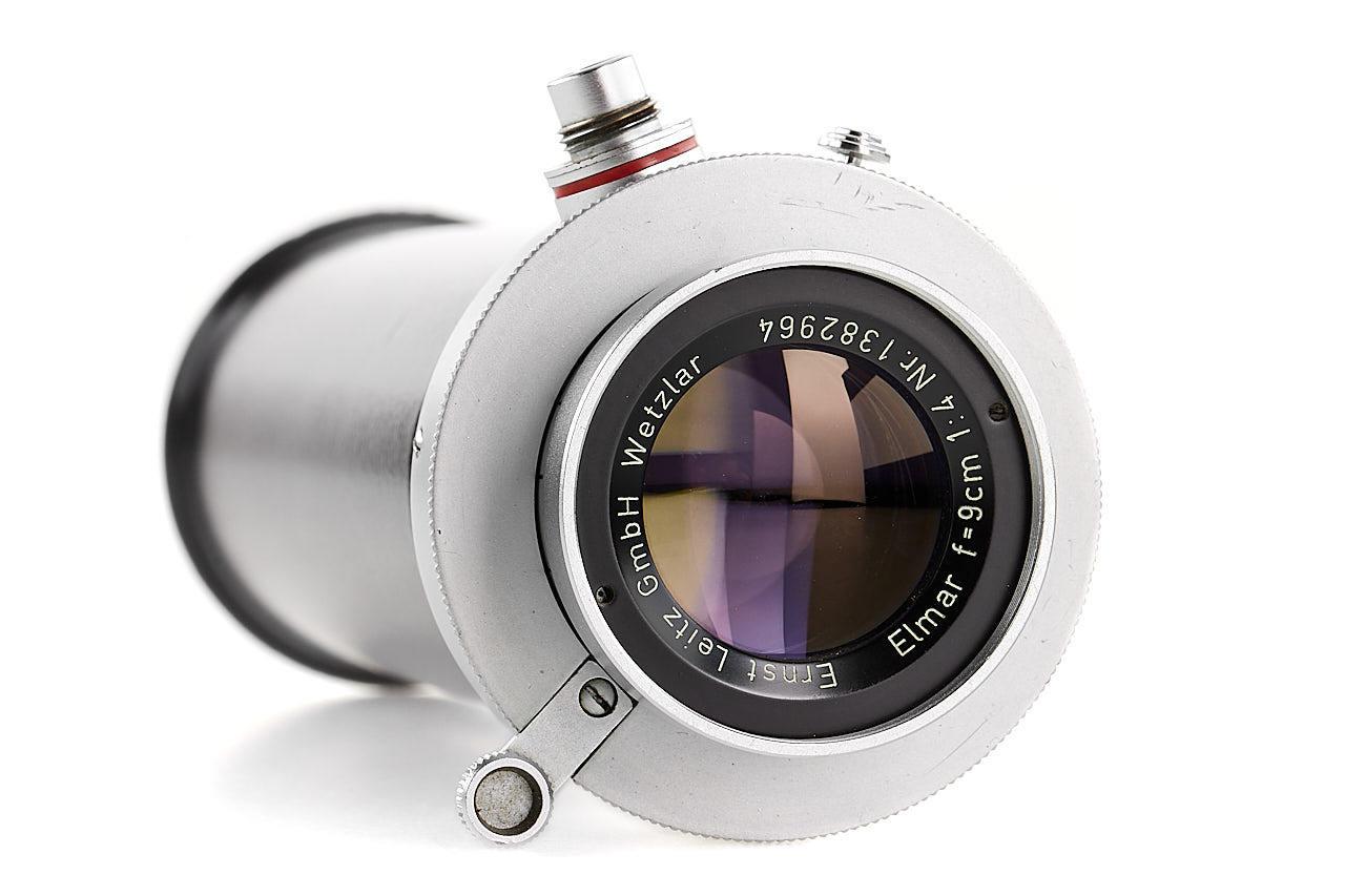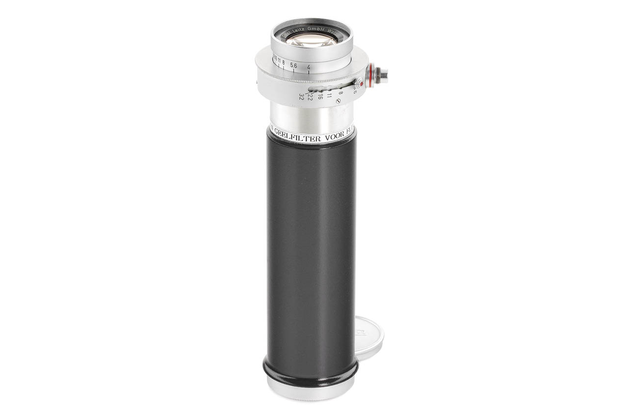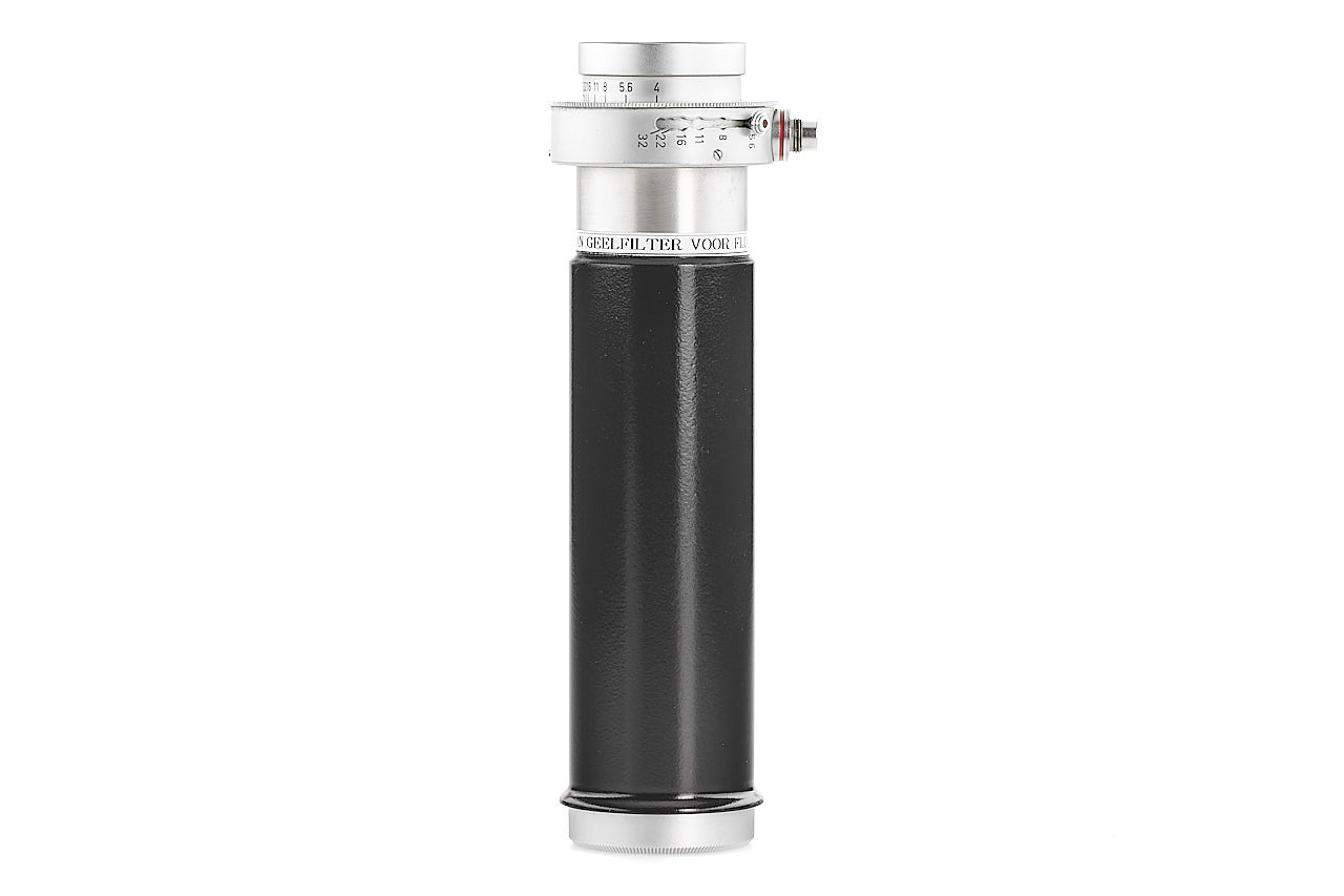 Rare Elmar in special ophthalmology mount for photography of the human eye, with quick aperture set, here with self-made macro tube (fixed yellow filter), optics showing some haze, (see Lager Vol. II p.127), note the sticker about the filter written in Dutch, with both caps.