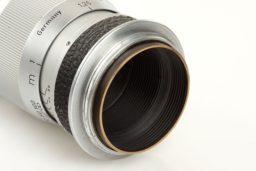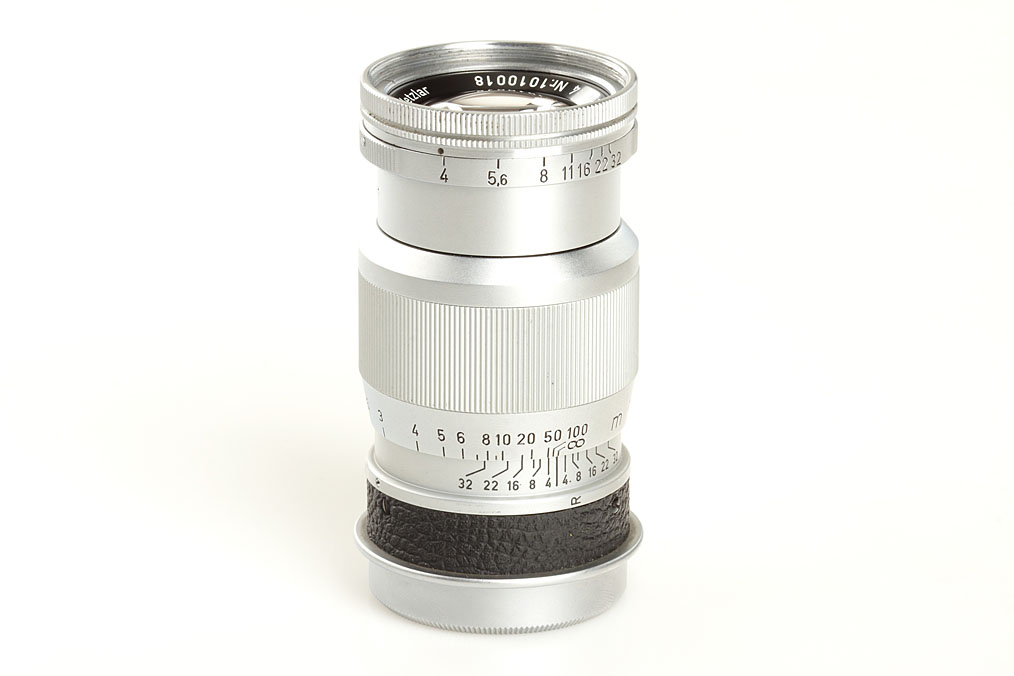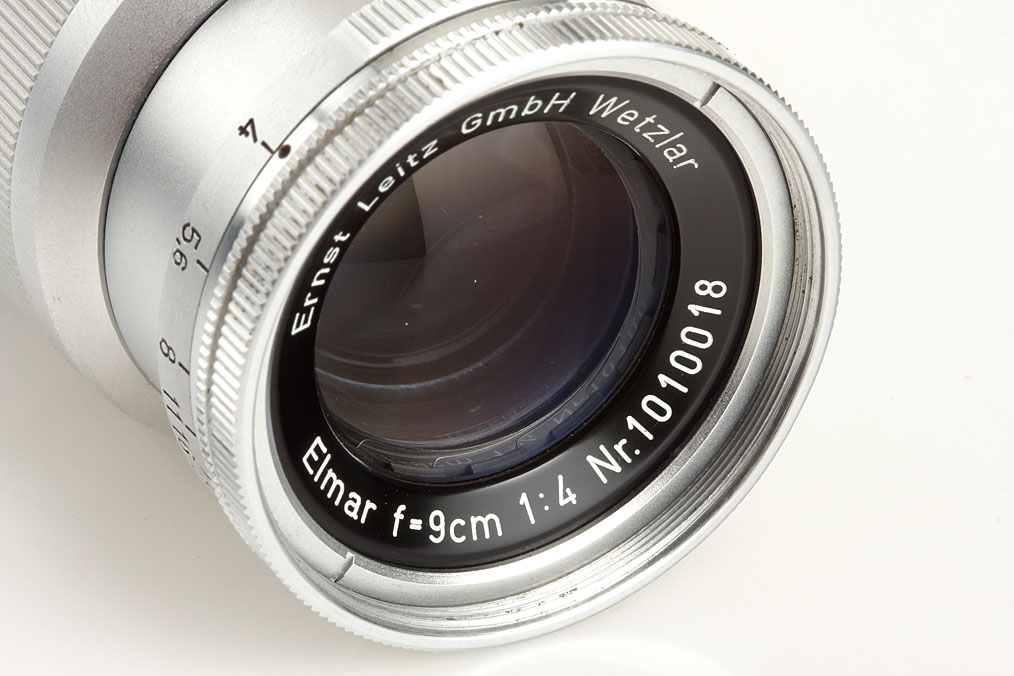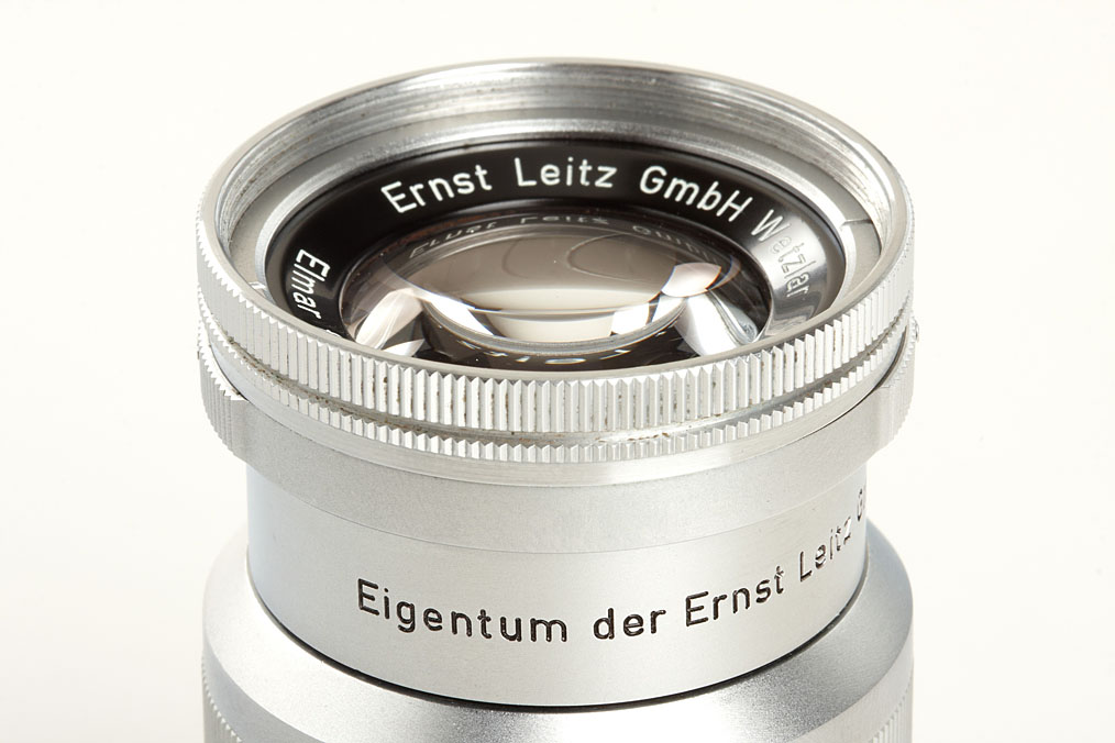 rare and unusual shaped 9cm Elmar fo screw mount, prototype of the 3-element Elmar engraved: 'Eigentum der Ernst Leitz GmbH Wetzlar', from a small batch of approx. 50 lenses, a similar lens is illustrated in Lager II, page 126, in mint condition with both caps