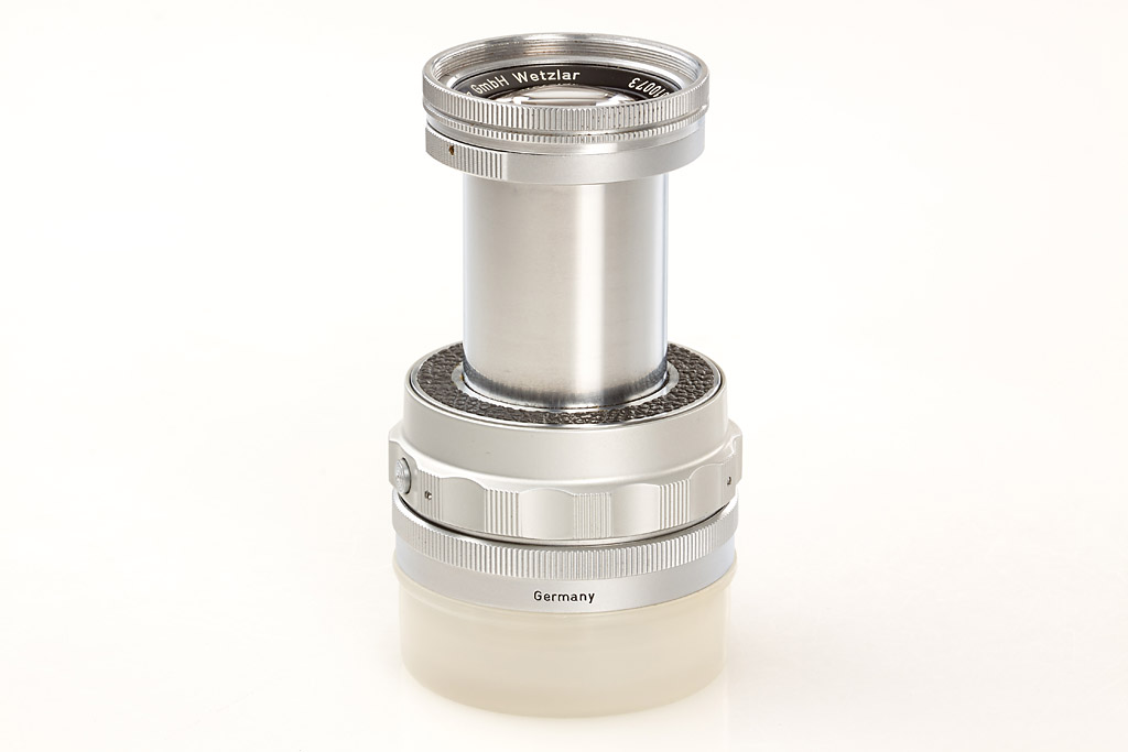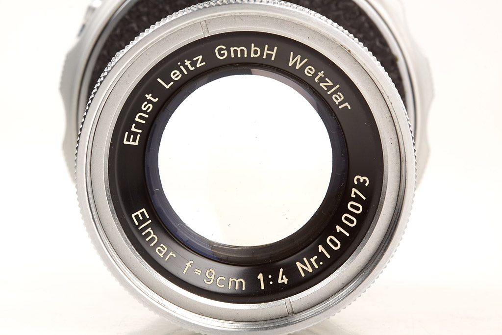 rare collapsible 9cm Elmar for M, prototype of the 3-element Elmar from a small batch of approx. 50 lenses, similar lenses are illustrated in Hasbroeck, Leica in Colour, p.133, in near mint condition with white rear cap and front cap