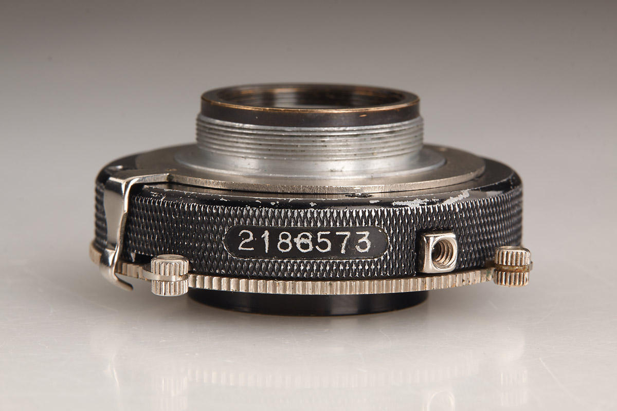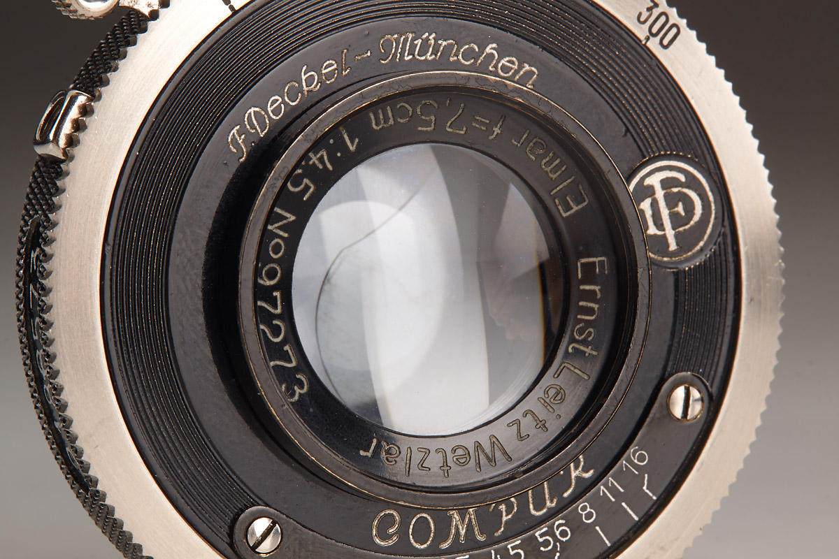 Extremely rare 7.5 cm Leitz Elmar f/4.5 in good working condition. Compur-shutter (code OBDUL) with clean optics. LITERATURE Leitz Photo Objektive, Liste Photo 7188c, April 1933, p. 6. The Leitz company produced photographic lenses even before Oskar Barnack designed the UR-Leica in 1914. The first photographic lens made by Leitz was the 220 mm Duplex in 1894, followed by early Periplan and Summar lenses, which were used in plate cameras of other manufacturers or early Leitz micro- and macrophotographic units. Even after the introduction of the Leica, Leitz continued to supply photographic lenses for other companies. One well known example is the 5 cm Leitz Elmar lense for the Nagel Pupille. An existing Leitz brochure from April 1933 lists individual photographic lenses. Interestingly, these include a few focal length and/or largest apertures which did not exist in this combination as Leica lenses at the time. Those lenses were offered for other cameras only and are extremely rare. Some of those listed in that brochure have never even been seen. The lenses were offered each in different mounts, of which one always was mounted in a Compur-shutter. The 7.5 cm Leitz Elmar f/4.5 lens seems to have been produced in a very small number only. Interestingly, the price sheet of the 1933 leaflet quotes a price of RM 72.00 and defines the value of one German Reichsmark (RM) as equivalent to 1/2790 kg (0.36 g) fine gold. Fotografische Objektive wurden von der Firma Leitz schon vor der Konstruktion der Oskar Barnackschen UR-Leica im Jahr 1914 produziert. Das erste fotografische Leitz Objektiv war das Duplex 200 mm im Jahr 1894, gefolgt von frühen Periplan und Summar Objektiven, die in Plattenkameras anderer Hersteller zum Einsatz kamen, sowie in frühen mikro- und makrofotografischen Einrichtungen von Leitz. Auch nach der Einführung der Leica lieferte Leitz Objektive an andere Firmen. Ein bekanntes Beispiel dazu ist das Elmar 5 cm Objektiv in der Nagel Pupille. Vom April 1933 existiert eine Leitz Druckschrift, in der verschiedene fotografische Objektive aufgelistet sind. Interessanterweise finden sich darunter Brennweiten und Kombinationen von Brennweite und Lichtstärke, die es als Leica Objektive so zu dieser Zeit nicht gab. Diese Objektive wurden nur für andere Kameraanbieter hergestellt und sind extrem selten. Einige davon sind bis heute nie aufgetaucht. Die Objektive wurden jeweils in verschiedenen Fassungen angeboten, wobei eine Fassung jeweils ein Compurverschluss war. Das Elmar 1:4,5/7,5 cm ist überhaupt wohl nur in einer sehr kleinen Stückzahl gefertigt worden. Interessanterweise ist in der Preisliste zu der Broschüre von 1933 das Objektiv mit 72,- RM und der Wert einer Reichsmark (RM) mit einem 1/2790 kg (0,36 g) Feingold angegeben.