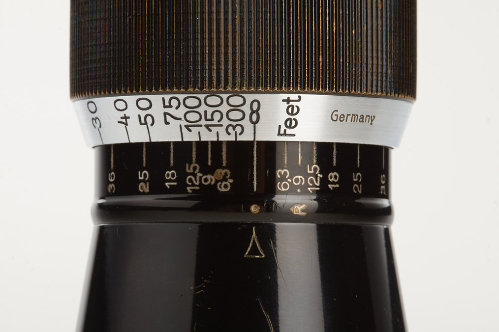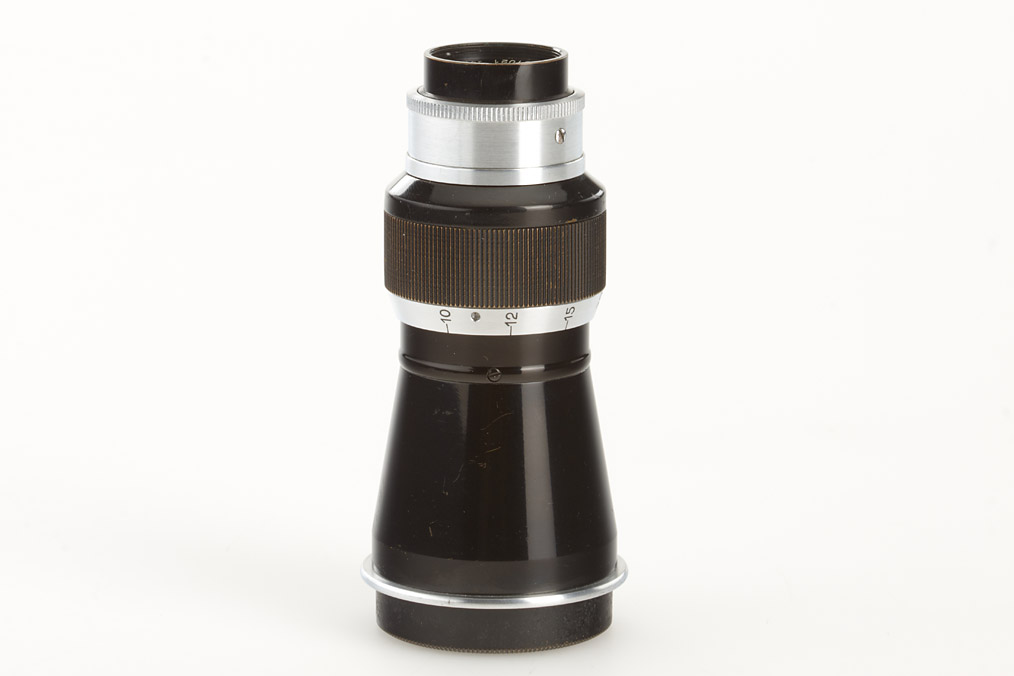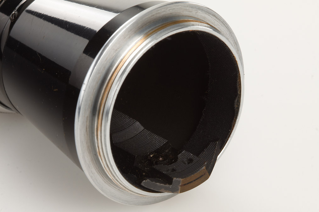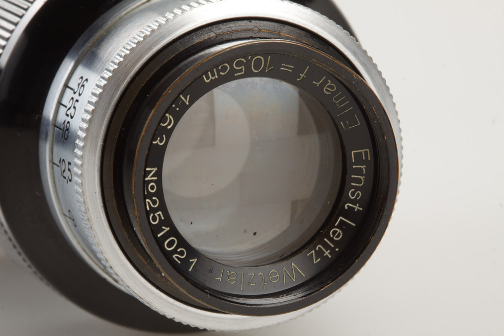 black/chrome Mountain-Elmar in fine condition, very clean lenses, with both caps and original hood
