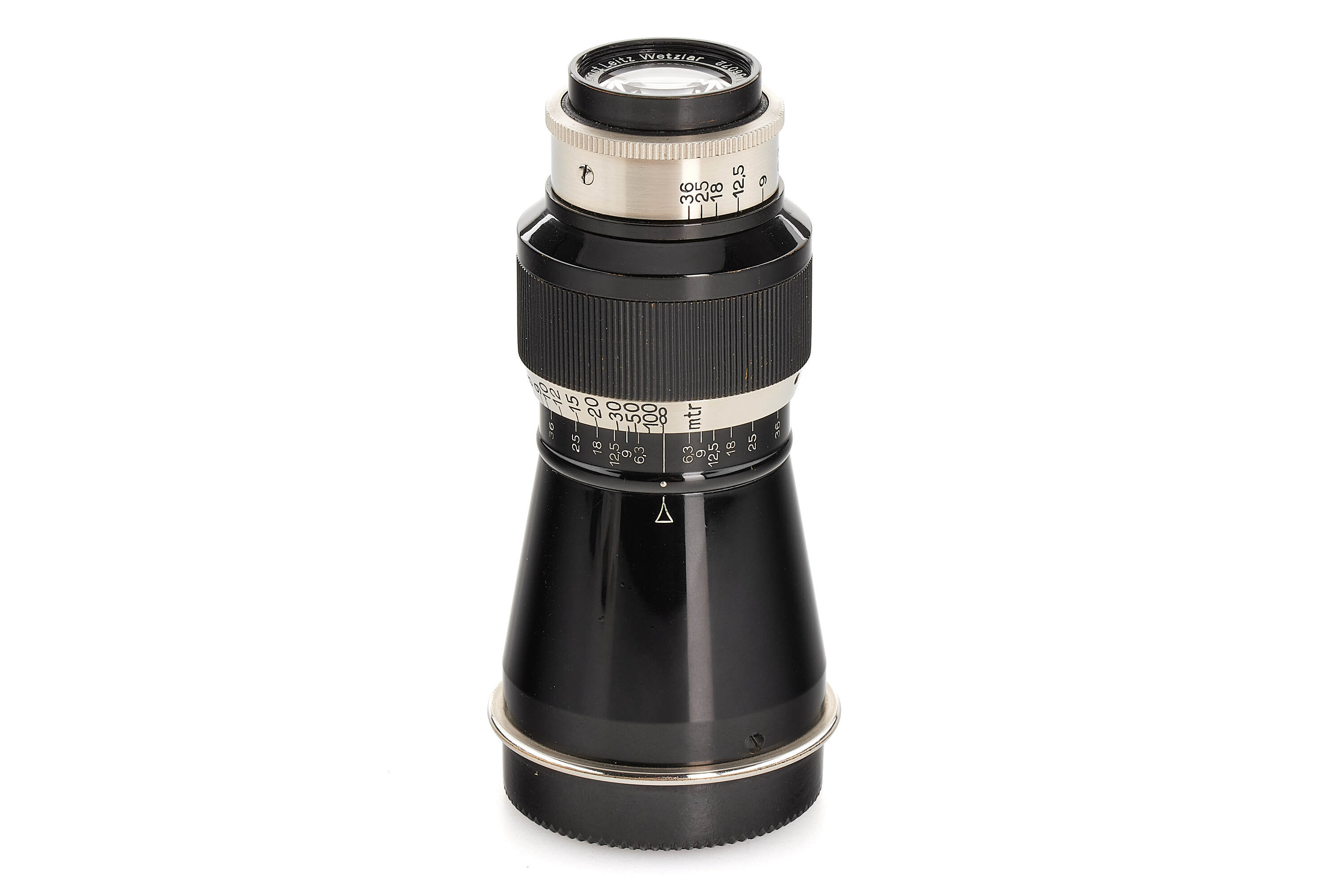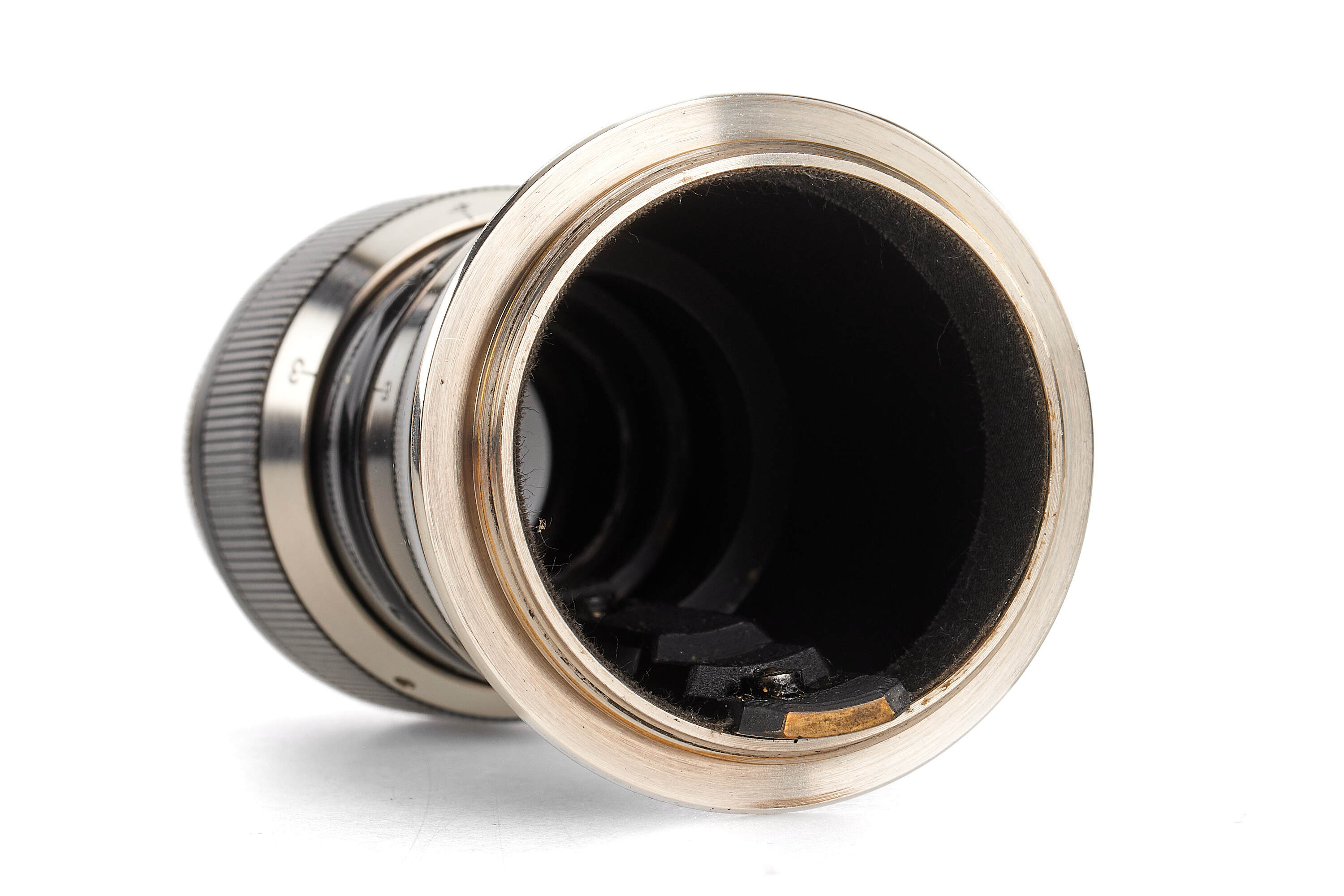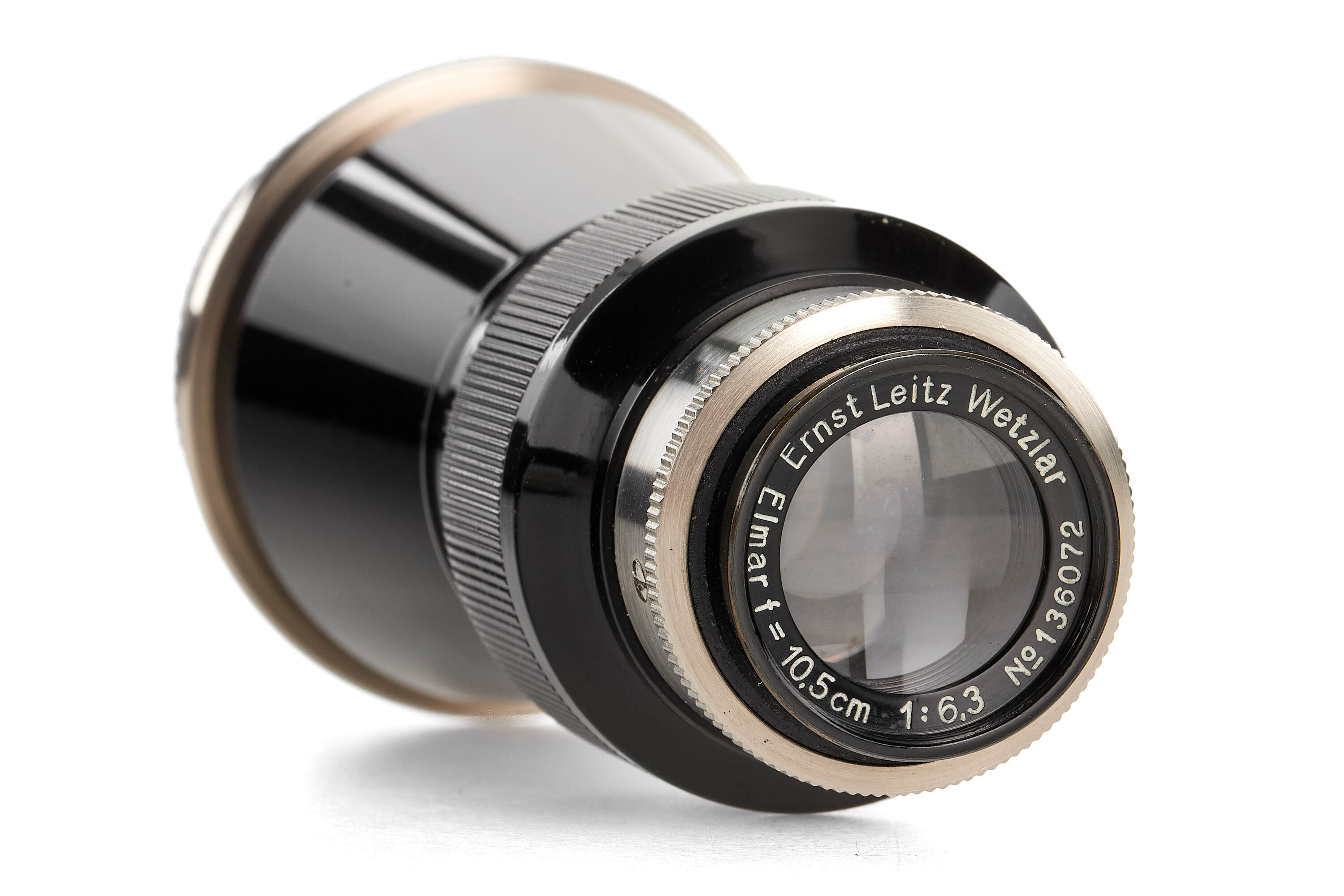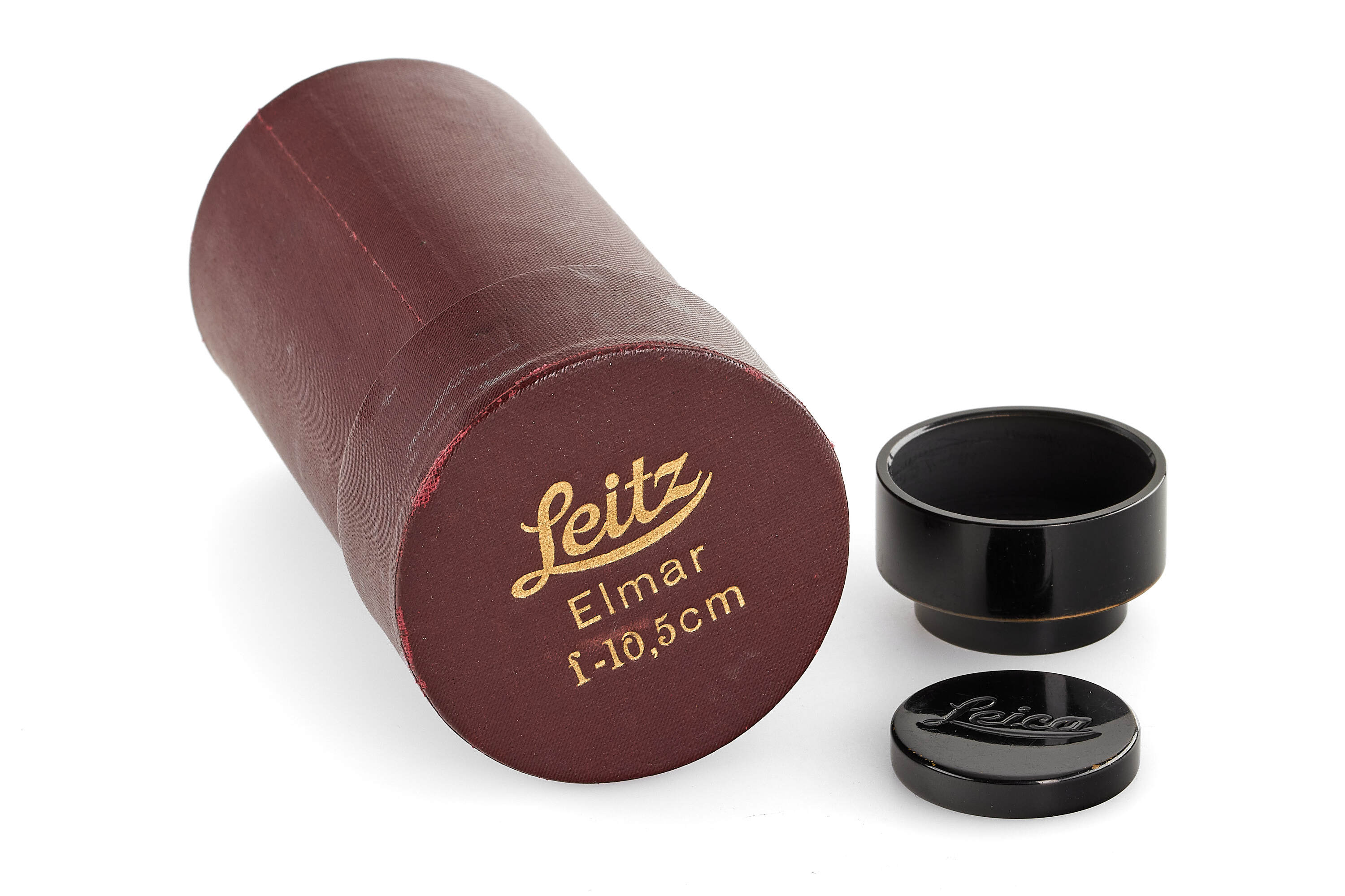 Beautiful early black/nickel 'Berg-Elmar' from the first year of production, in mint condition, clean and clear optics, with both original caps, hood and dark red maker's box, delivered to retailer Schaja on 25.08.1932, interesting to note, Leica records show that an Elmar 4/9cm 'fat' (Elang-Kup) with no.136072a has been delivered a year later!
