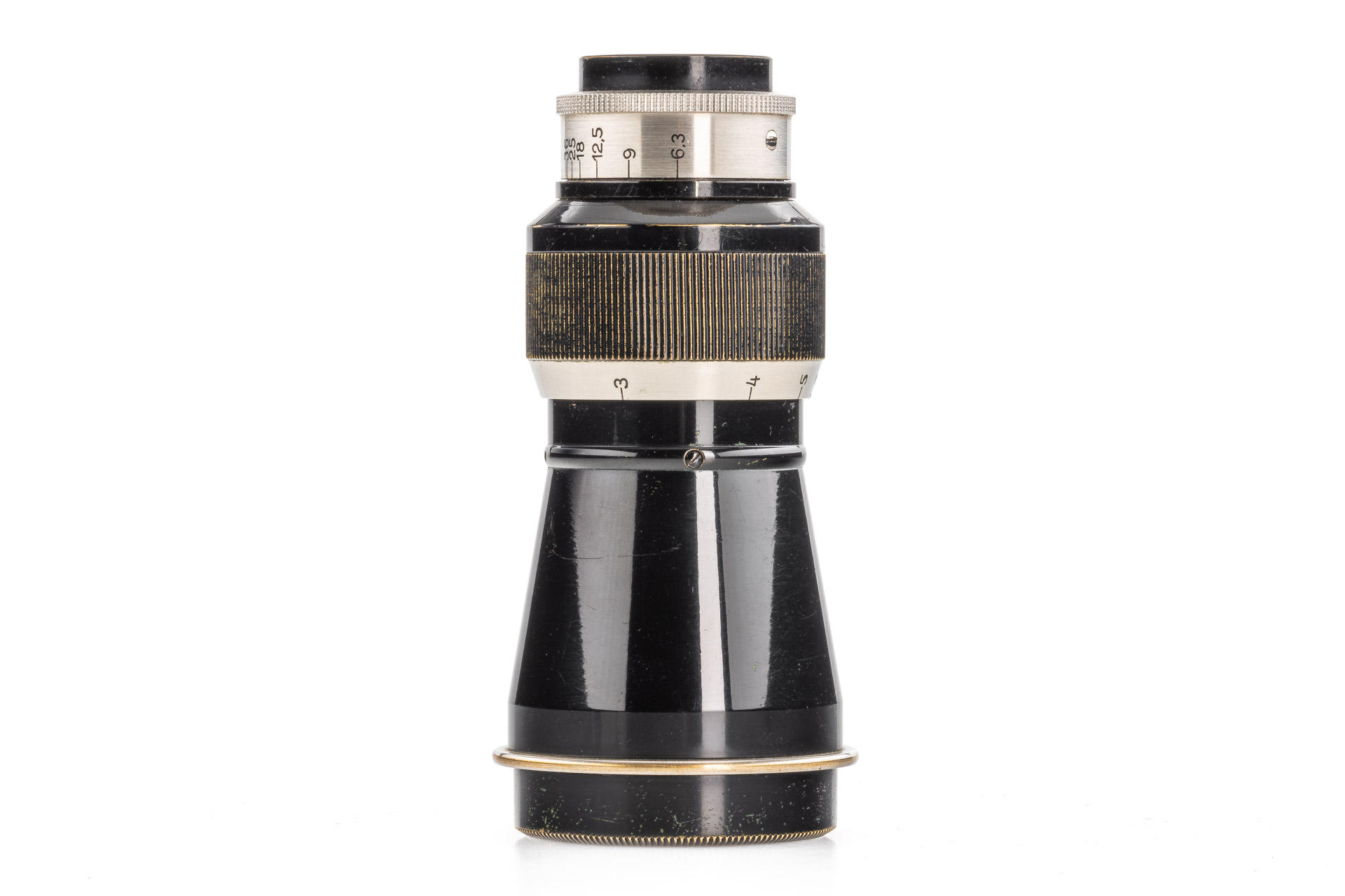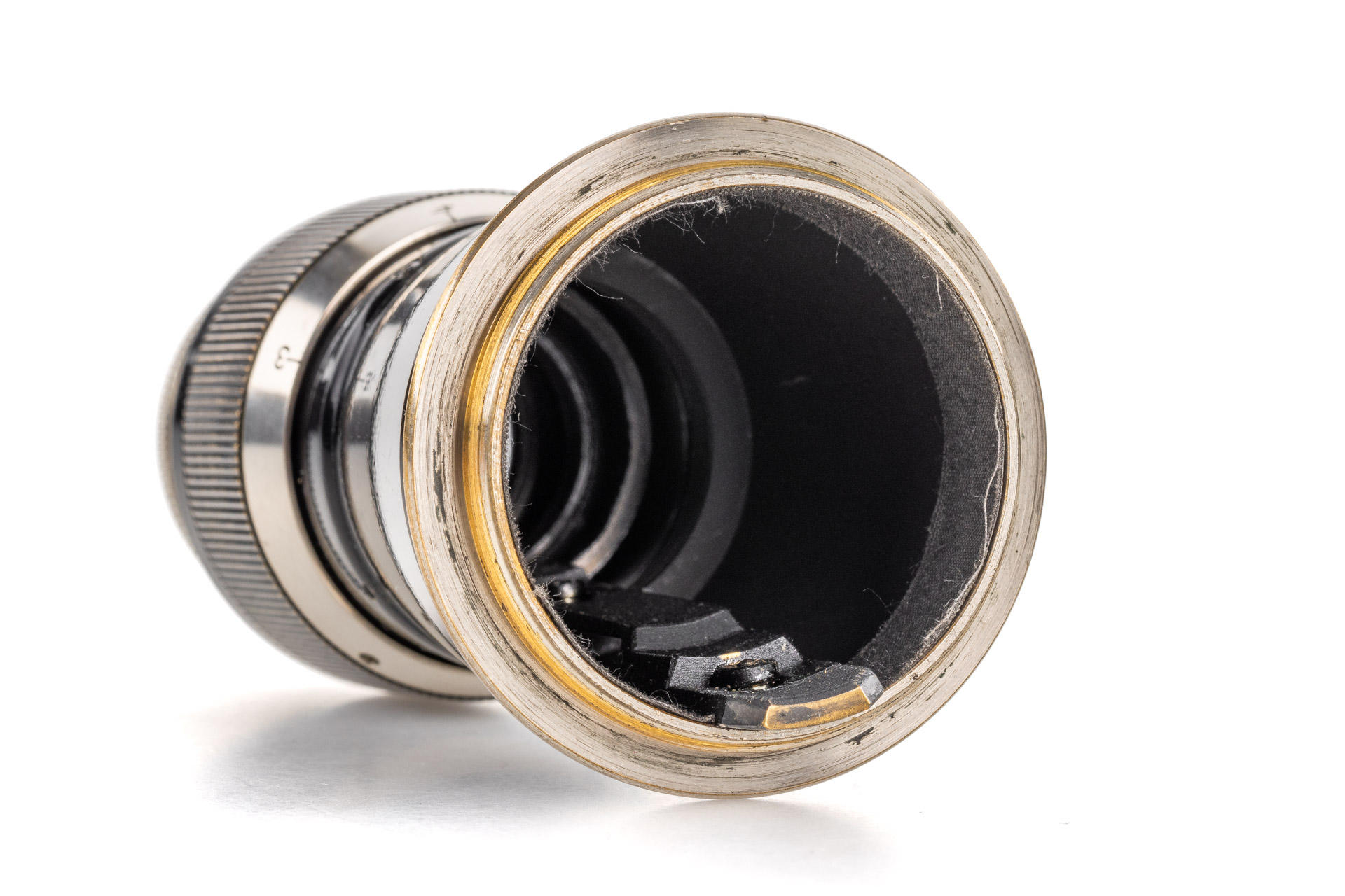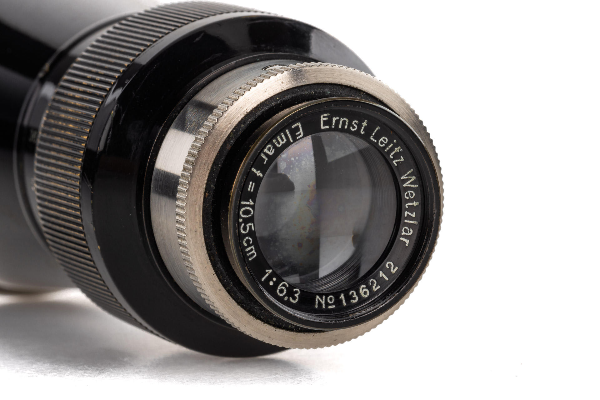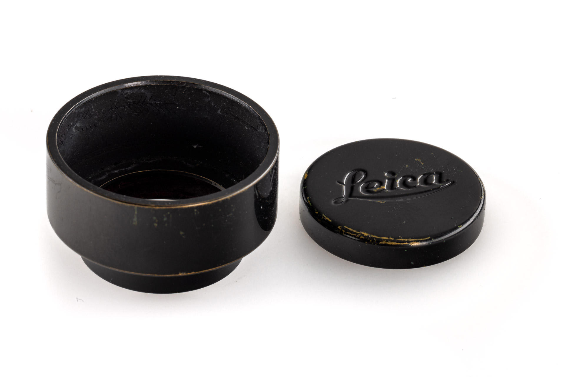 beautiful early 'Mountain Elmar' ELZEN in black/nickel finish, rangefinder coupled, in near mint condition, clean and clear optics, with original hood and both caps