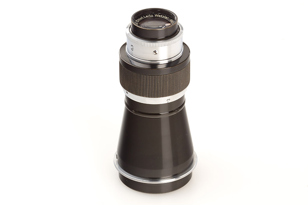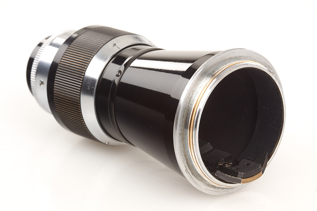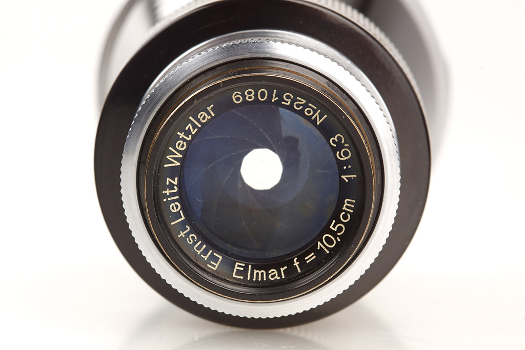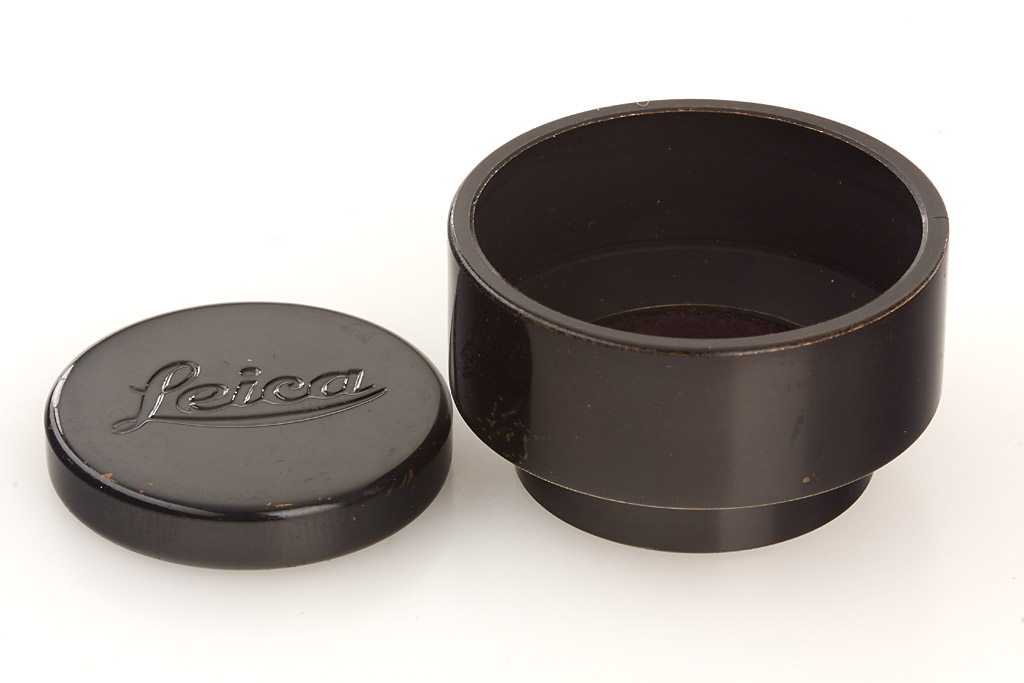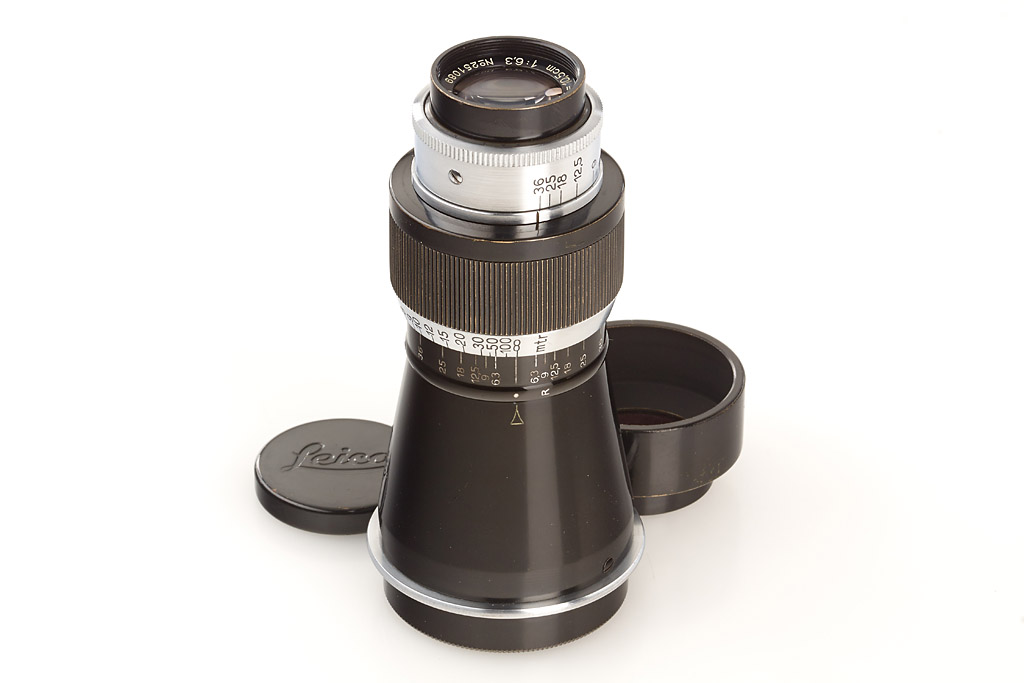 almost mint black/chrome Mountain-Elmar, coated lenses, complete with hood, both caps and red 'Elzenkup' maker's box