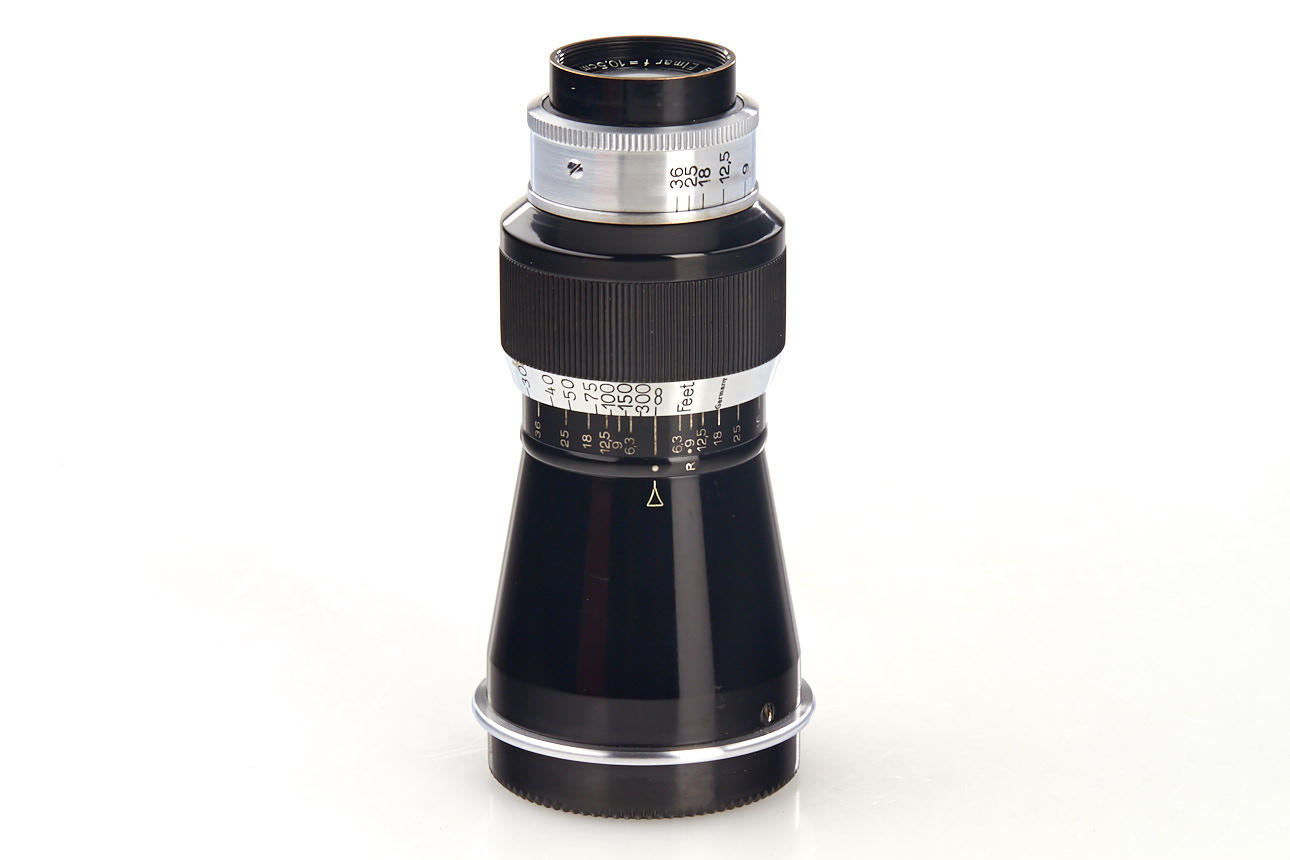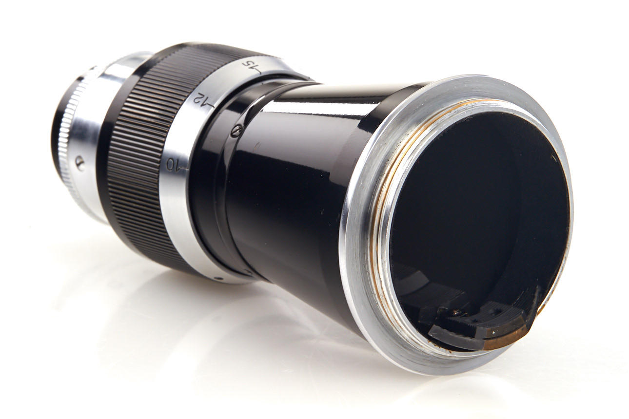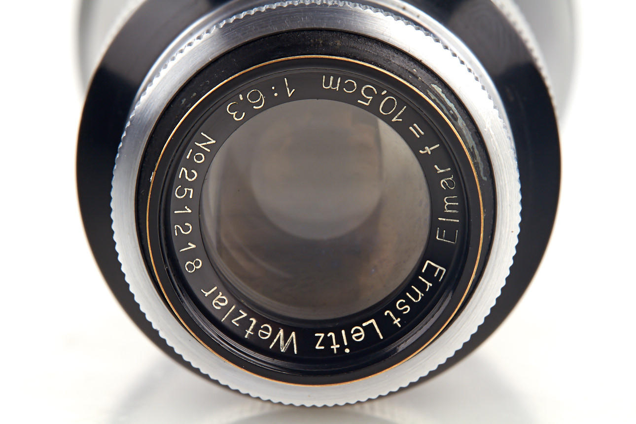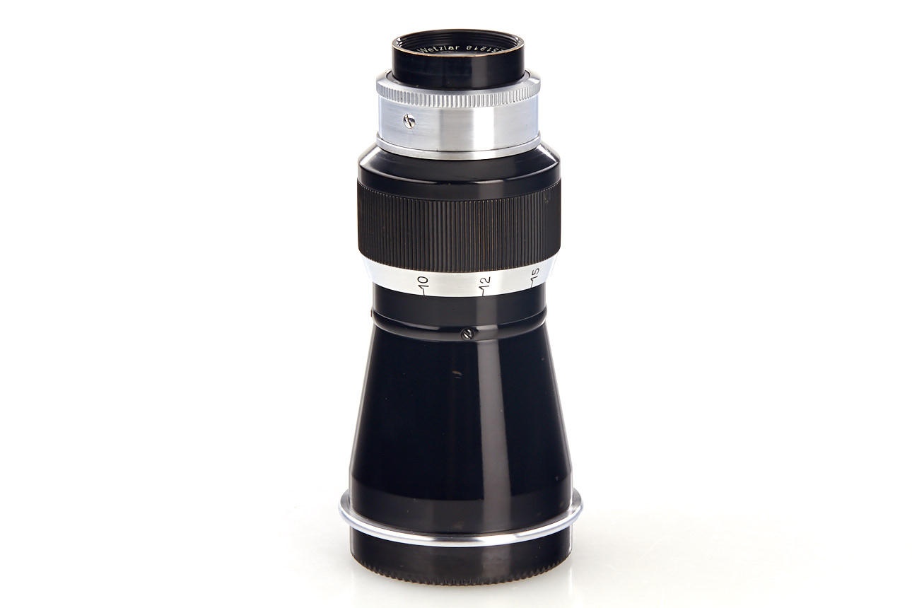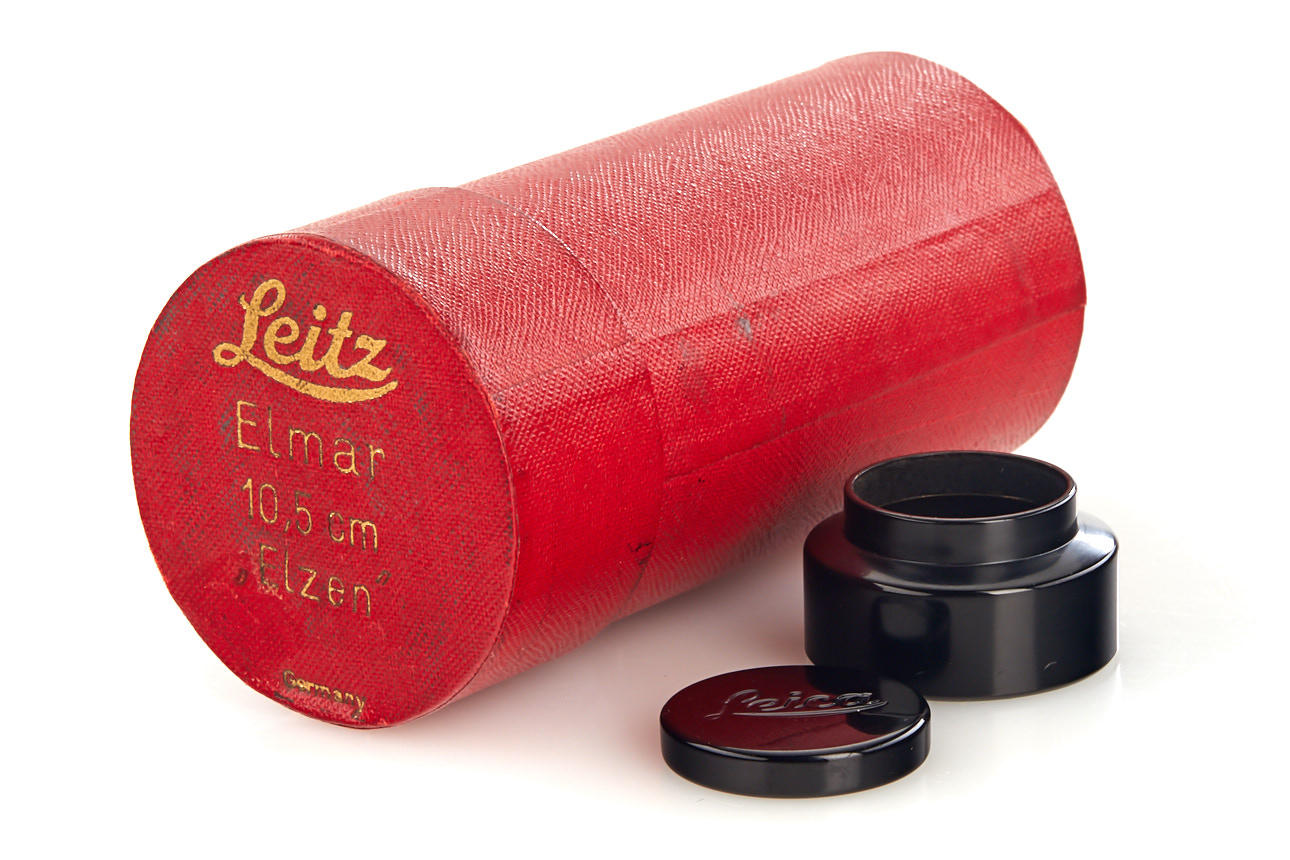 mint black/chrome Mountain-Elmar, clean lenses, complete with hood, both caps and red 'Elzen' red maker's box