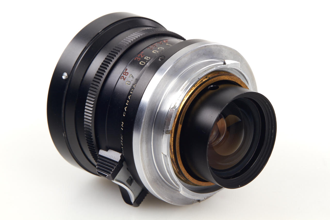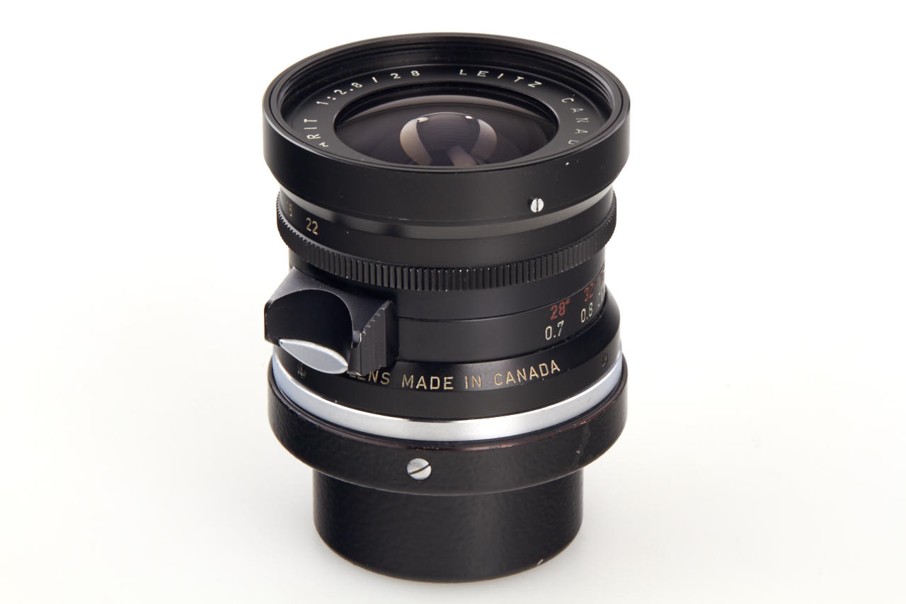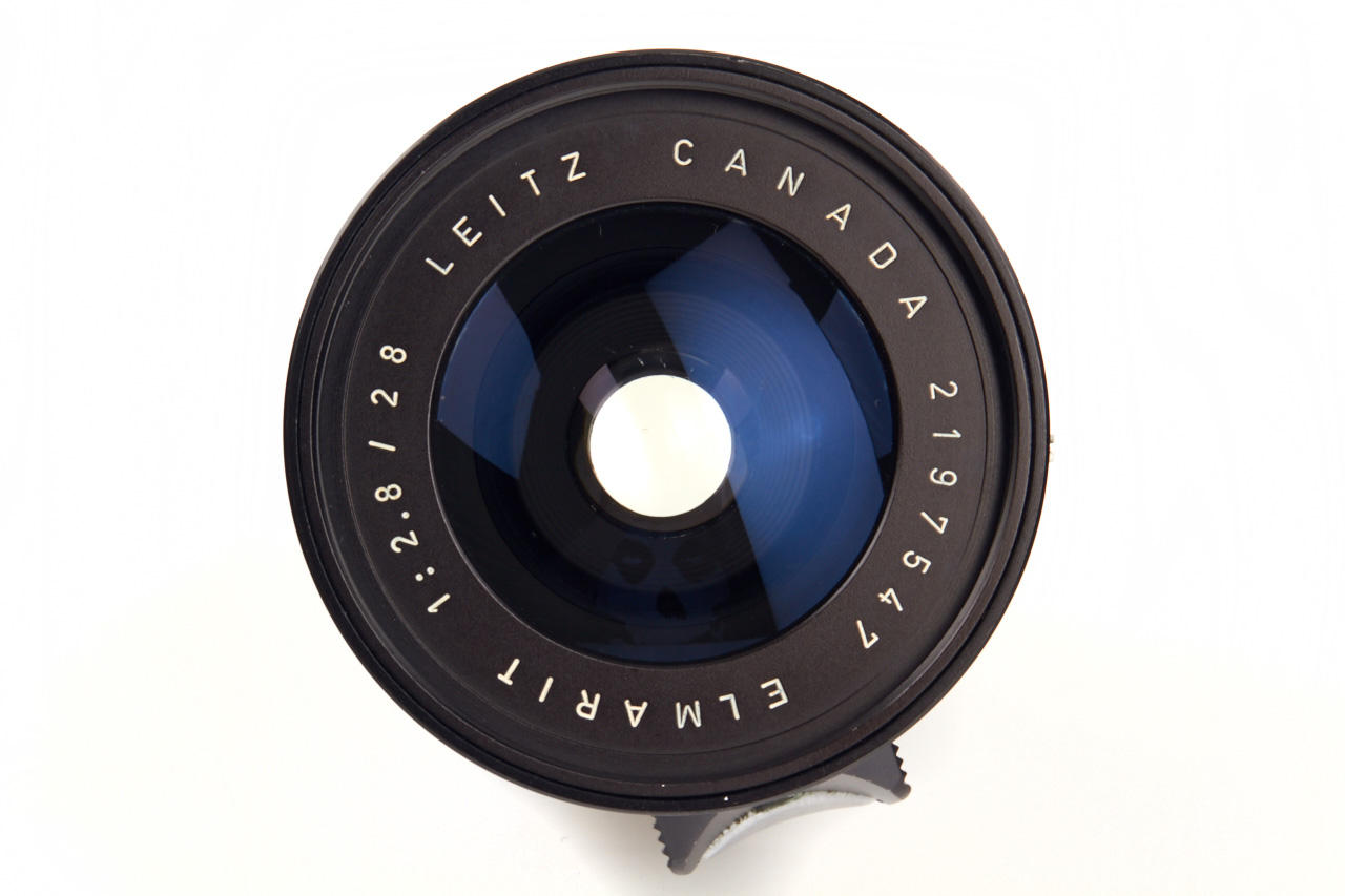 rare, first type Wetzlar Elmarit 28mm (9-element) with black paint infinity lock, in very good condition, with 12501M hood (cond. B-) and rear cap