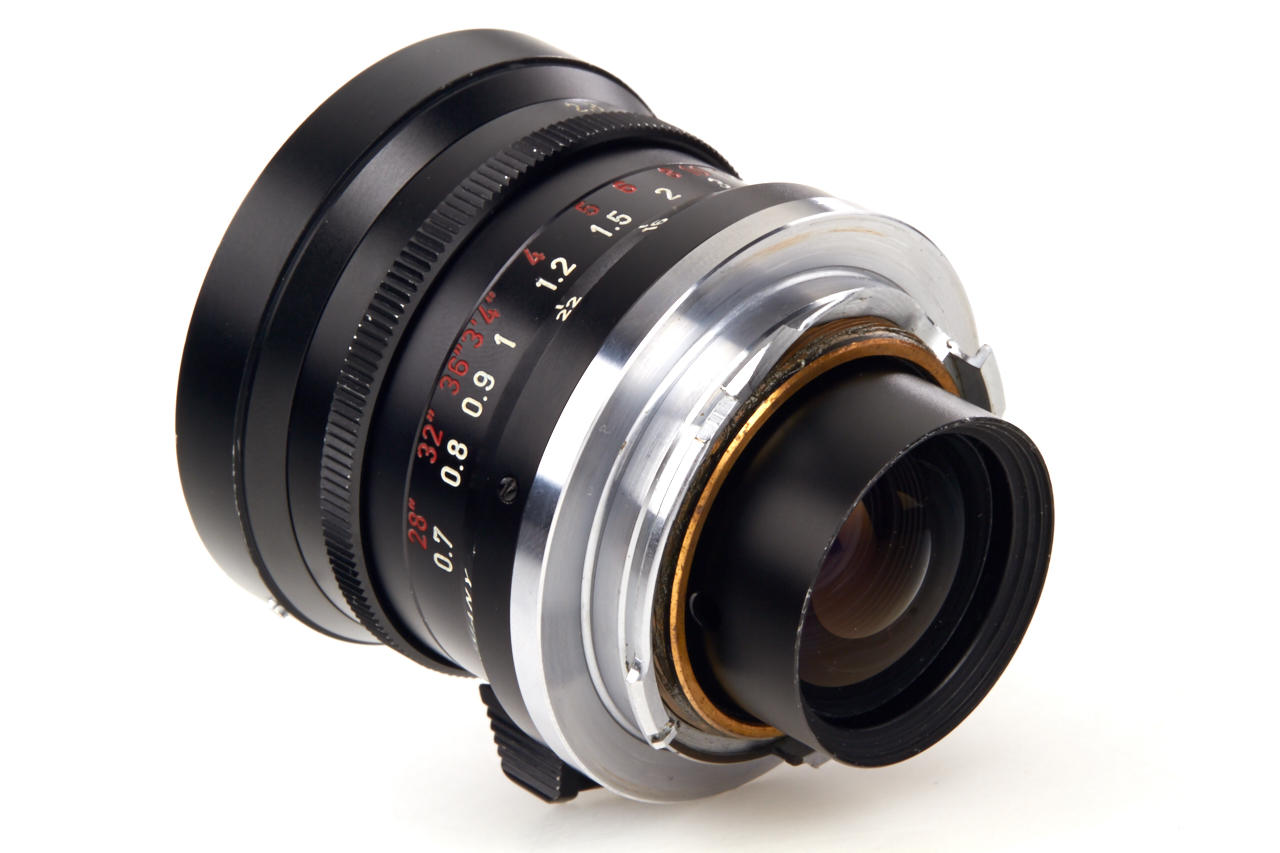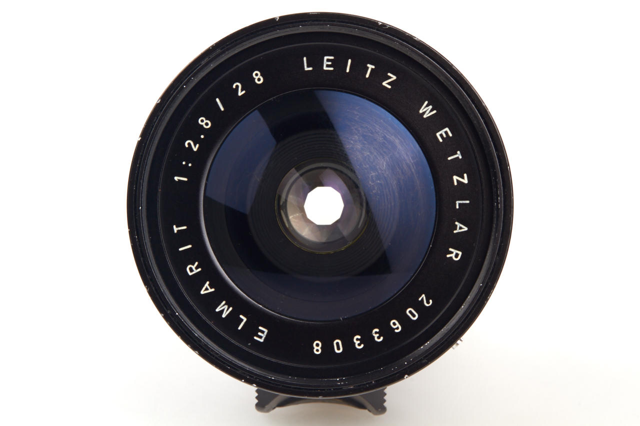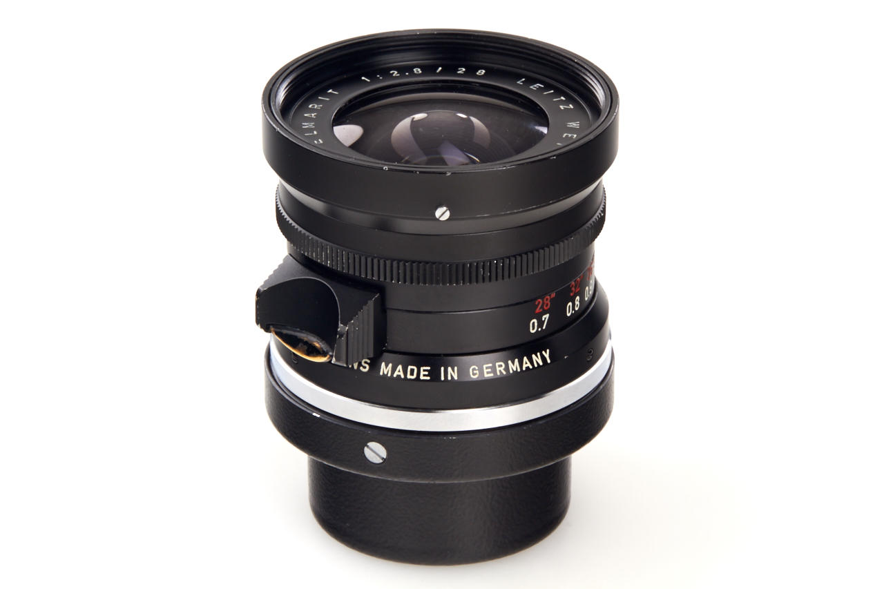 rare, first type Wetzlar Elmarit 28mm (9-element) with black paint infinity lock, in very fine condition (clean lenses), with 12501M hood (cond. B) and rear cap
