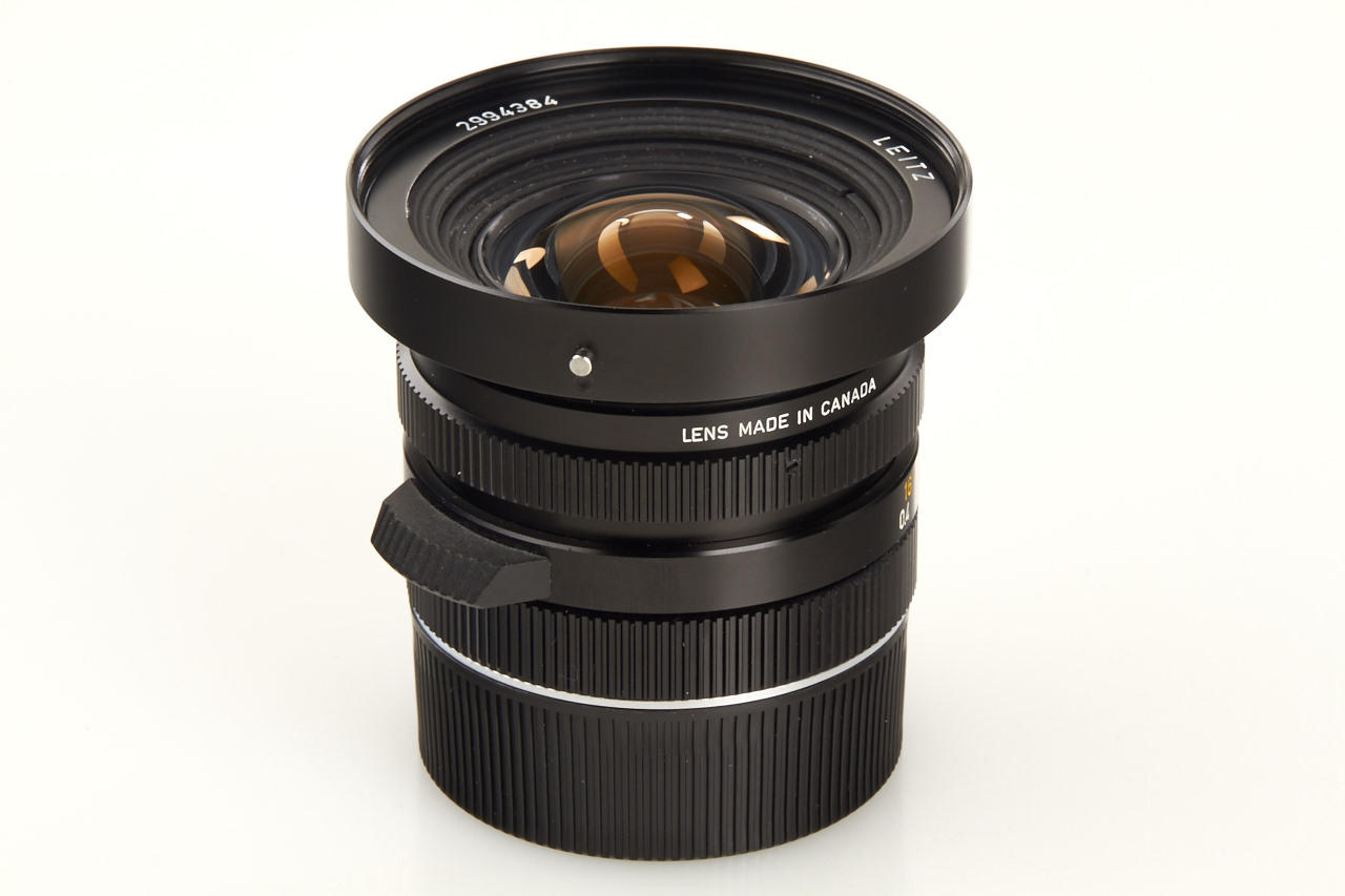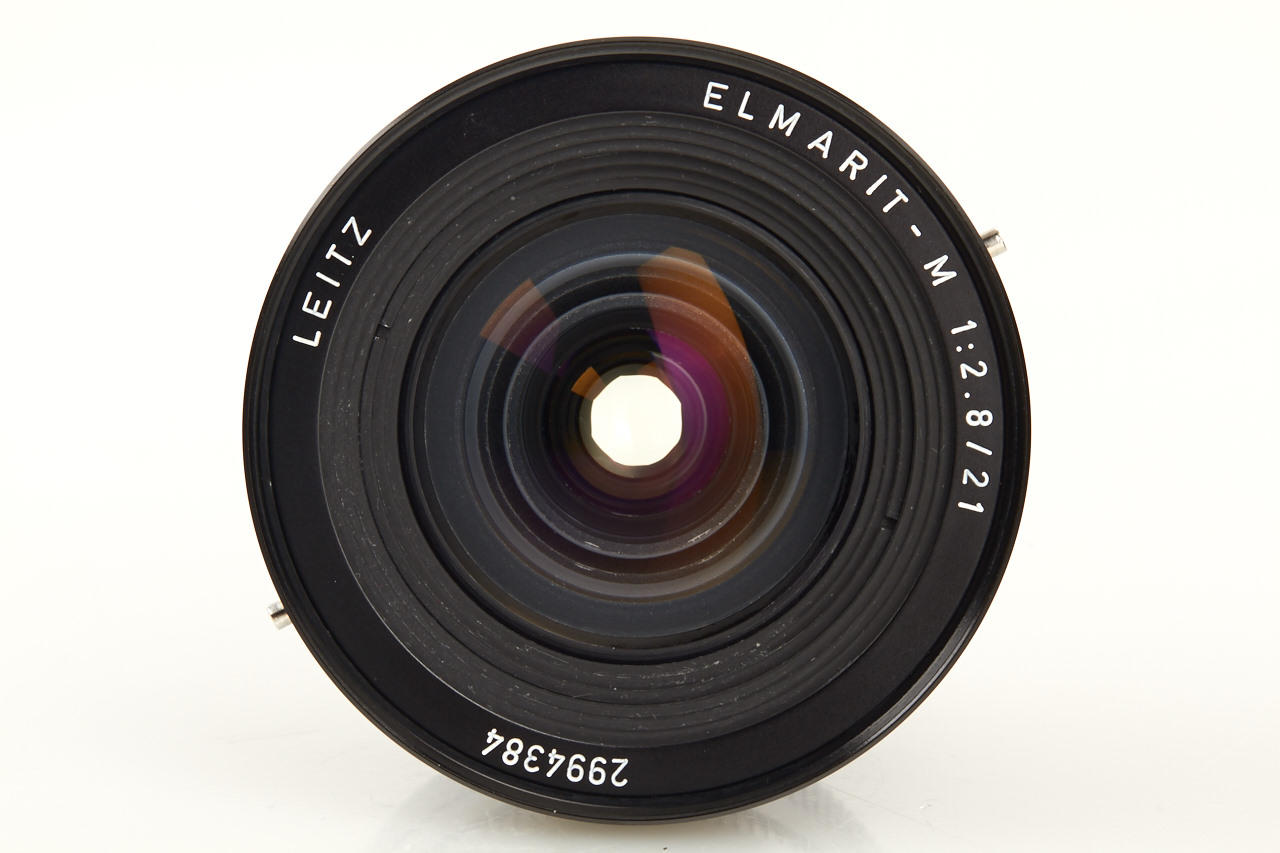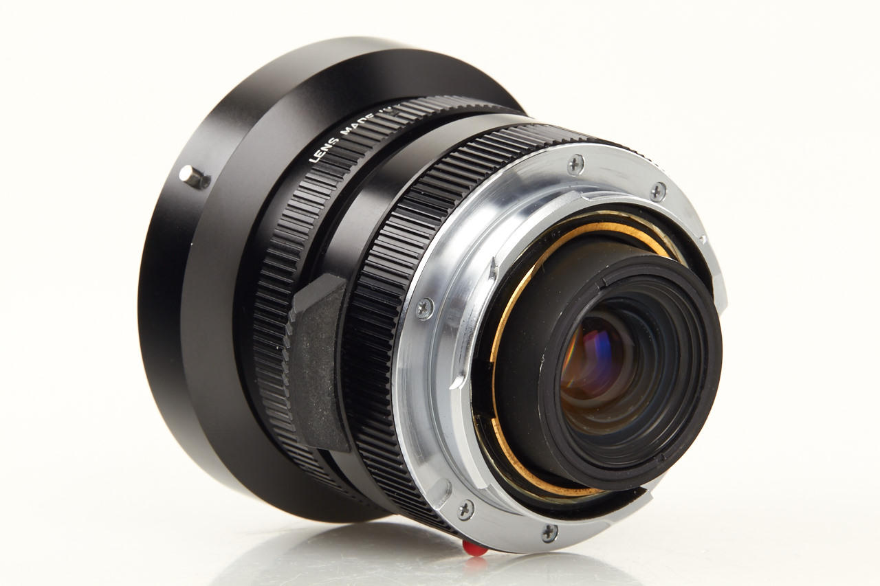 early and rare Elmarit-M with 0.4m focusing scale for E60 filter size, in mint condition, with serrated focus lever, for early lens hood 12537 with two cut outs, rear cap and front cap