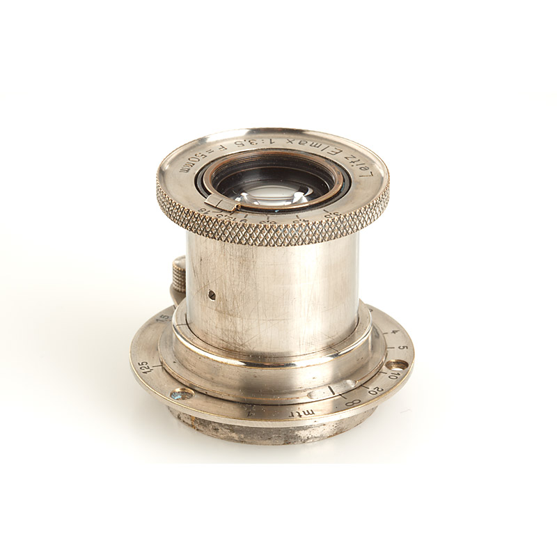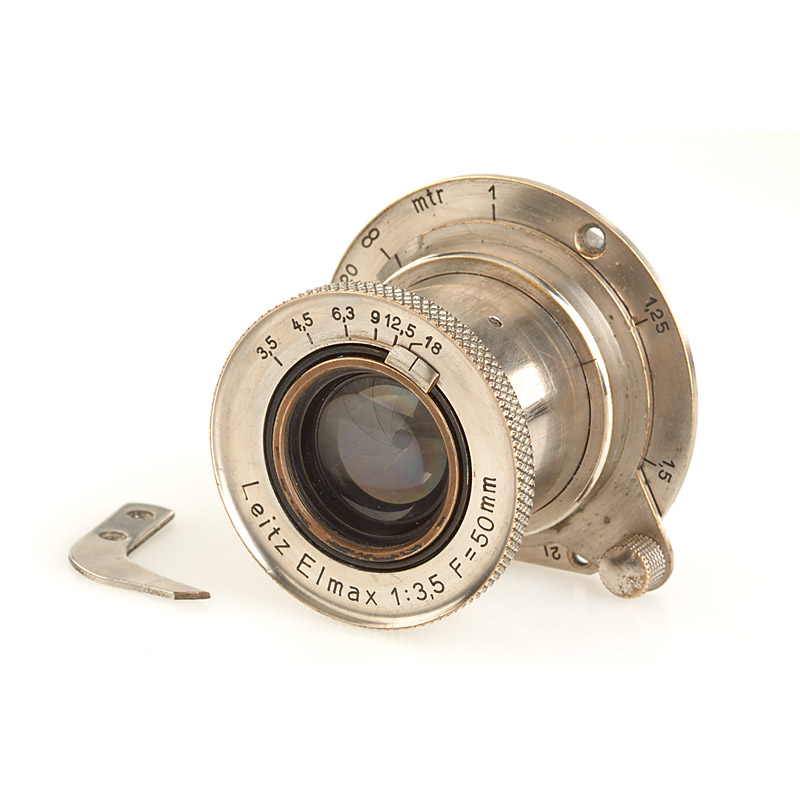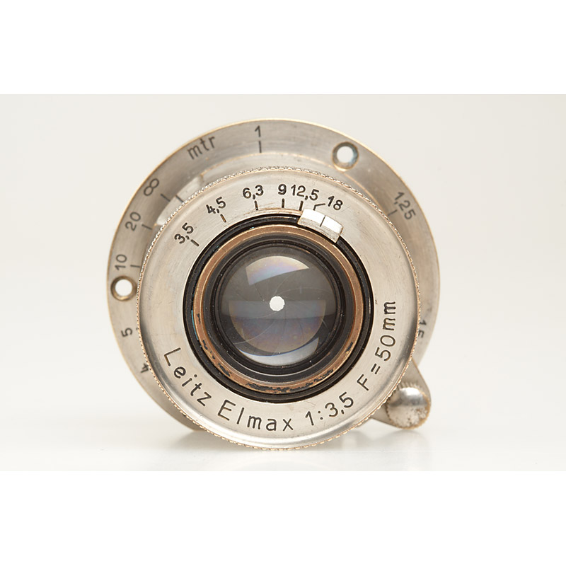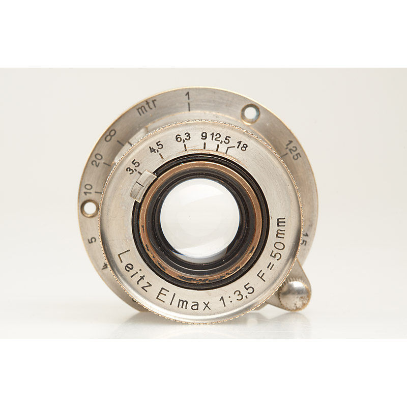 original 5-element lens engraved 'Elmax 1:3.5 F=50mm' from an early Elmax camera, with datum line, in original condition, with screws and angled spring, black painted cap