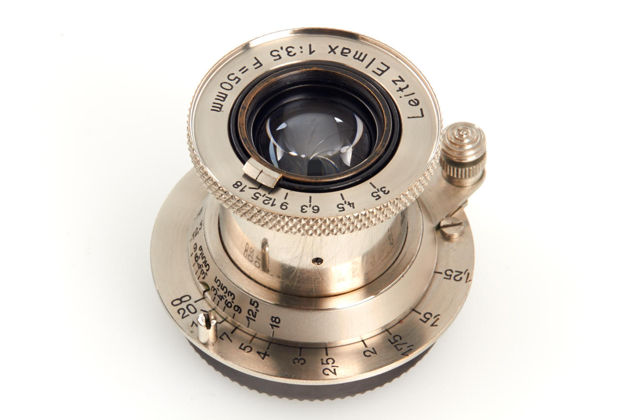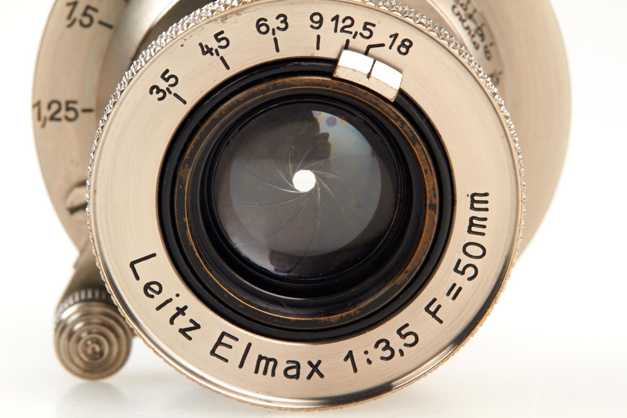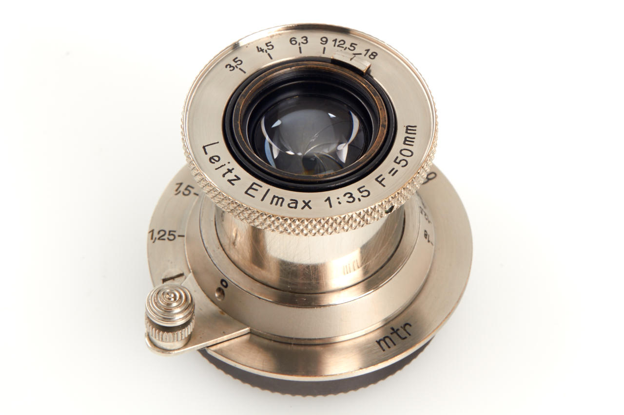 original 5-element lens engraved 'Elmax 1:3.5 F=50mm', originally from camera no.545, in RF coupled mount with meter scale, clean lenses, caps