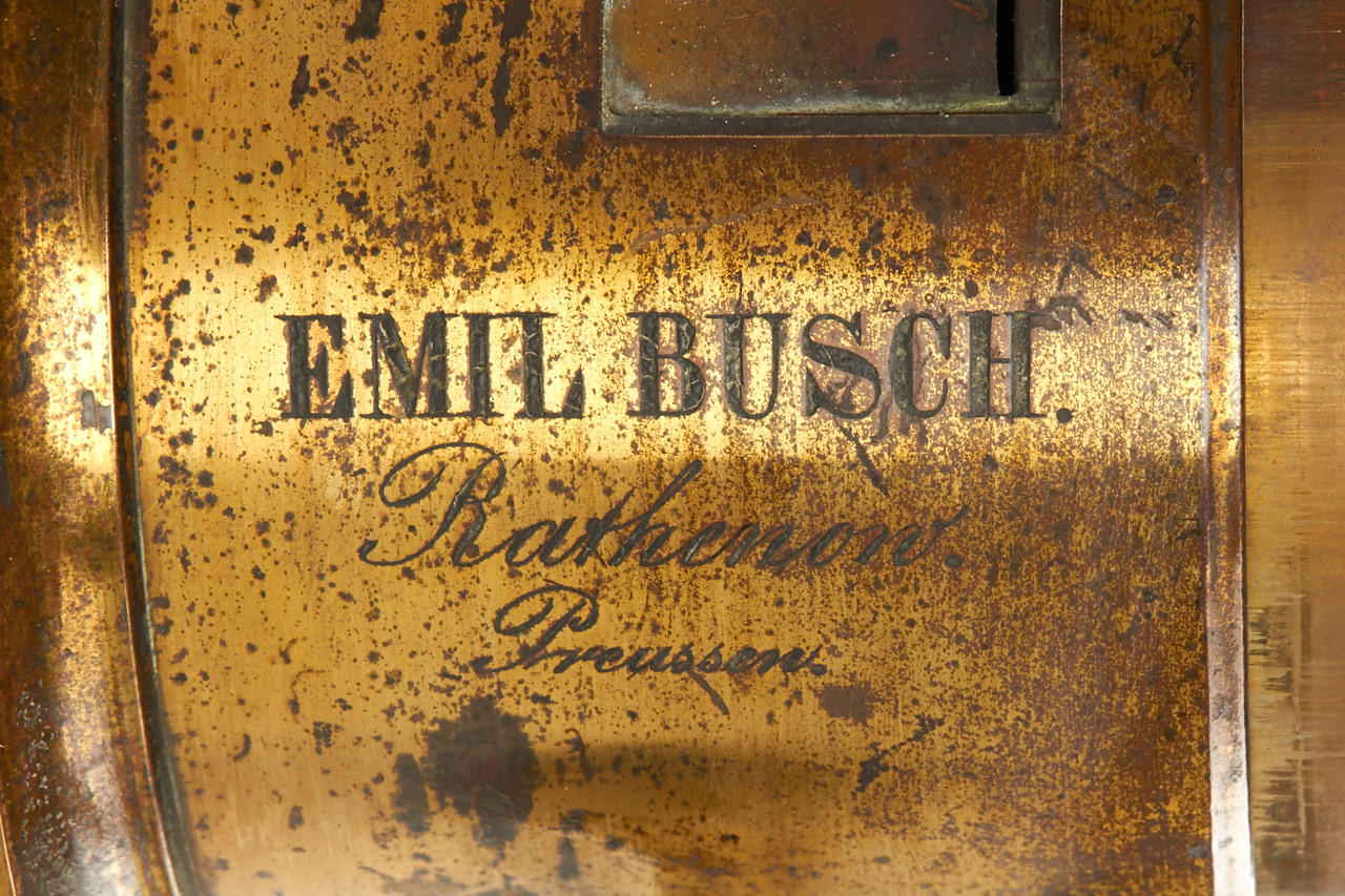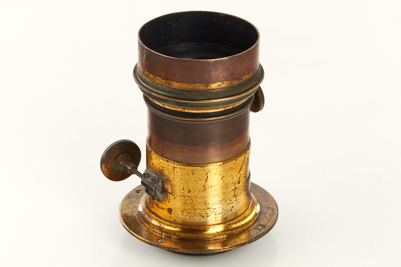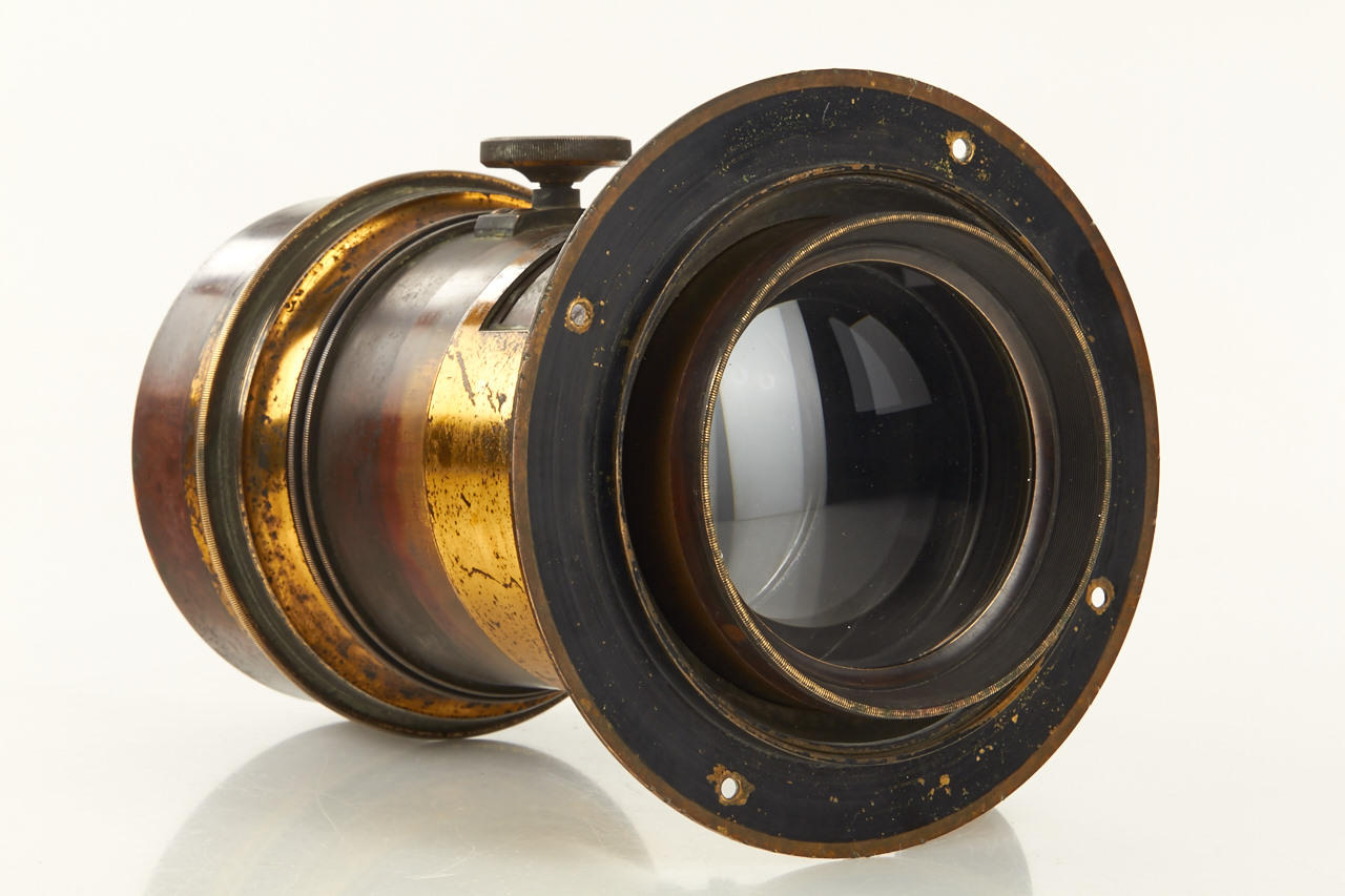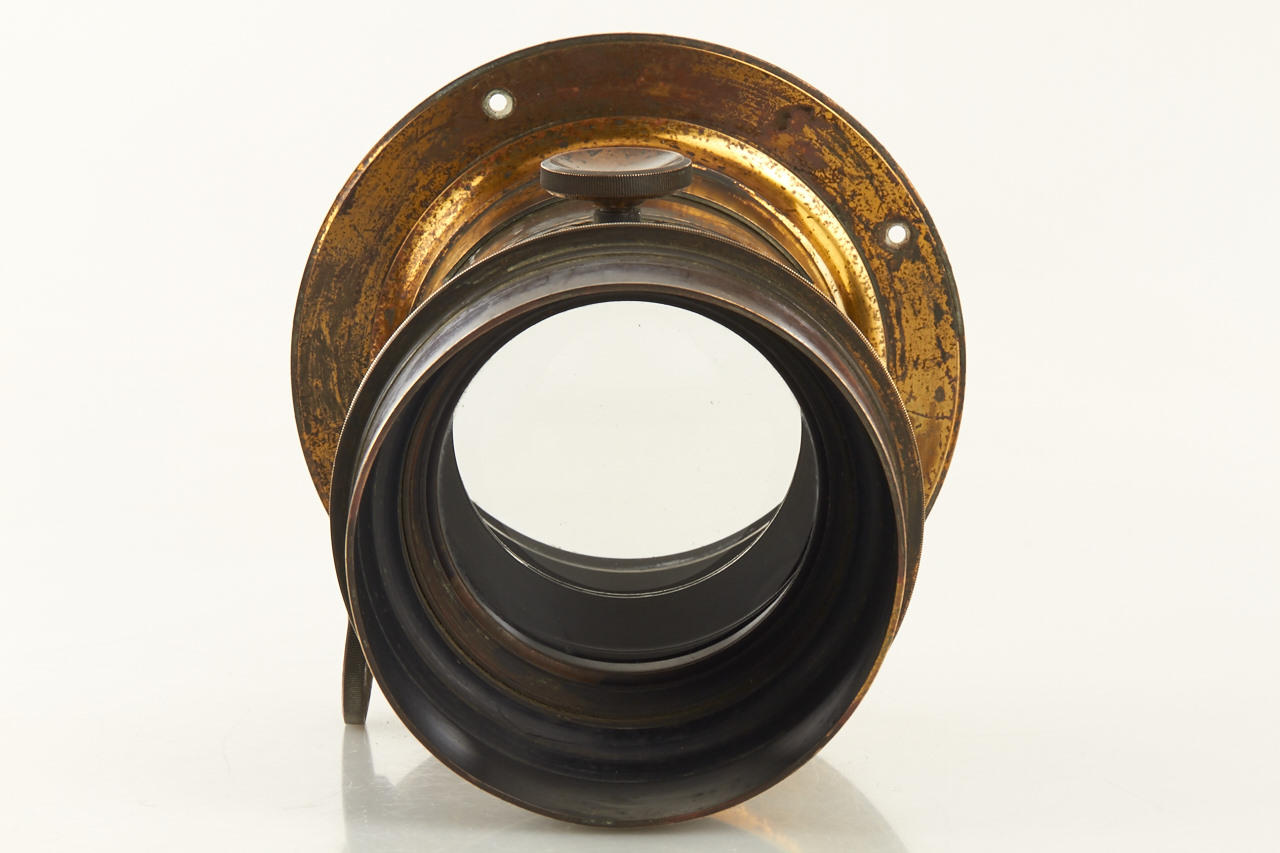 early Busch lens in original condition, good optics, focal length approx. 35cm, front and rear element diameter c.7.5cm, total height c.20cm, with mounting ring and brass front cap