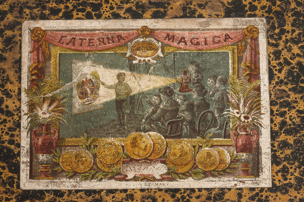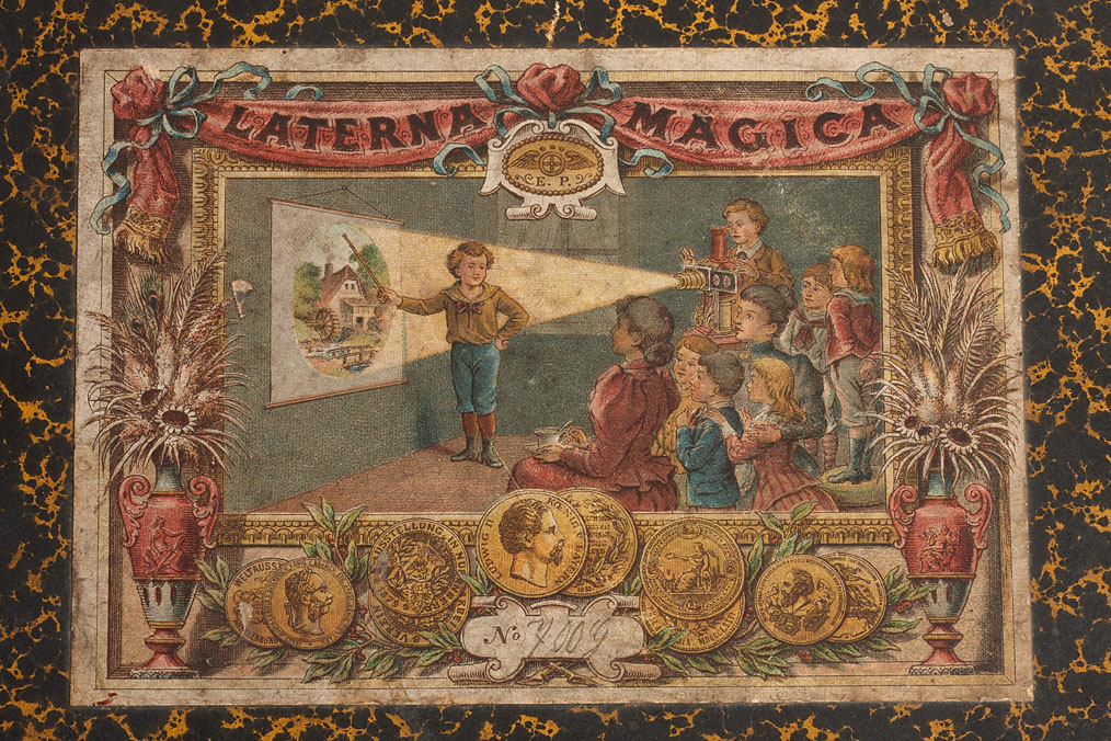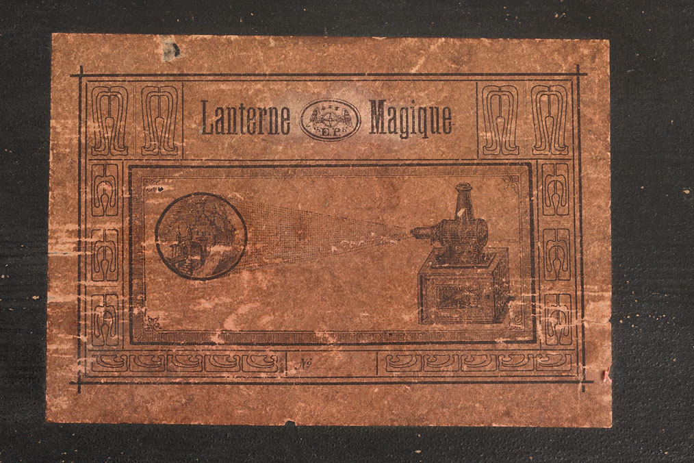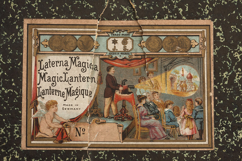 seven empty boxes for lanterns by different makers, (1) large wooden box for a Ernst Plank lantern, nice label with two boys making a Magic lantern show with a Climax projector, 28x15x24cm, (2) fitted wooden box covered with black faux leather box for a Ernst Plank export lantern, nice black and white label with a barrel-shaped Magic lantern projecting the image of a castle, with French instructions, 28x12x20cm, (3, 4) two wooden boxes, both covered with yellow-black Marbled paper for a Ernst Plank lantern, nice printed labels depicting a Magic lantern show, printed instructions on the inside, 21x11x21cm and 25x8x16cm, (5) large wooden box for the Gebrüder Bing 'Cinematograph', yellow-black Marbled paper, very nice Art deco label showing three children projecting the companies logo with a Magic lantern, 25x16x24cm, (6) large cardboard box covered with green-blue Marbled paper, for a Jean Schoenner lantern, printed label depicting a Magic lantern show, the lid torn, 35x14x24cm, (7) large wooden box for a Ernst Plank lantern, the label is faded, 31x16x24cm. Although all the boxes show some ware this is the perfect opportunity to complete a Magic lantern collection