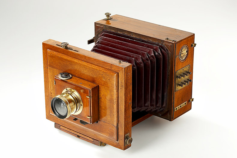 13x18cm, dry-plate, polished walnut body, integral magazine for 8 plates, slot and pin mechanism plate position selector with a Rapid Rectilinear brass bound lens, a scarce folding camera manufactured by Prevel and retailed by Enjalbert