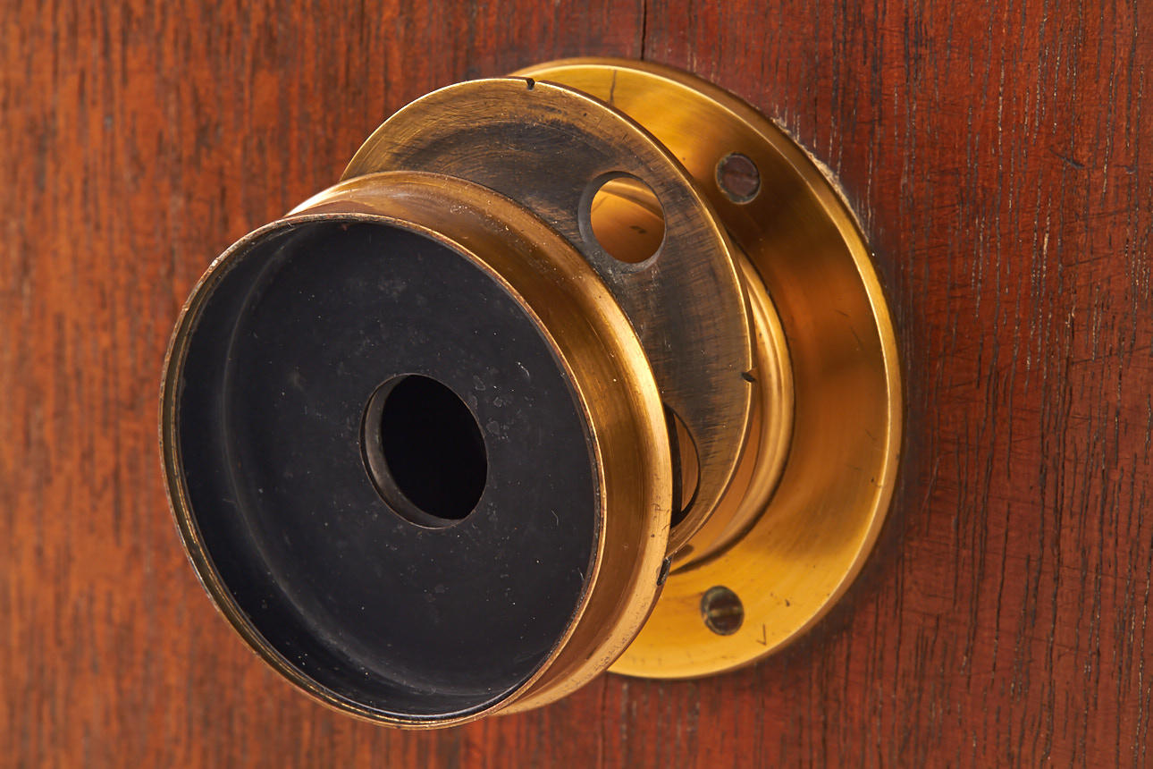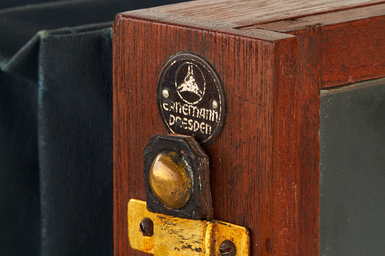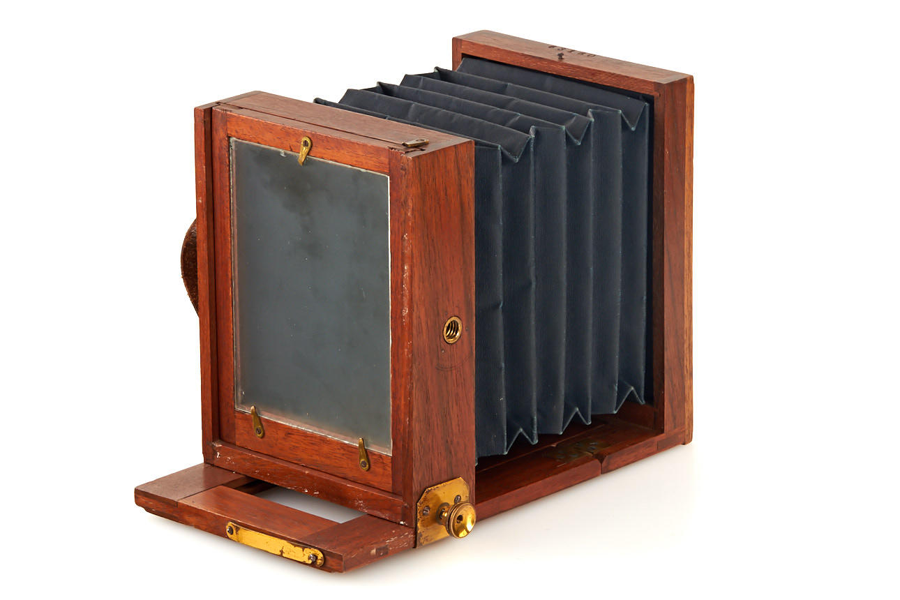 9x12cm, very rare camera with walnut body, green bellows, simple Achromat lens with built-tin rotating aperture disc, in fine condition, minor flaws in the wood