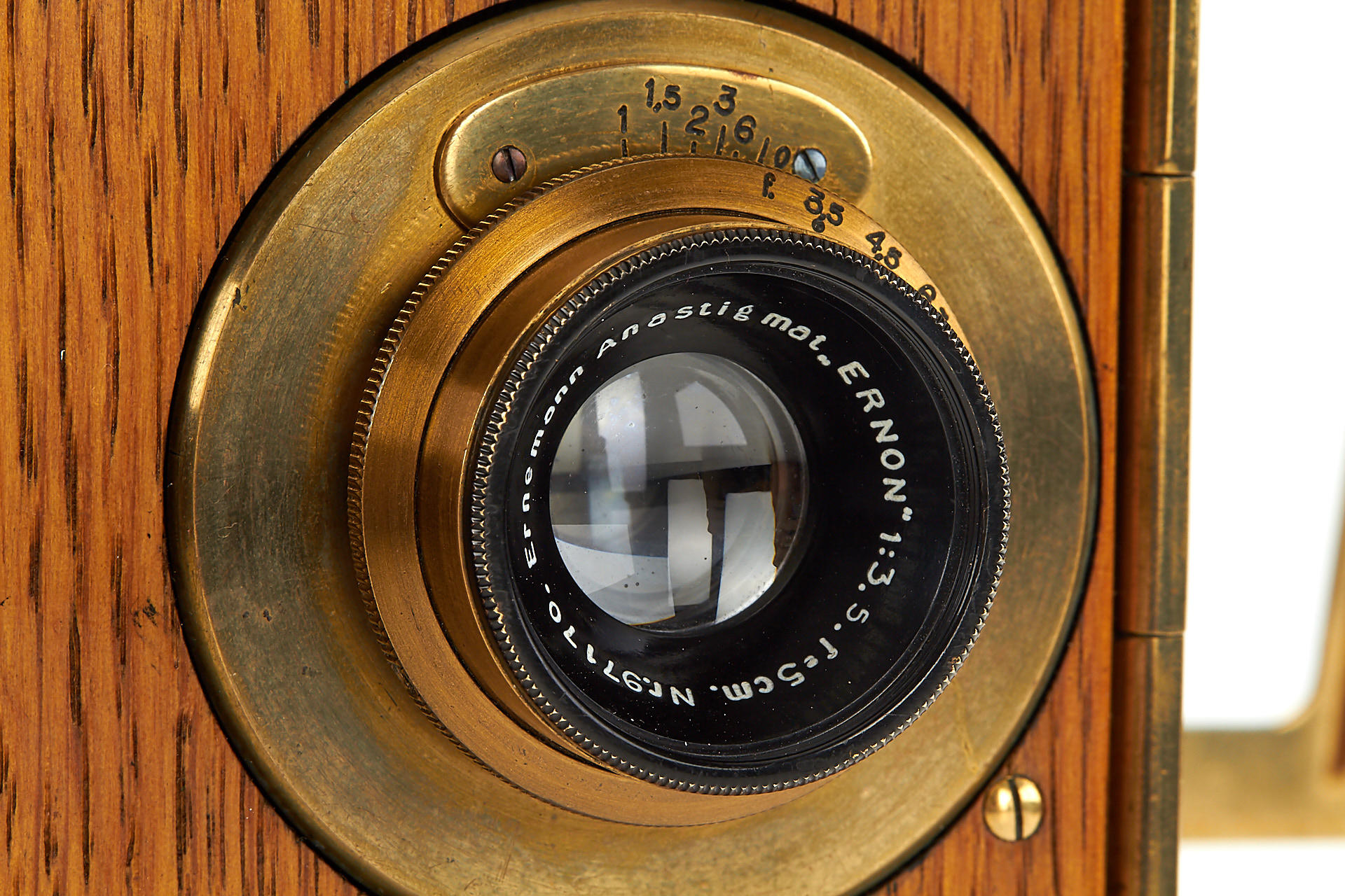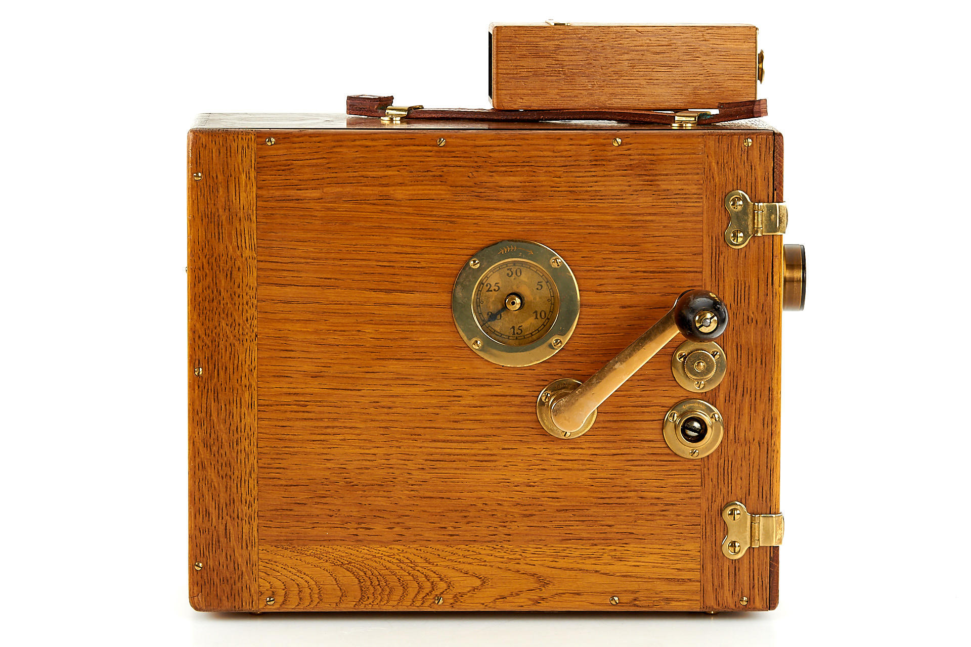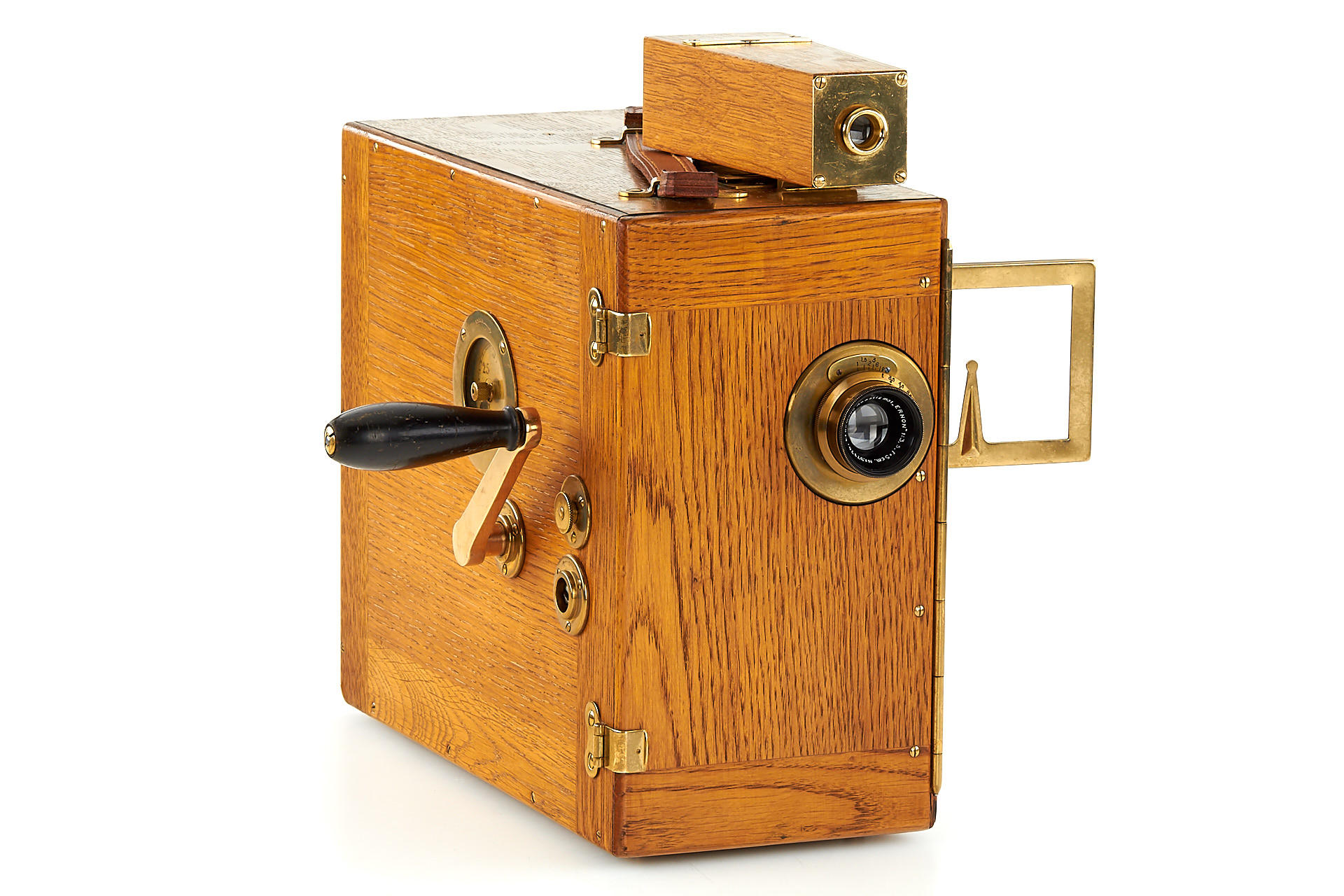 early wooden hand-cranked 35mm motion picture camera, in beautiful cosmetic condition (completely restored) and in good working order, with Ernon 3.5/5cm no.97170, crank, finder, 4 cassettes, cap