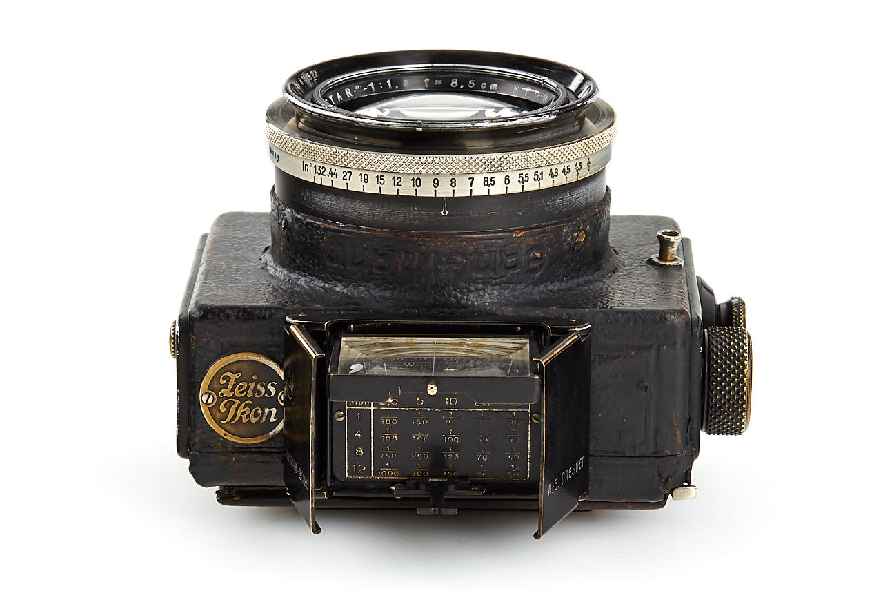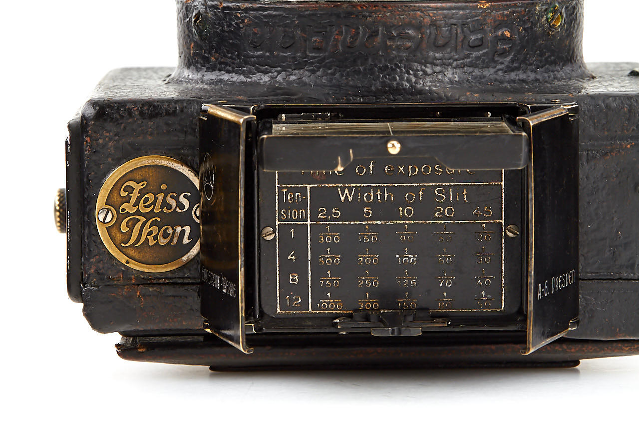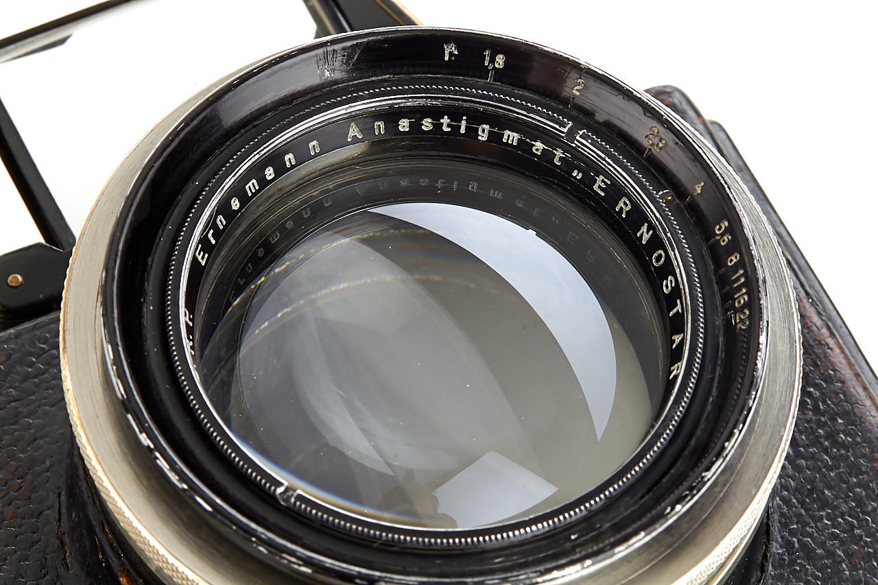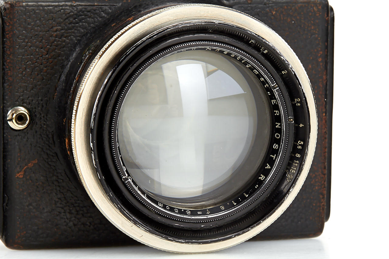 late export version rigid-body Ermanox in fine condition, focusing scale in feet, English exposure table, Zeiss Ikon badge mounted on top, in good condition (shutter not operable, as usual), with Ernostar 1.8/8.5cm no.1109182