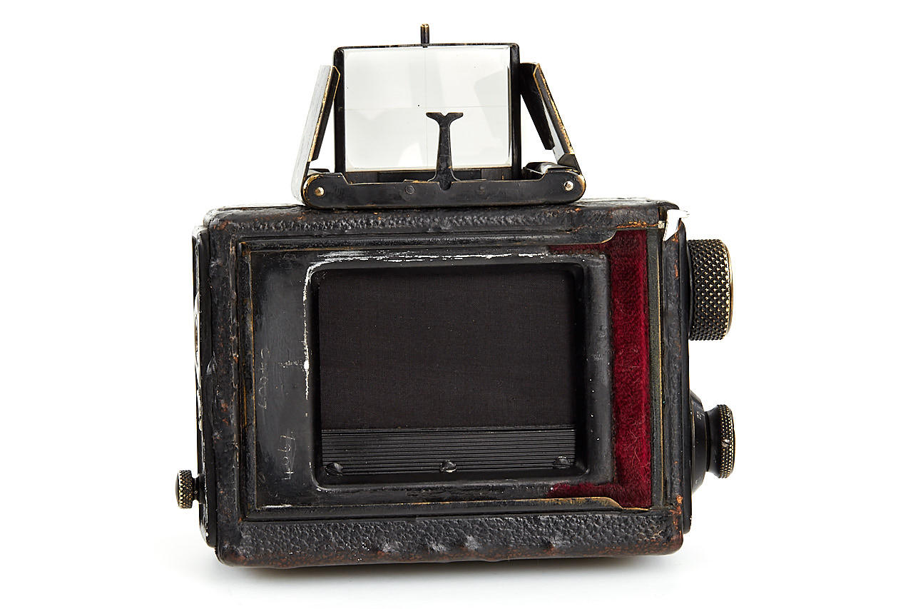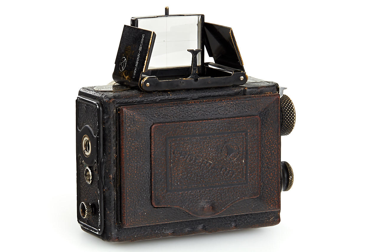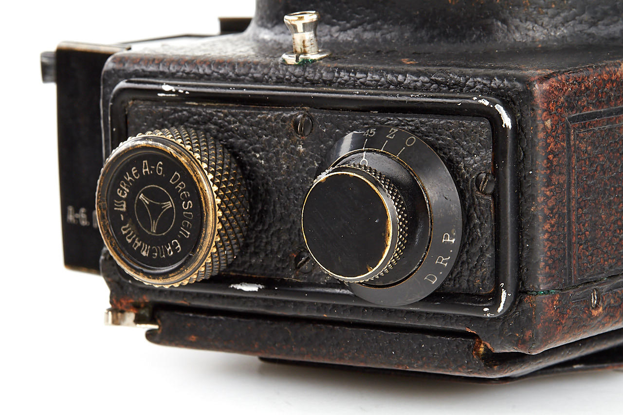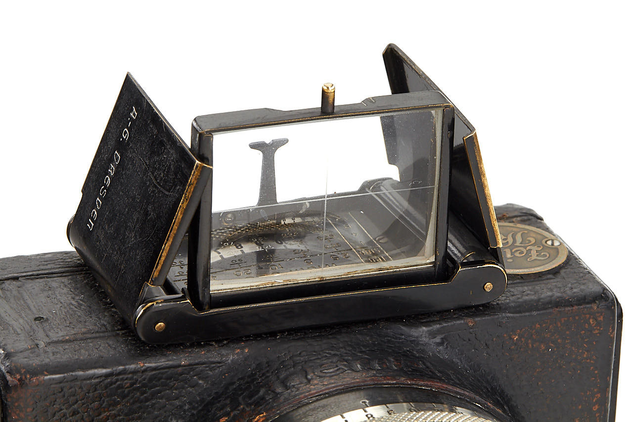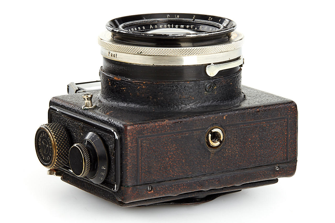 late export version rigid-body Ermanox in fine condition, focusing scale in feet, English exposure table, Zeiss Ikon badge mounted on top, in good condition (shutter not operable, as usual), with Ernostar 1.8/8.5cm no.1109182