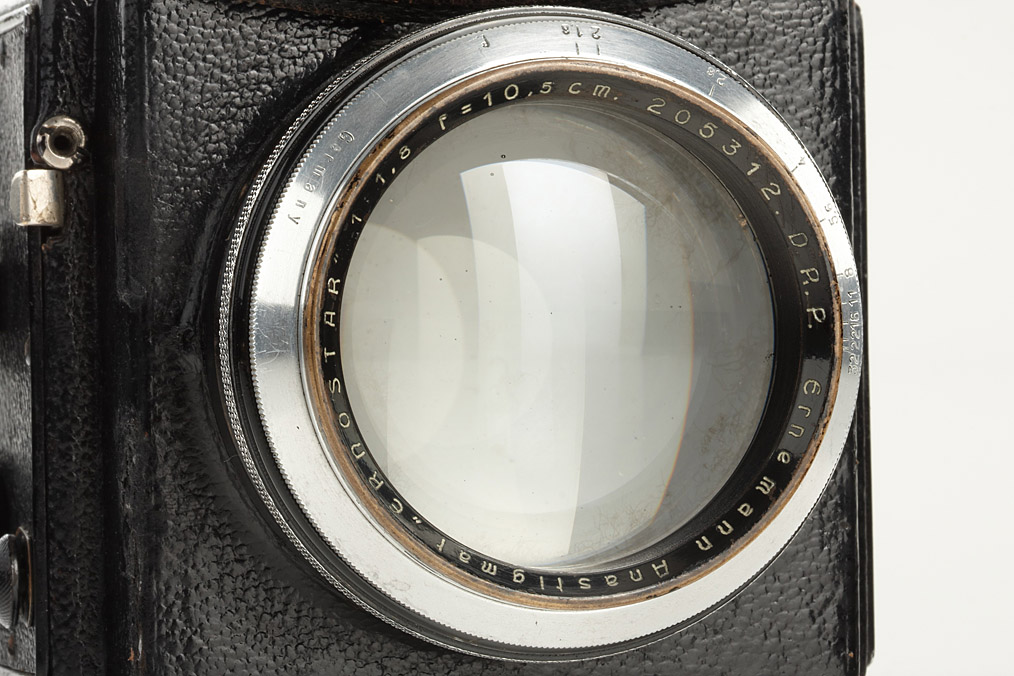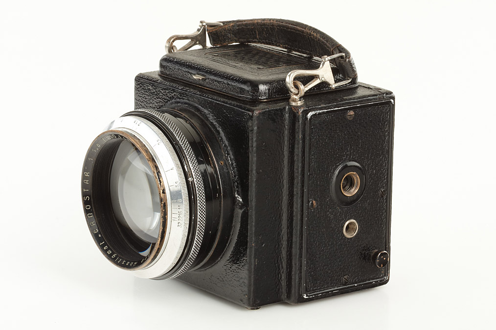 4.5x6cm, early and very rare SLR with Ernostar 1.8/10.5cm no.205312, focal plane shutter (working), in good original condition, strap, focusing screen adapter, fimpack holder, original leather case